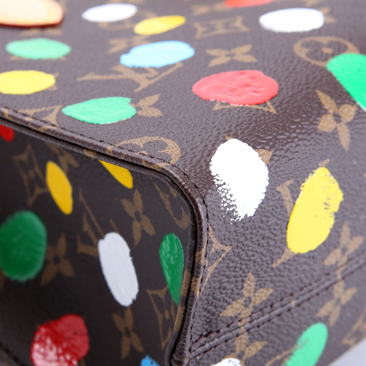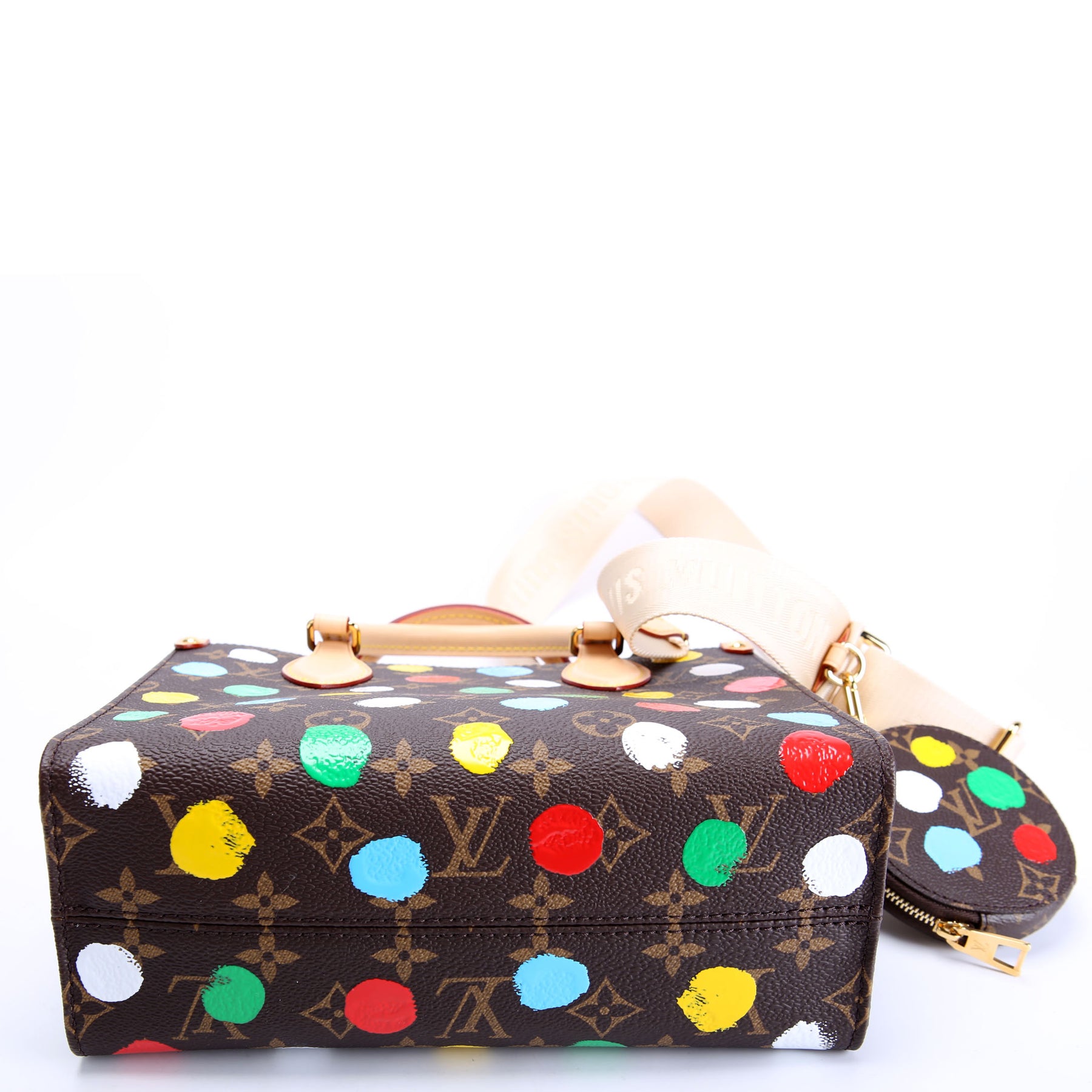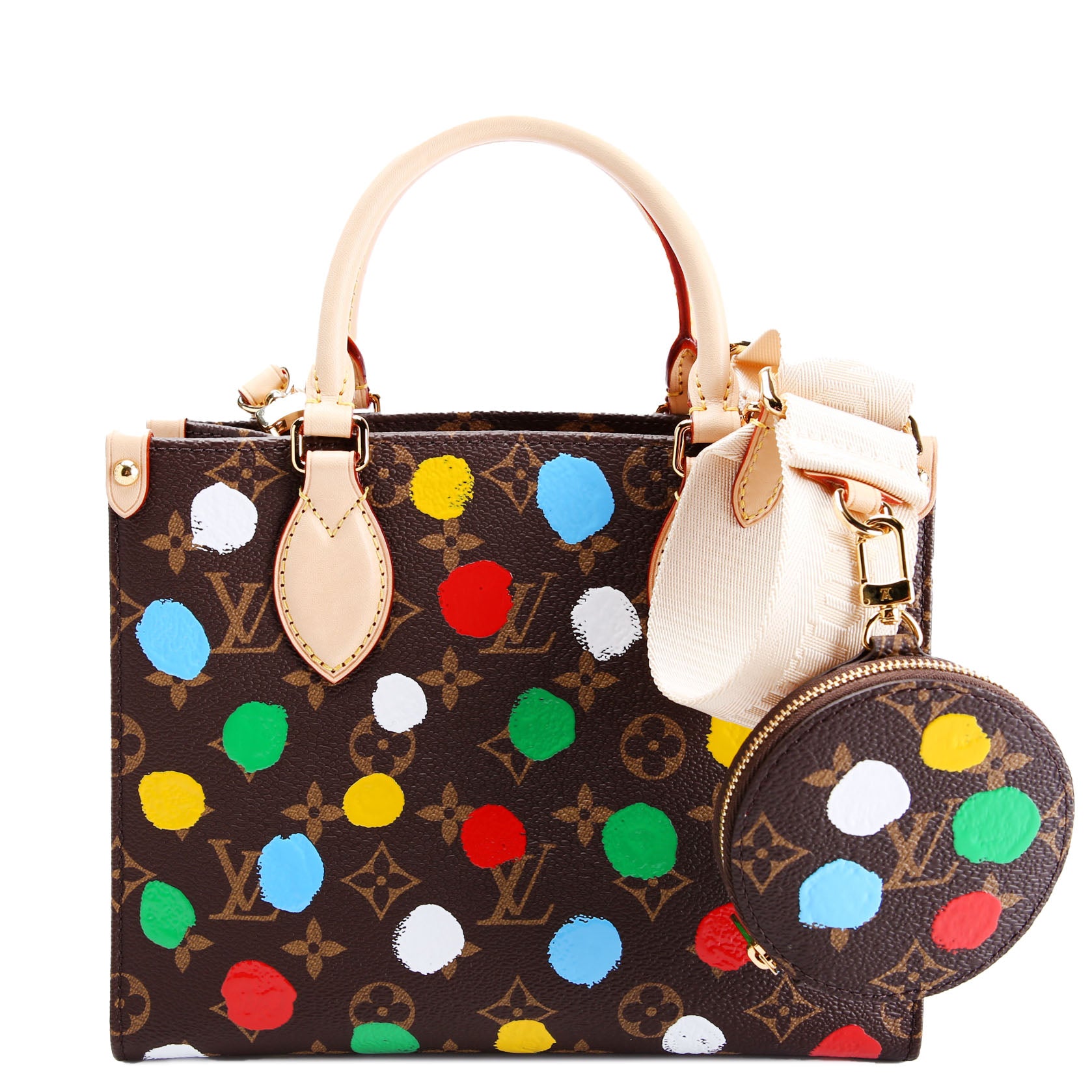 This pre-owned Louis Vuitton ONTHEGO PM Kusama Painted Dots is guaranteed 100% authentic. The exterior is in the classic Louis Vuitton Monogram coated canvas.