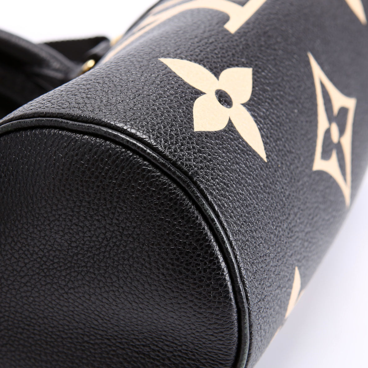 This pre-owned Louis Vuitton Papillon BB Bicolor is guaranteed 100% authentic. The exterior is in the classic Louis Vuitton Empreinte Leather