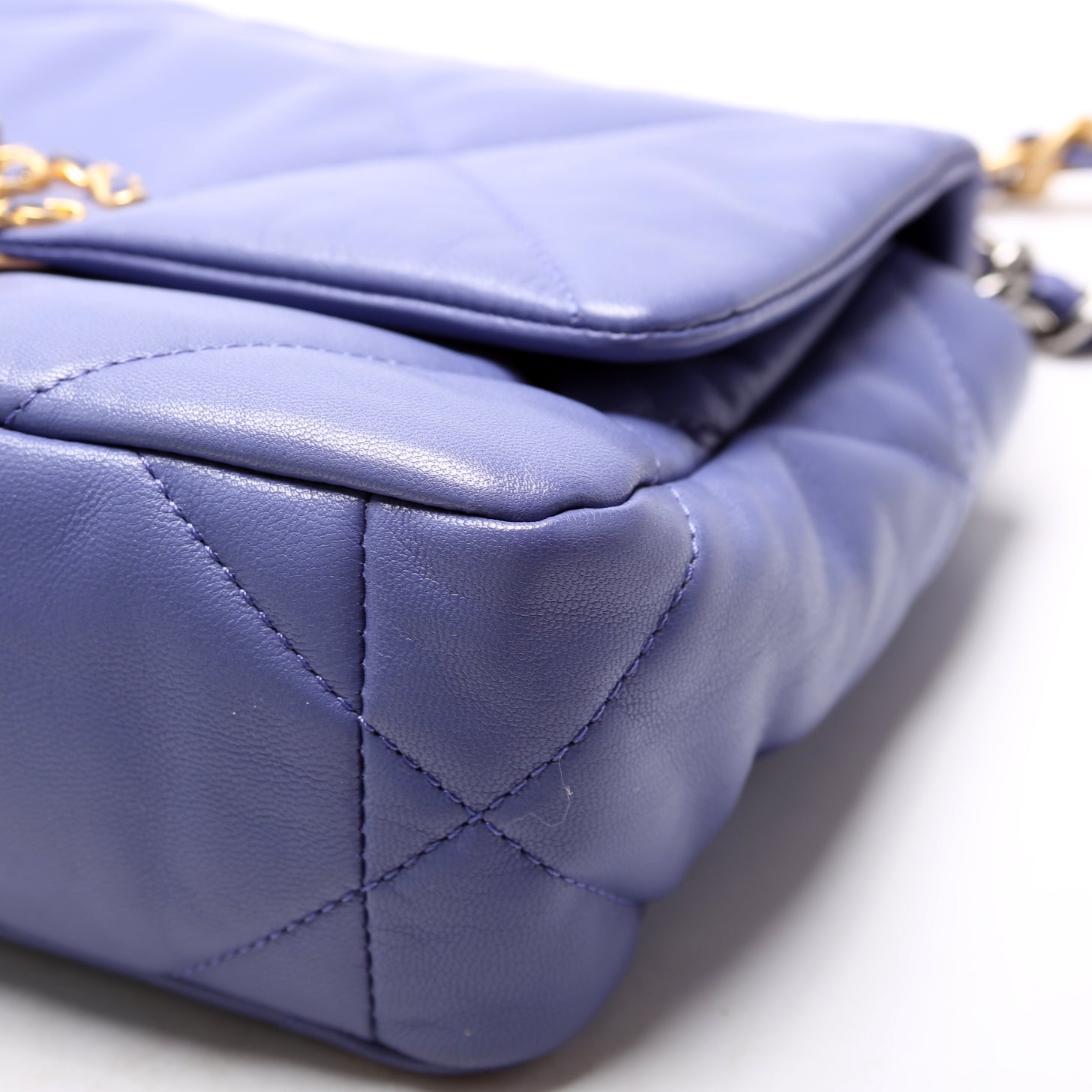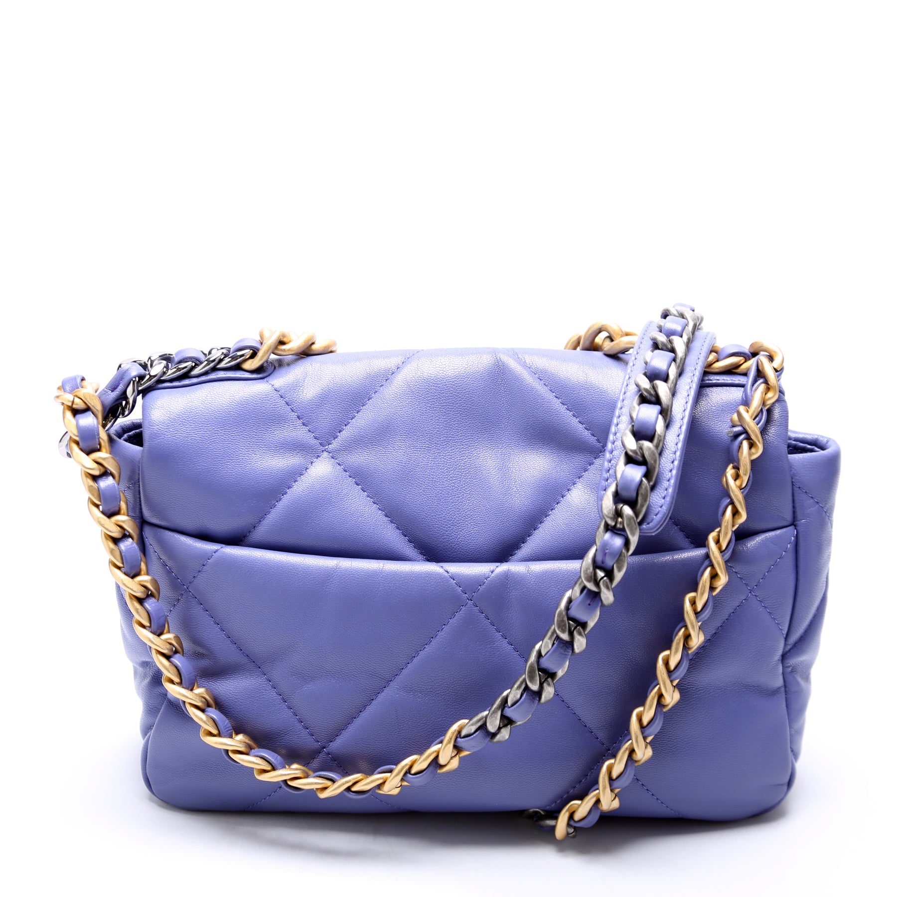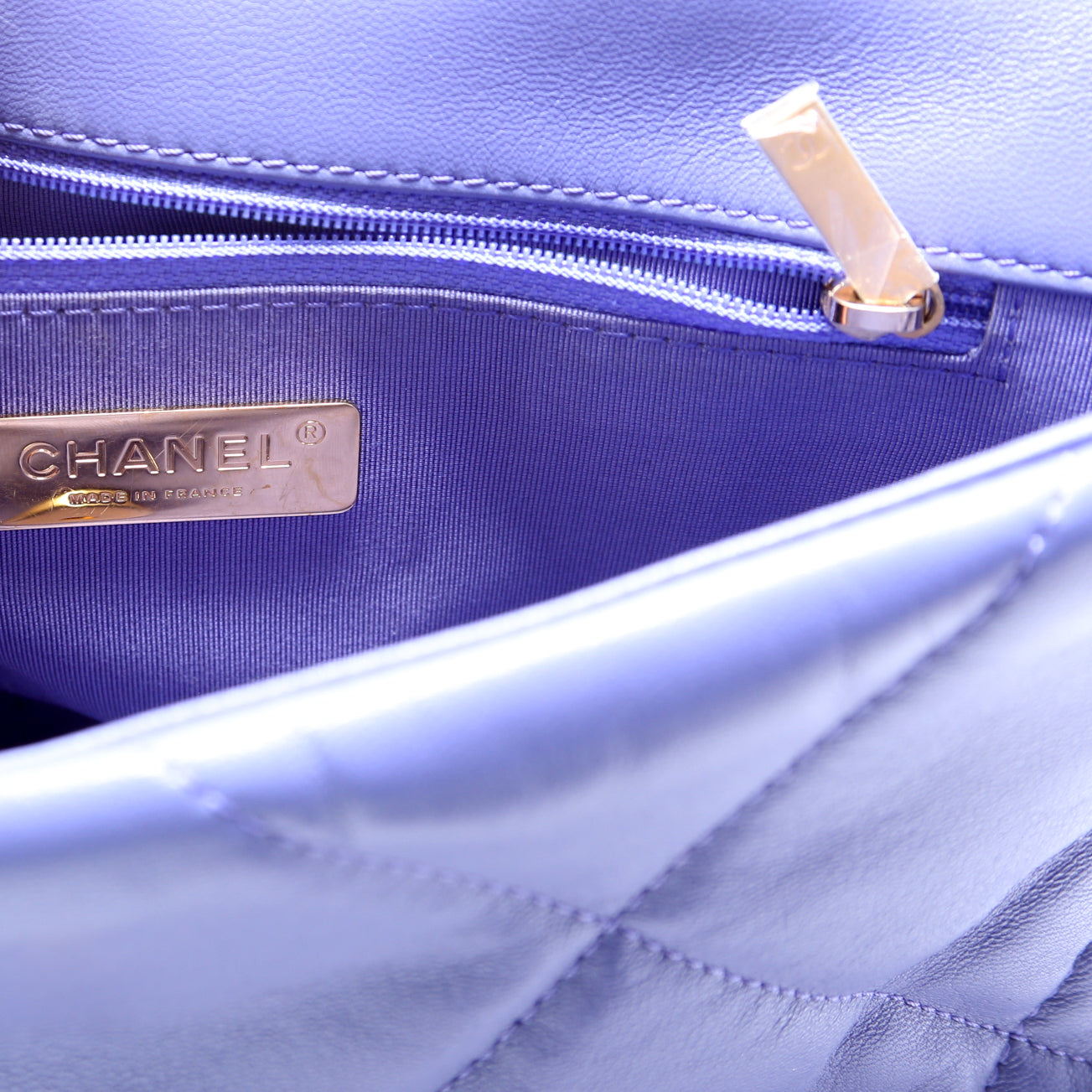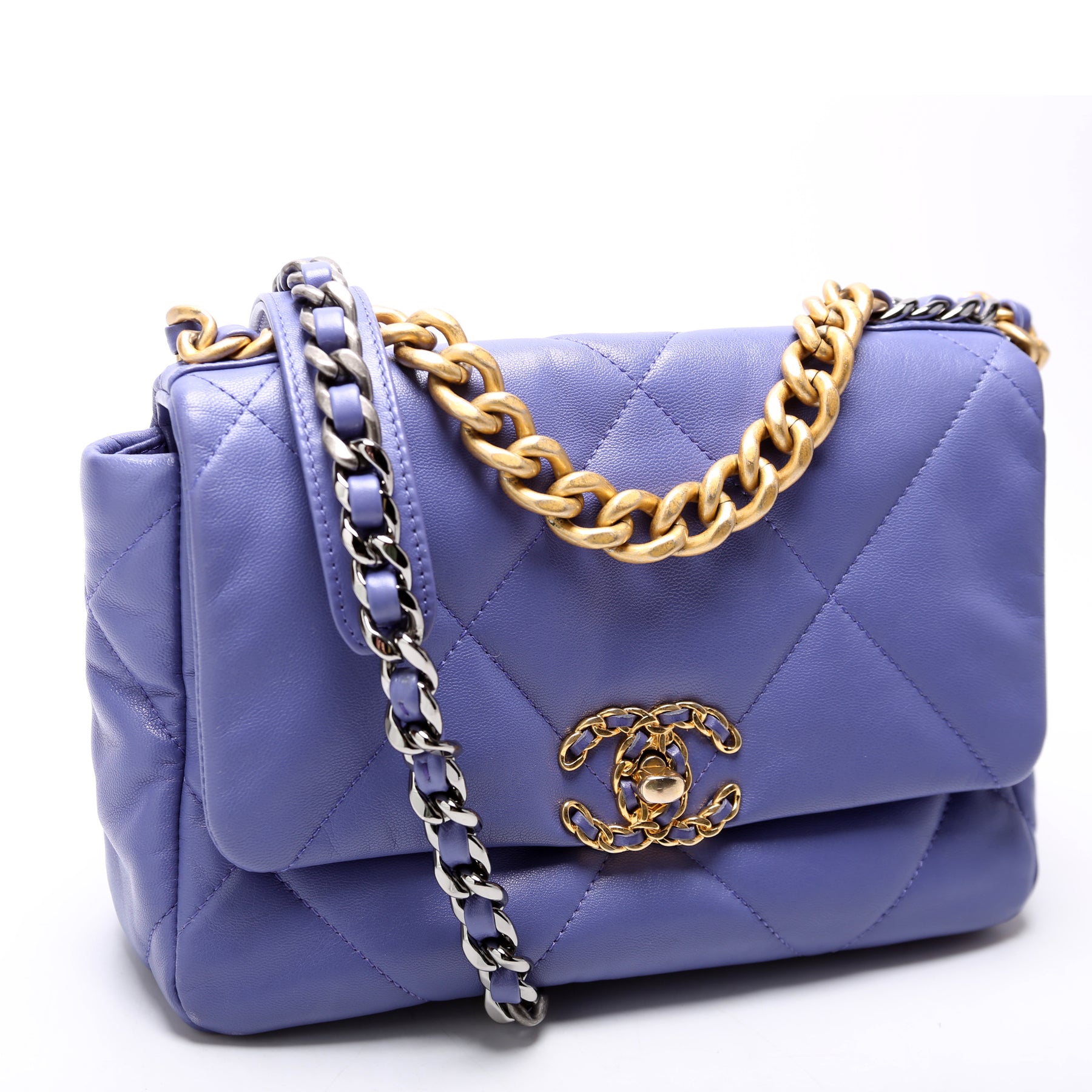 This pre-owned Chanel 19 Medium Flap is guaranteed 100% authentic. The exterior is in the classic Chanel Quilted Goatskin leather.