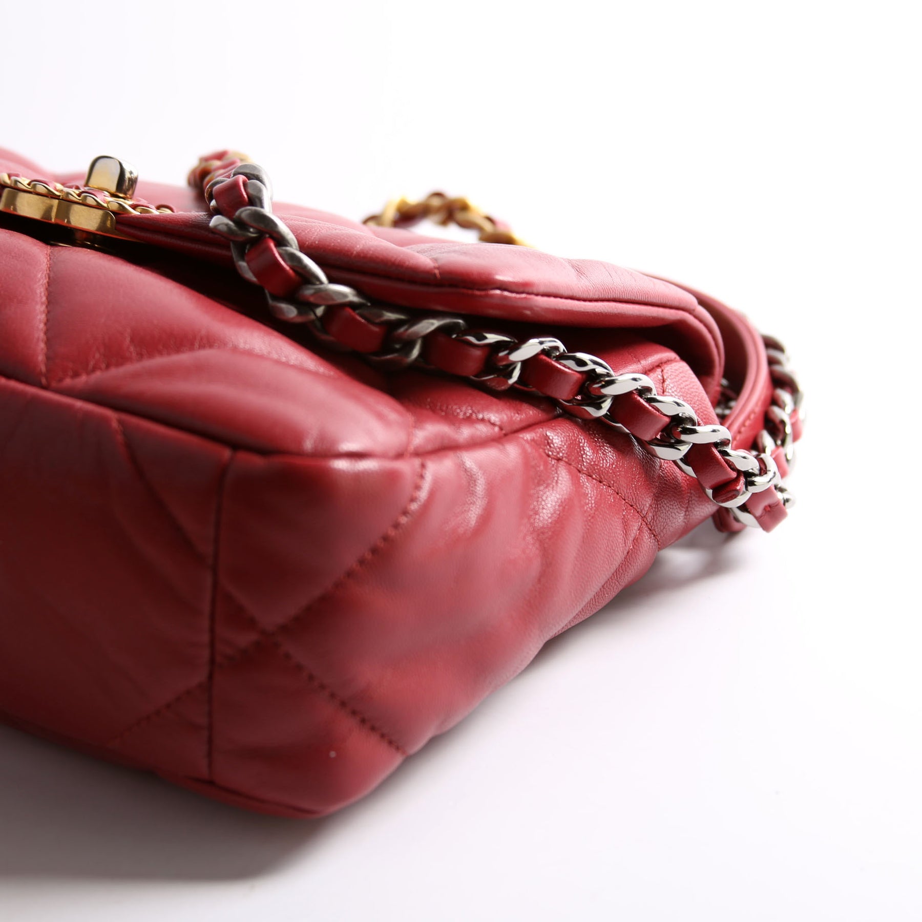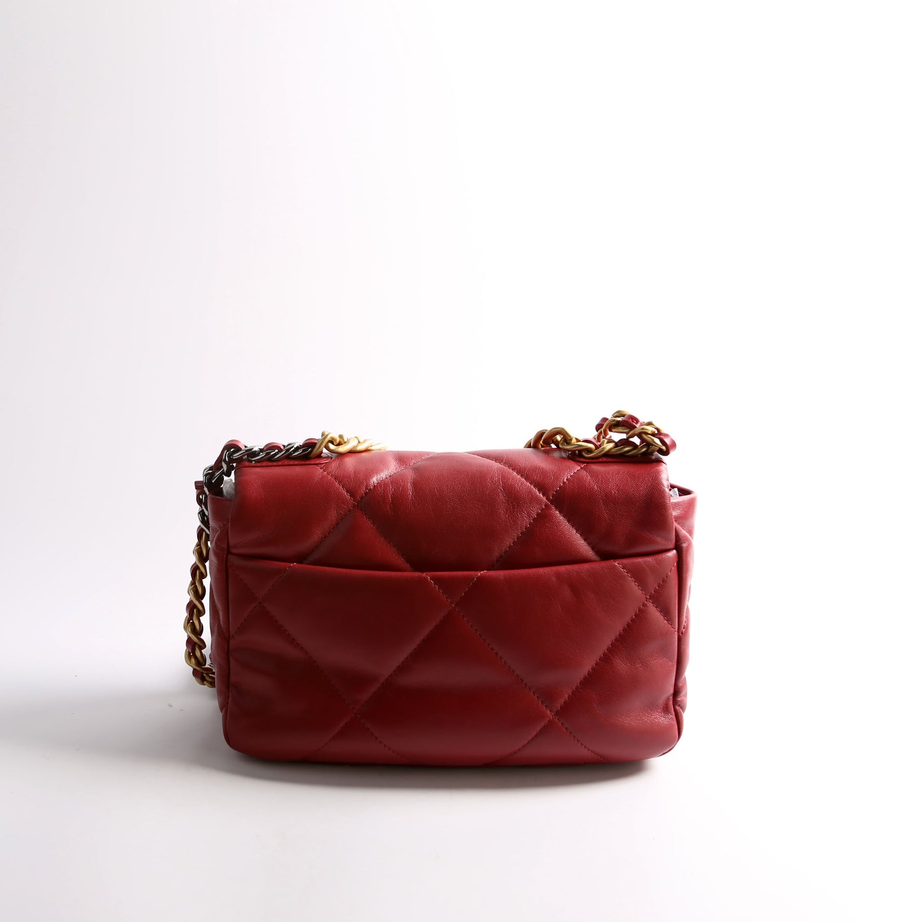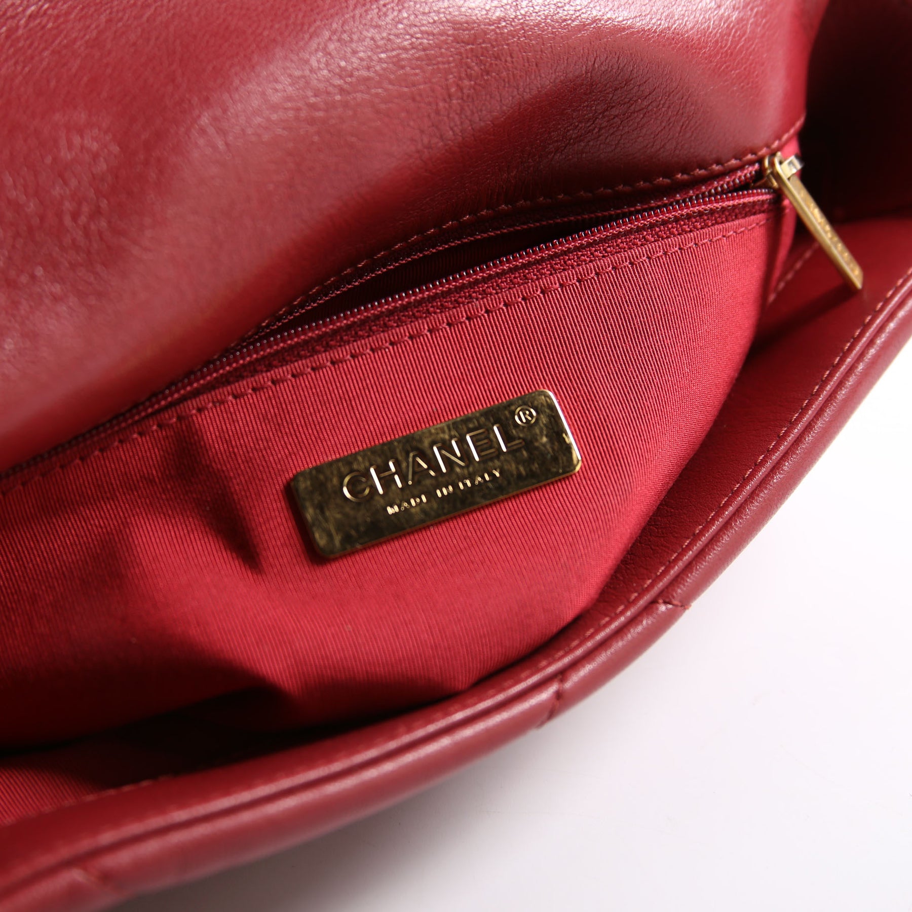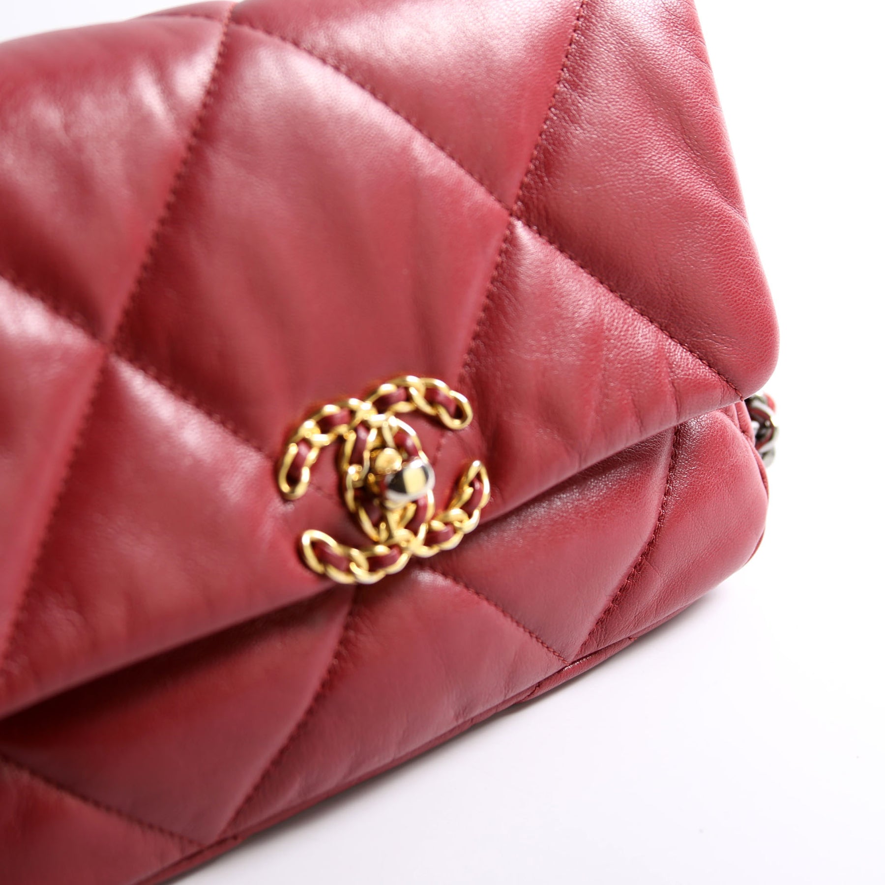 This pre-owned Chanel 19 Medium Flap is guaranteed 100% authentic. The exterior is in the classic Chanel Quilted Goatskin leather.