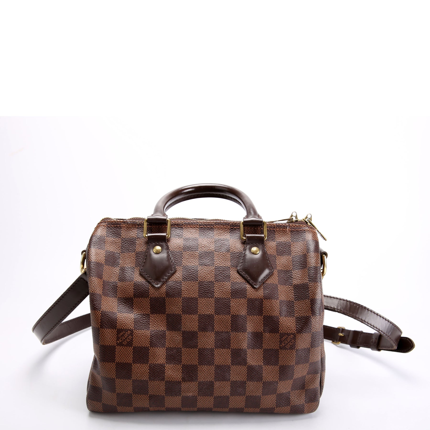 This pre-owned Louis Vuitton Speedy 25 Bandouliere is guaranteed 100% authentic. The exterior is in the classic Louis Vuitton Damier Ebene coated canvas.