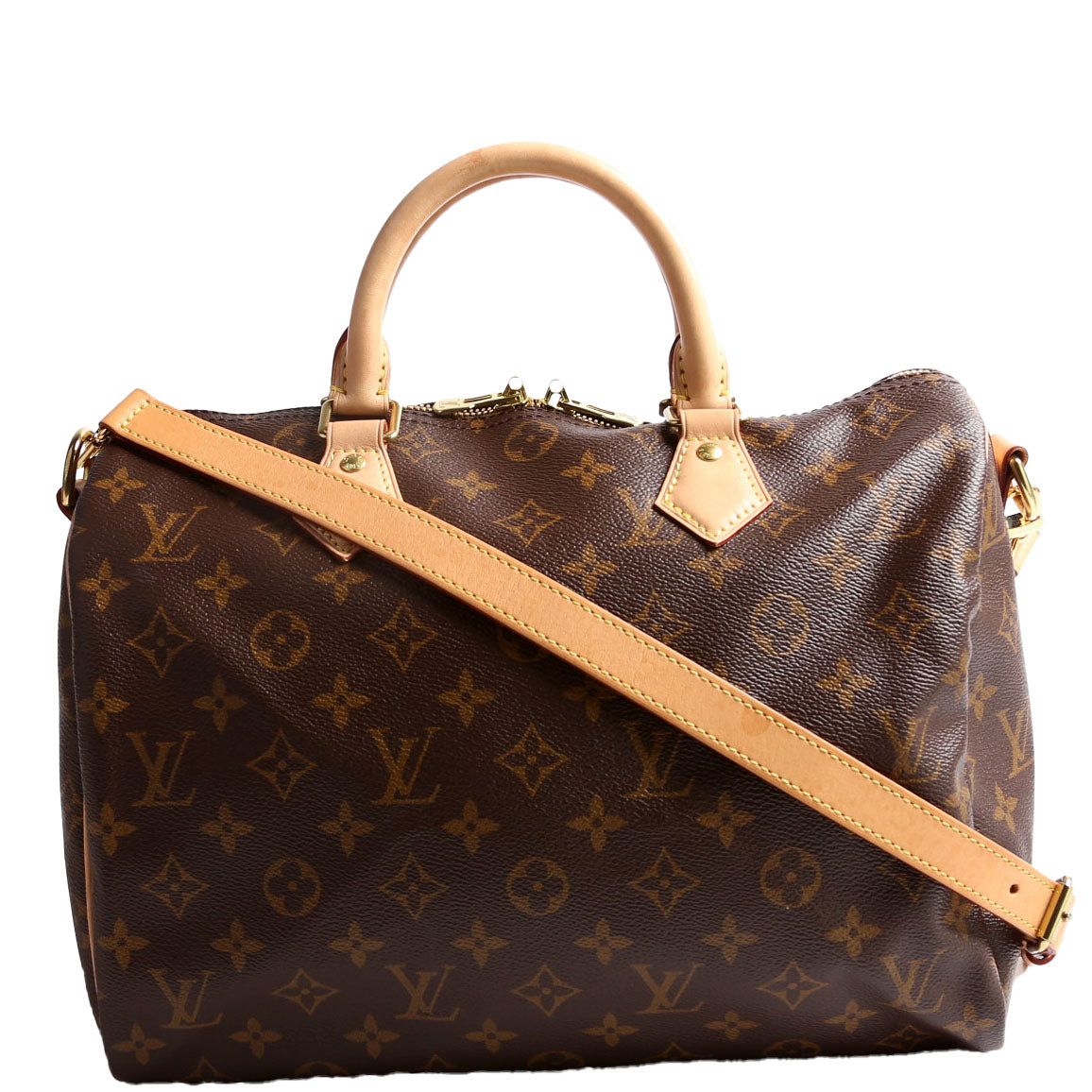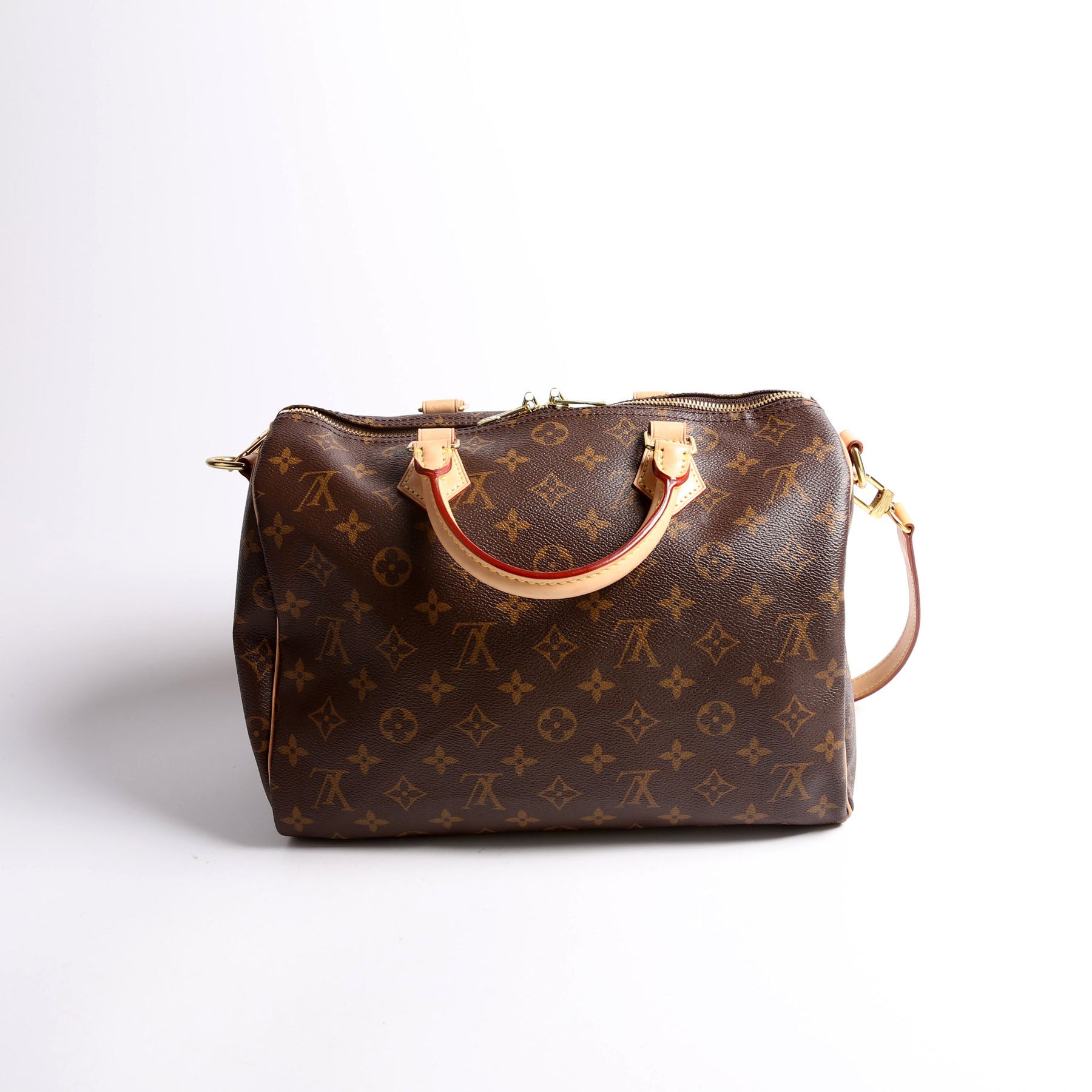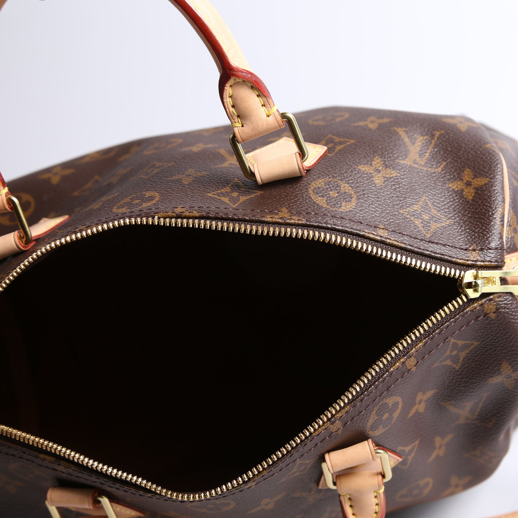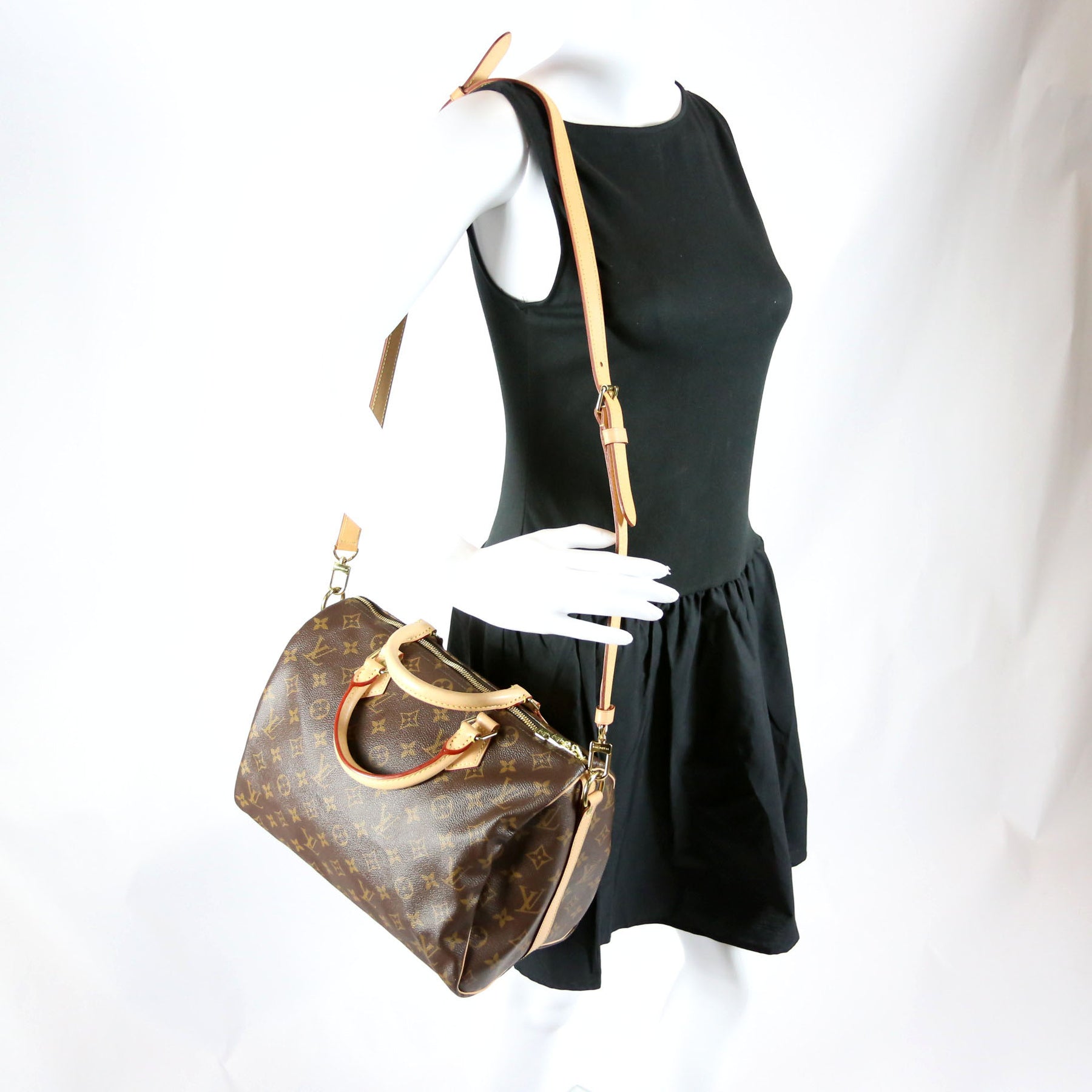 This pre-owned Louis Vuitton Speedy 30 with a strap is guaranteed 100% authentic. The exterior is in the classic Monogram canvas.