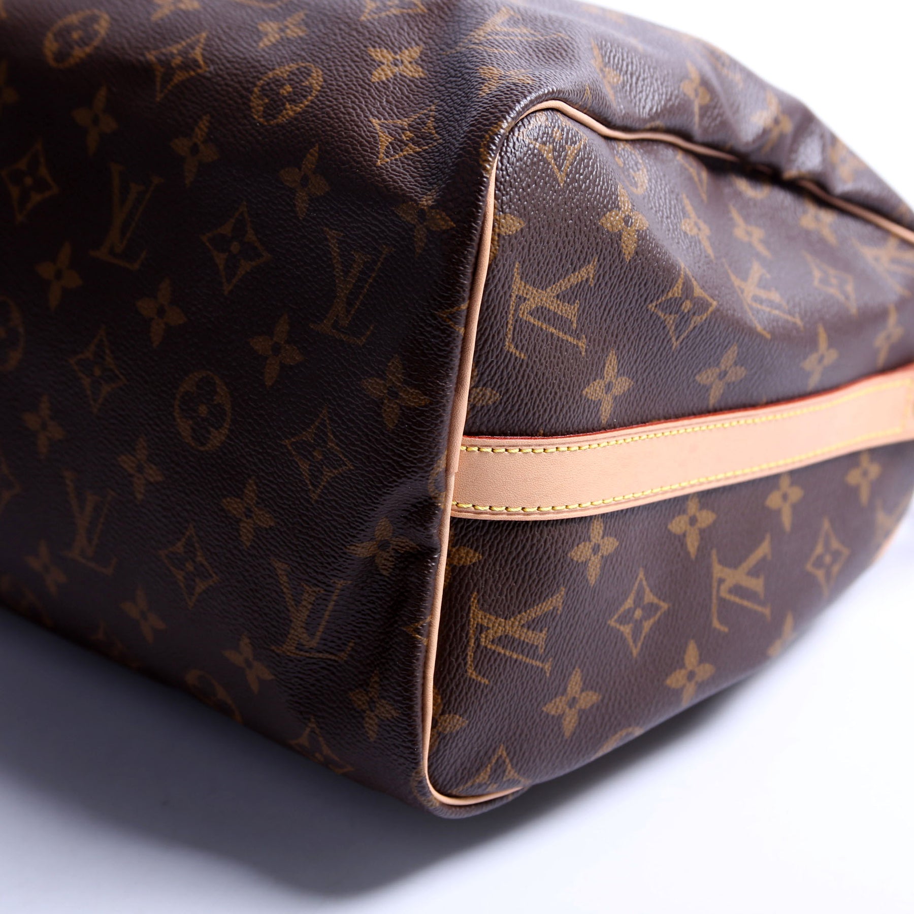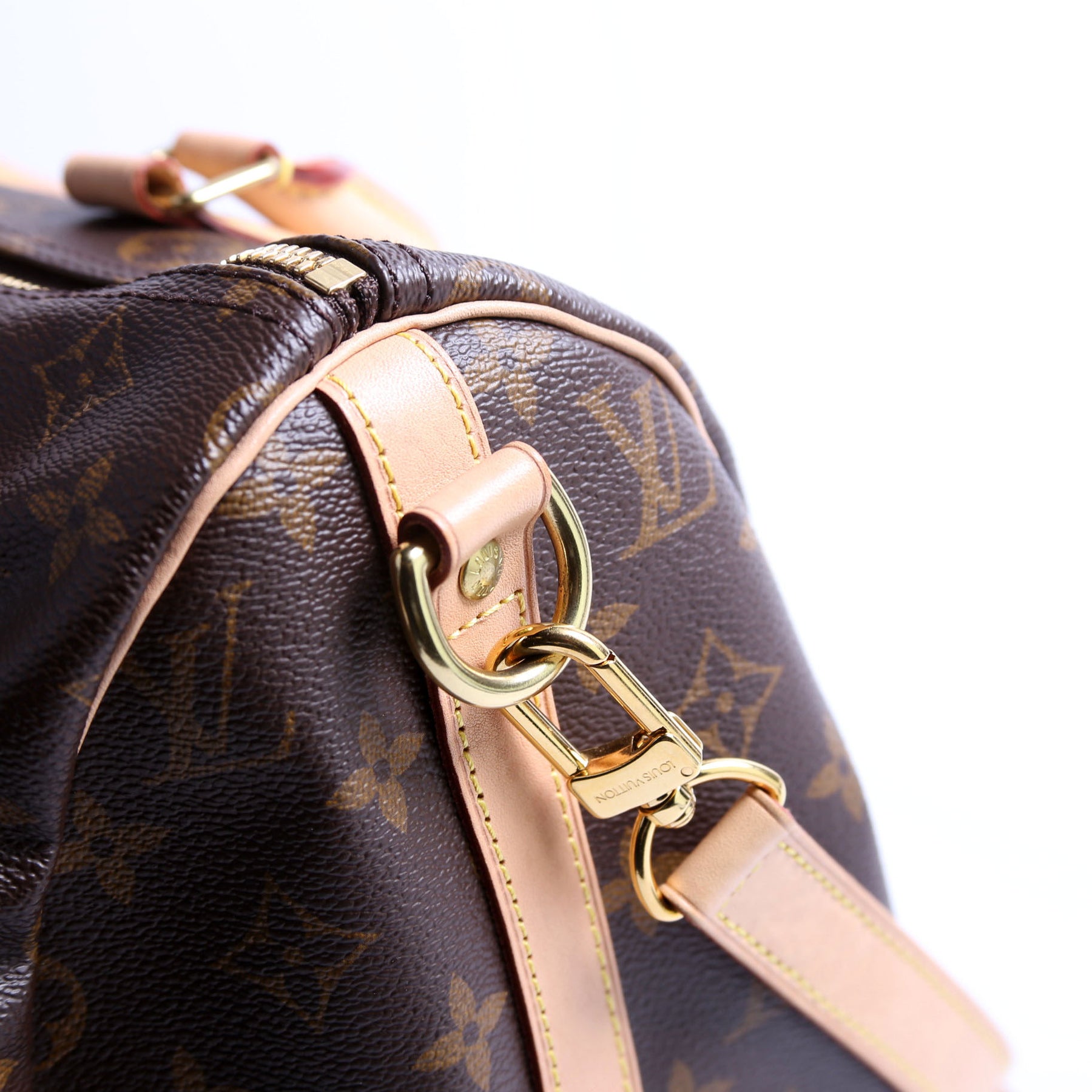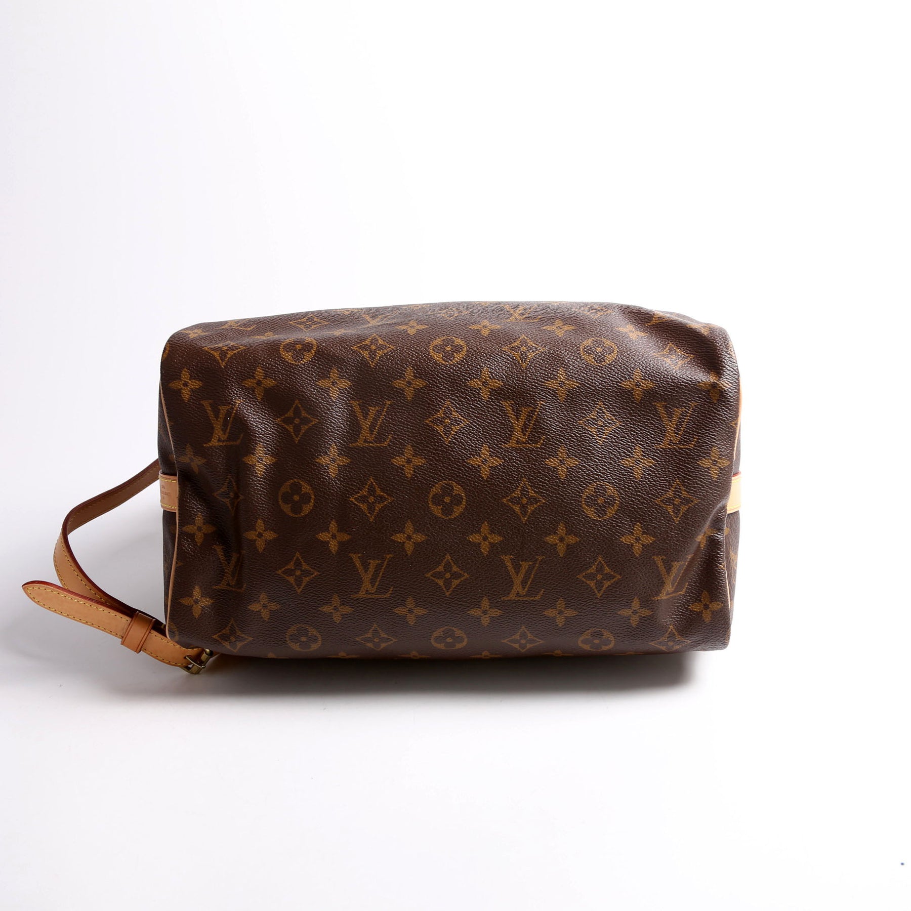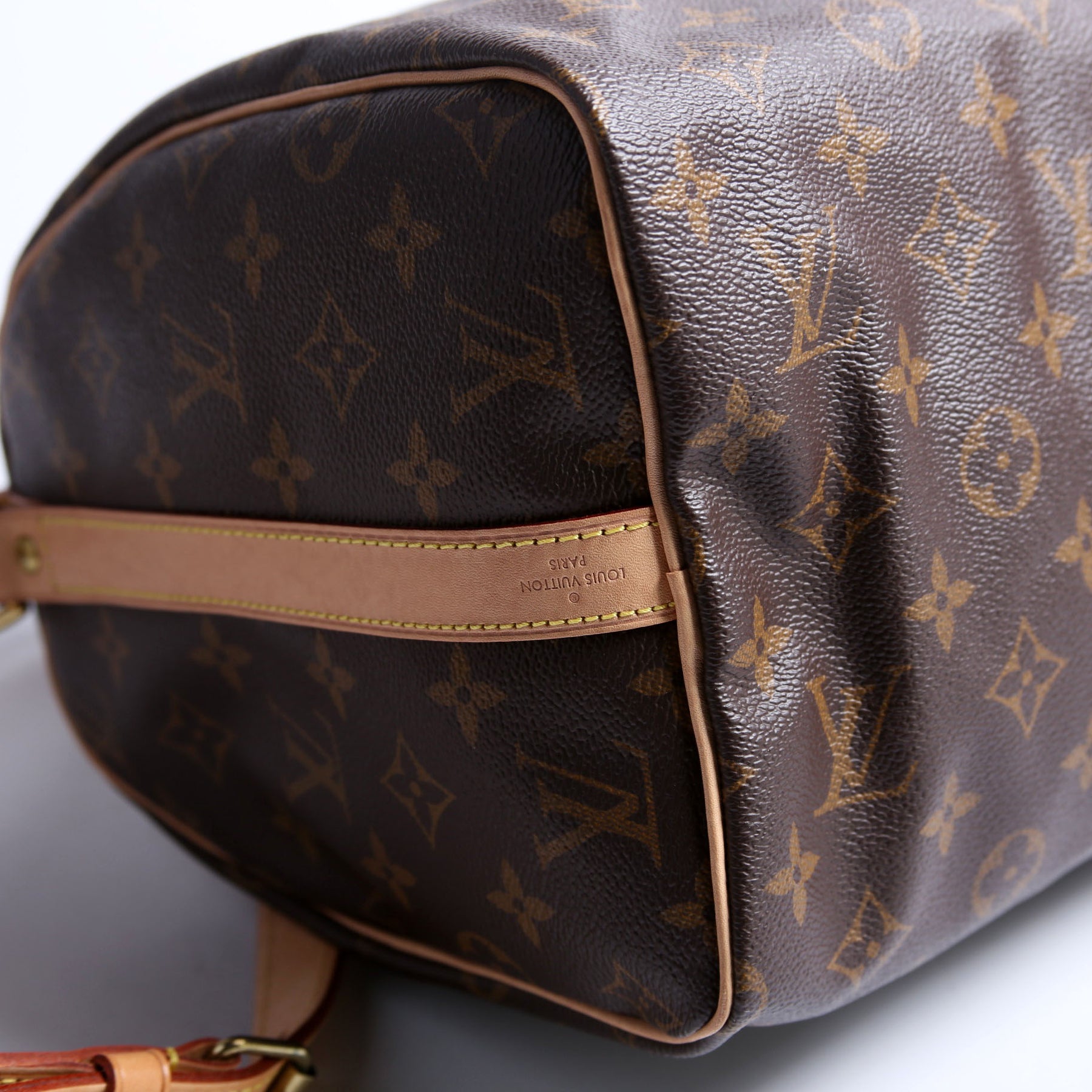 This pre-owned Louis Vuitton Speedy 30 with a strap is guaranteed 100% authentic. The exterior is in the classic Monogram canvas.