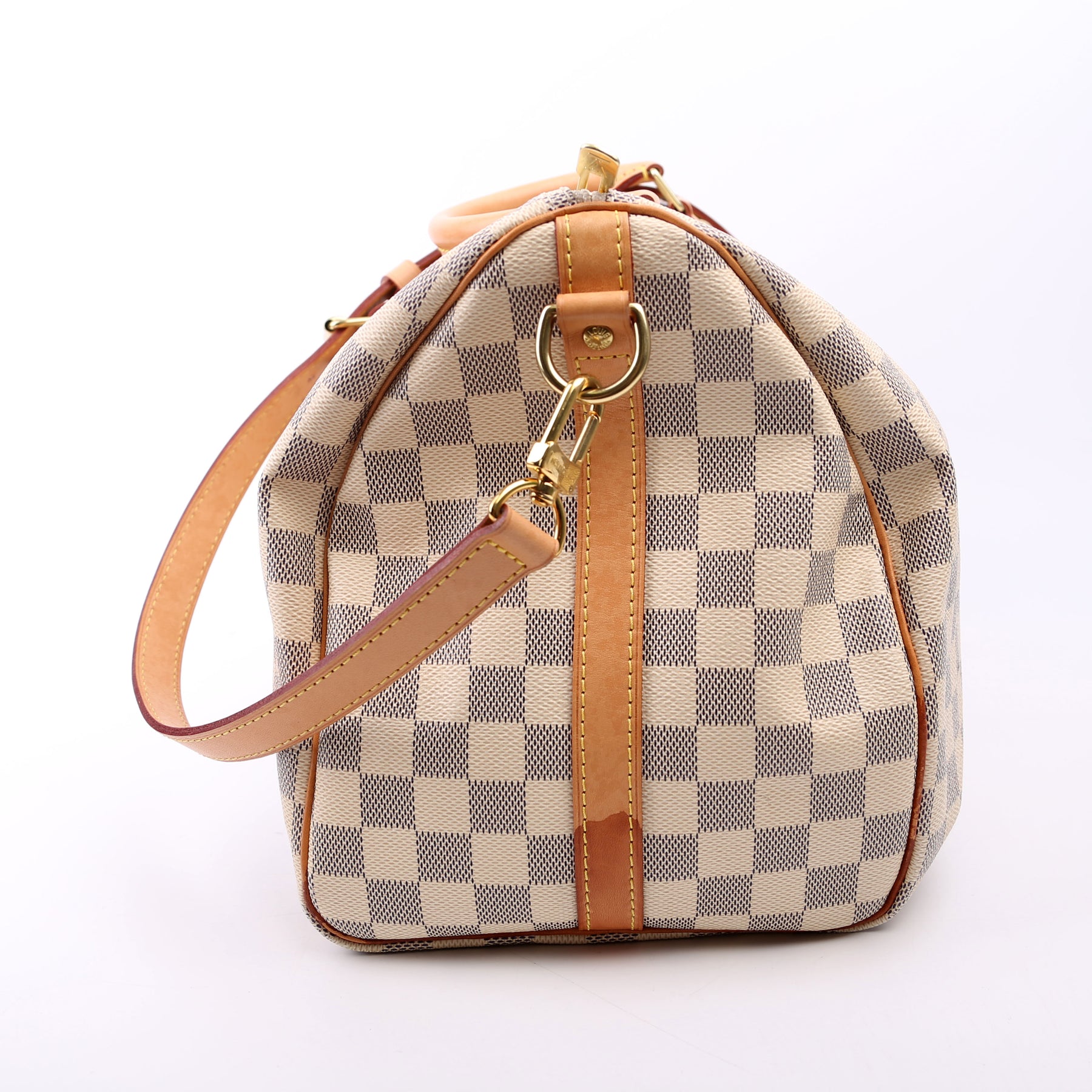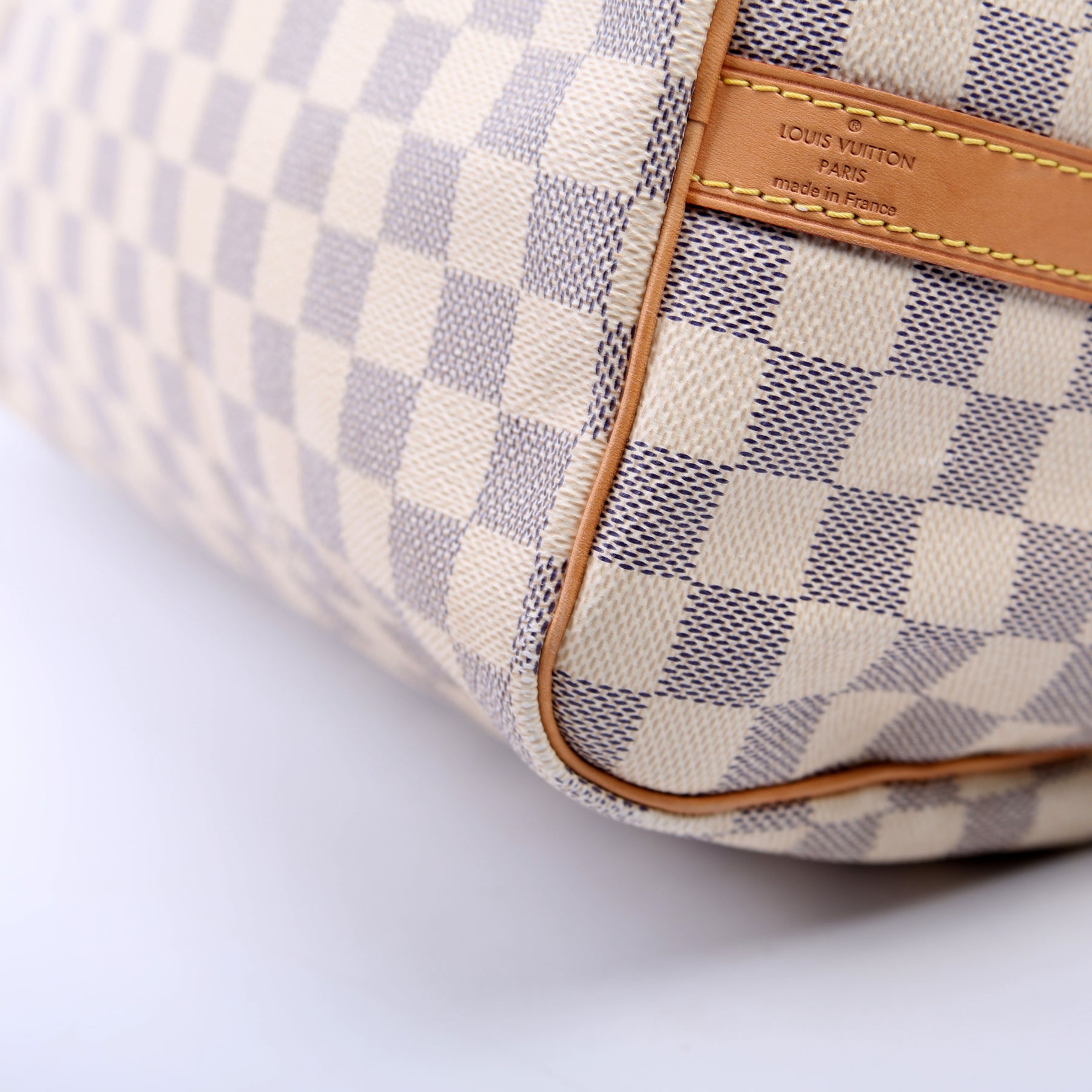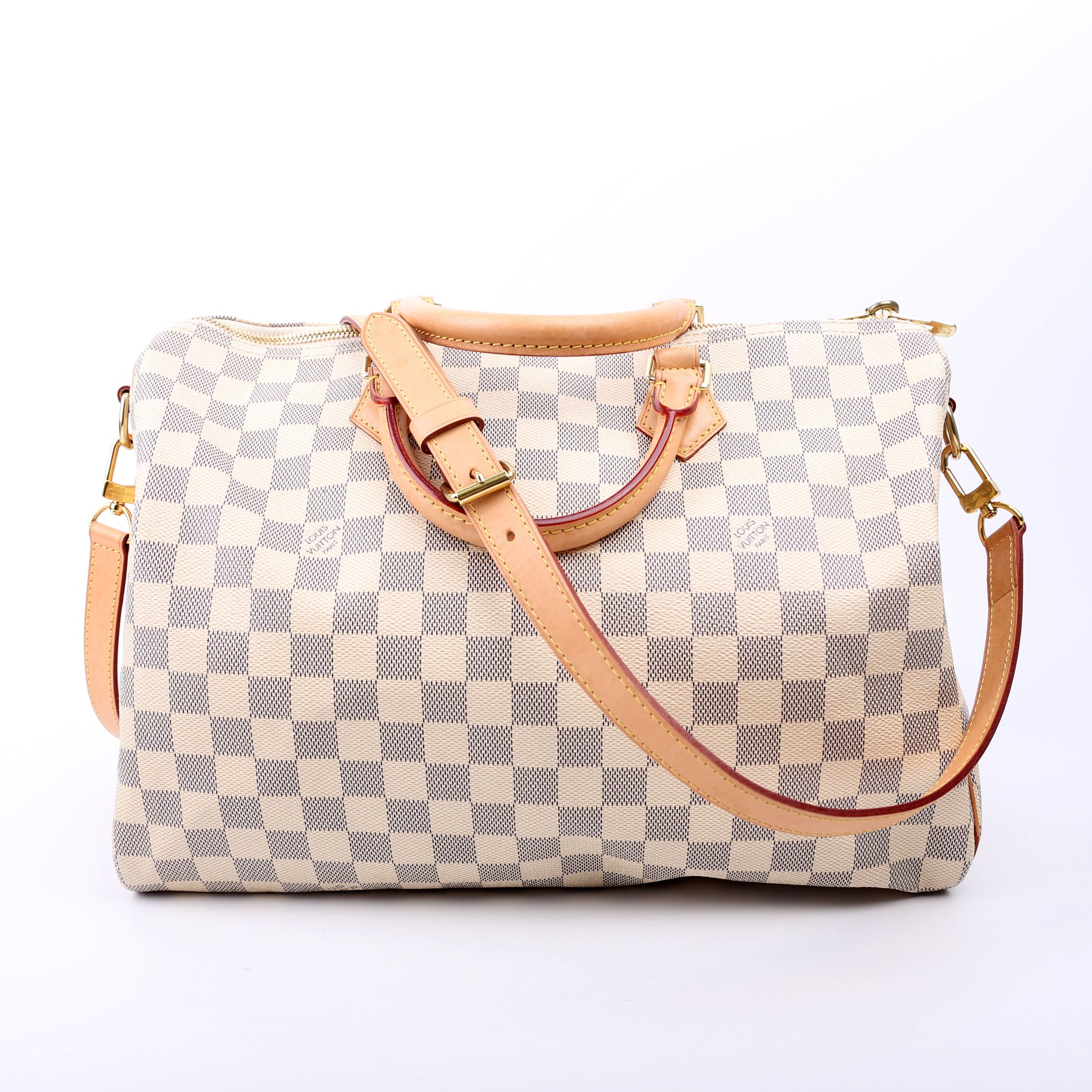 This pre-owned Louis Vuitton Speedy 35 W/Strap is guaranteed 100% authentic. The exterior is in the classic Louis Vuitton Damier Azur coated canvas.