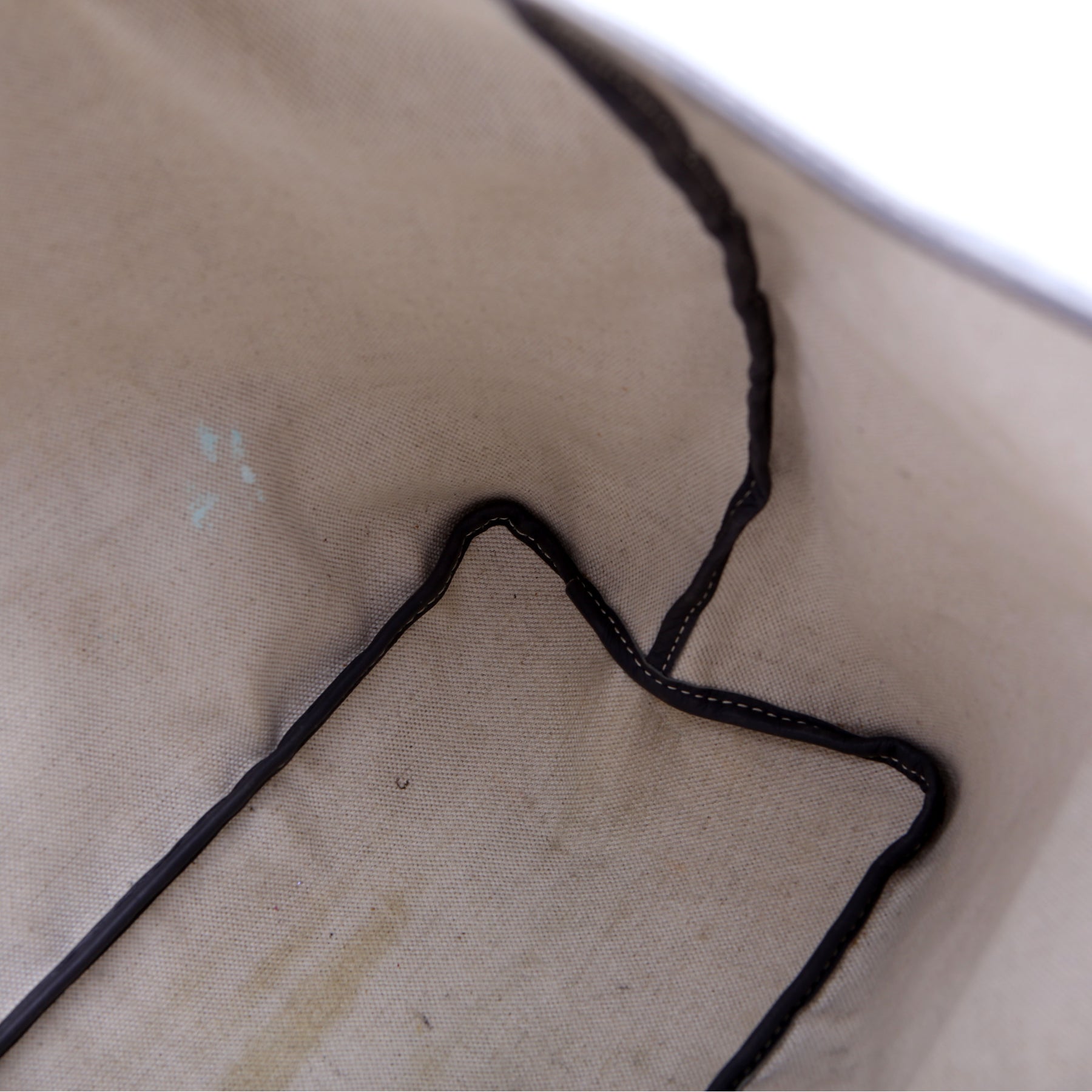 Interior: The has minor stains throughout, and it includes a detachable pouch with one open back pocket. The pouch shows minor wear throughout.