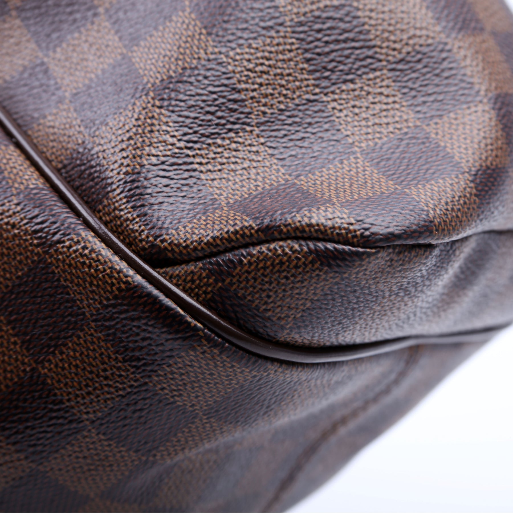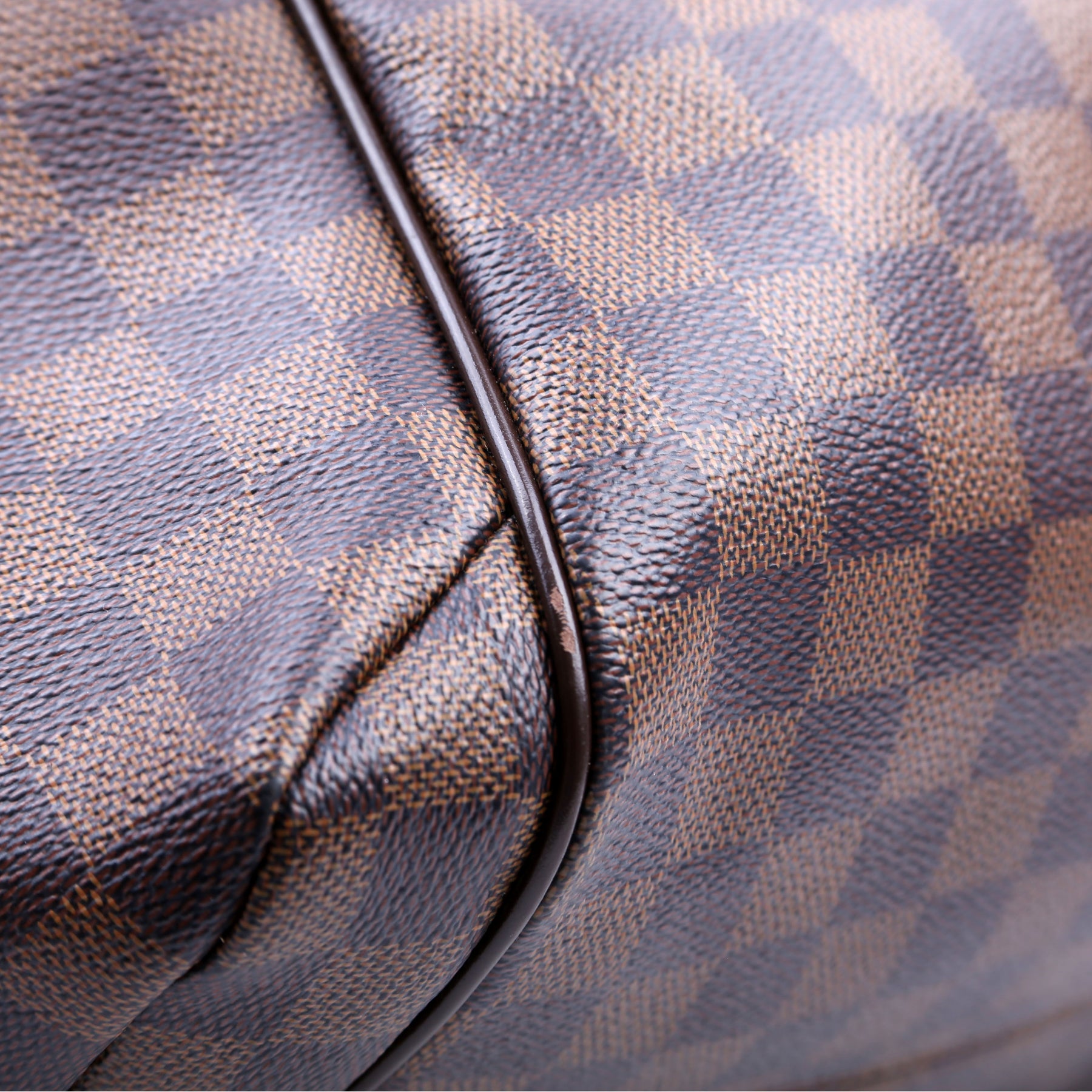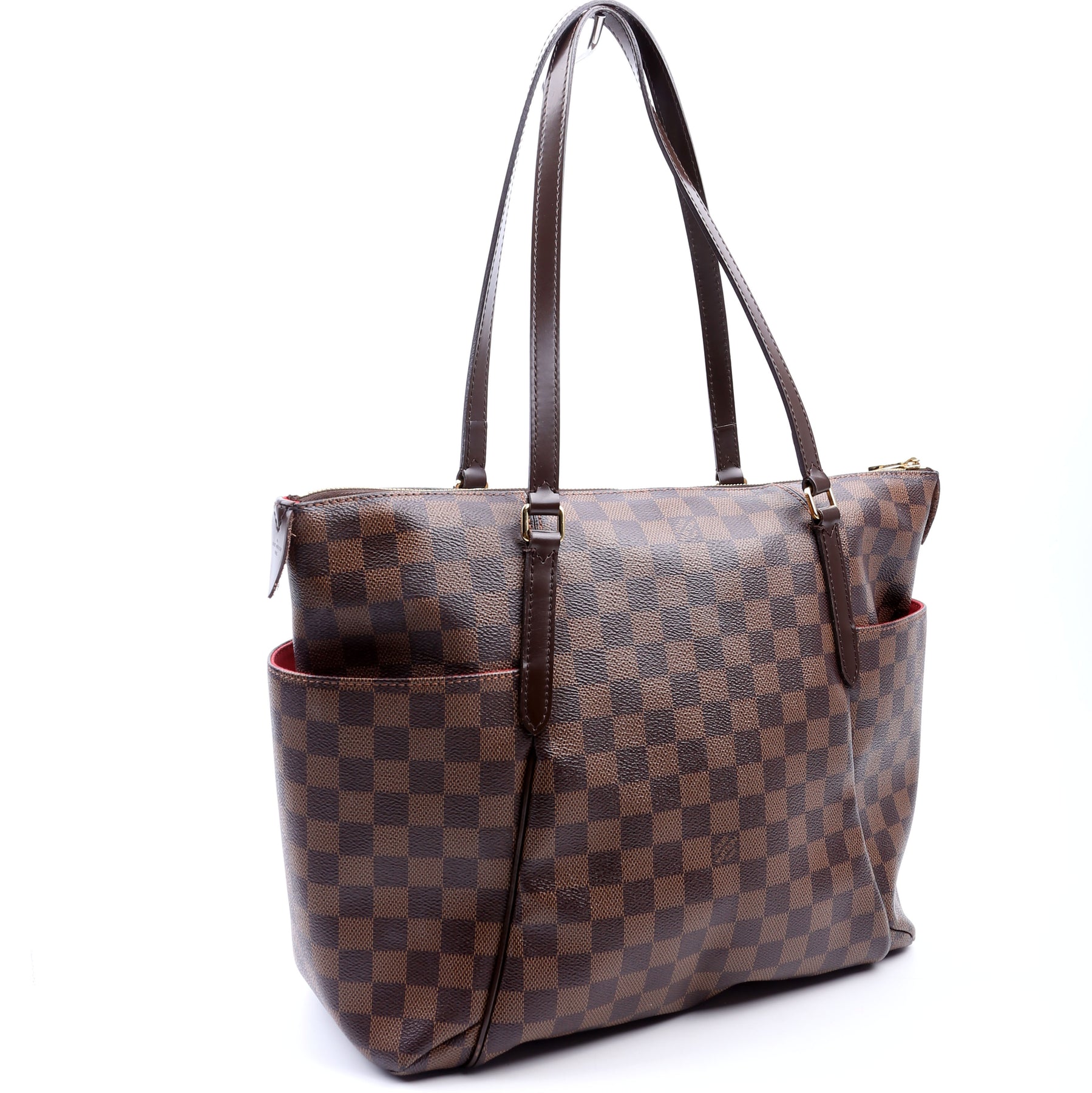 This pre-owned Louis Vuitton Totally MM is guaranteed 100% authentic. The exterior is in the classic Louis Vuitton Damier Ebene coated canvas.