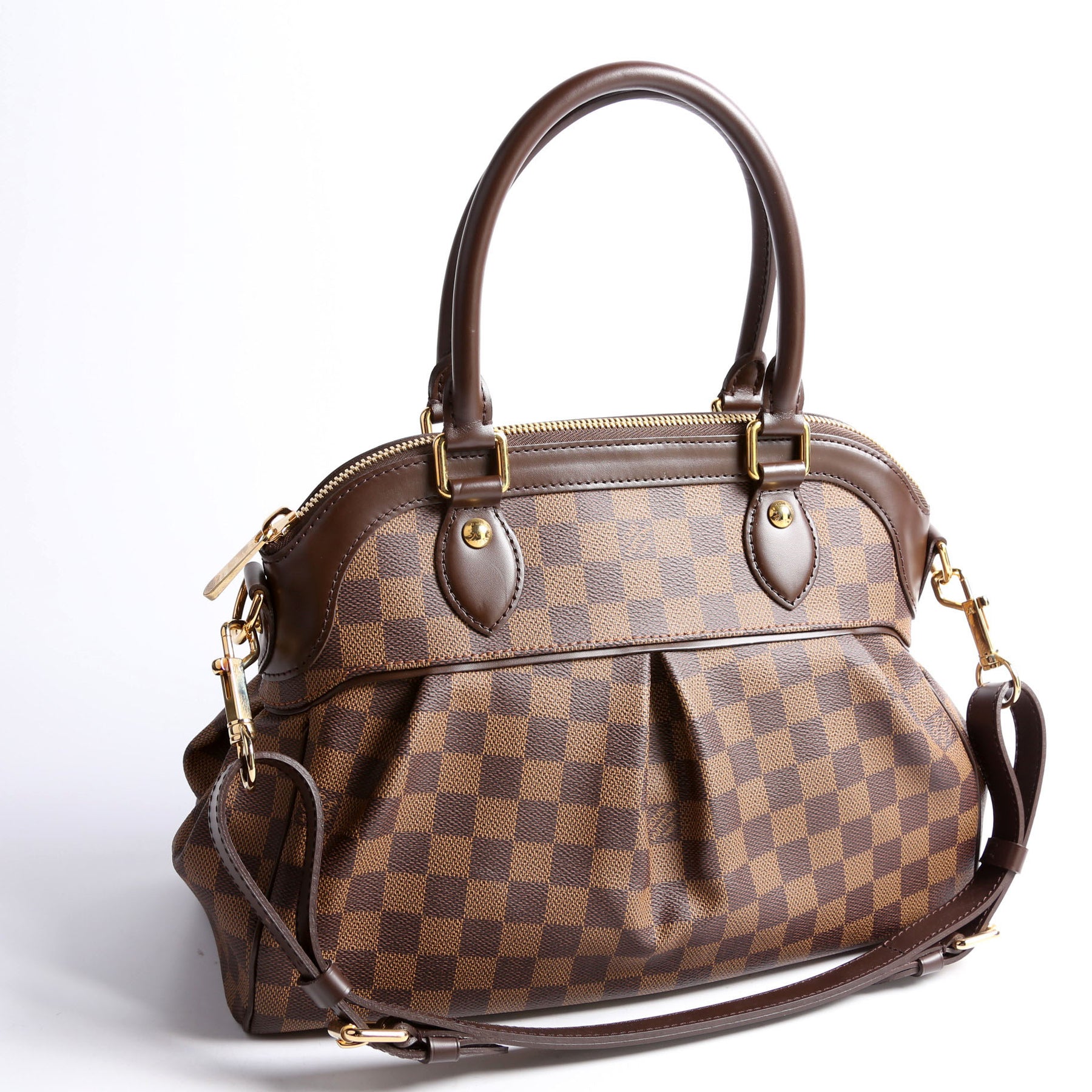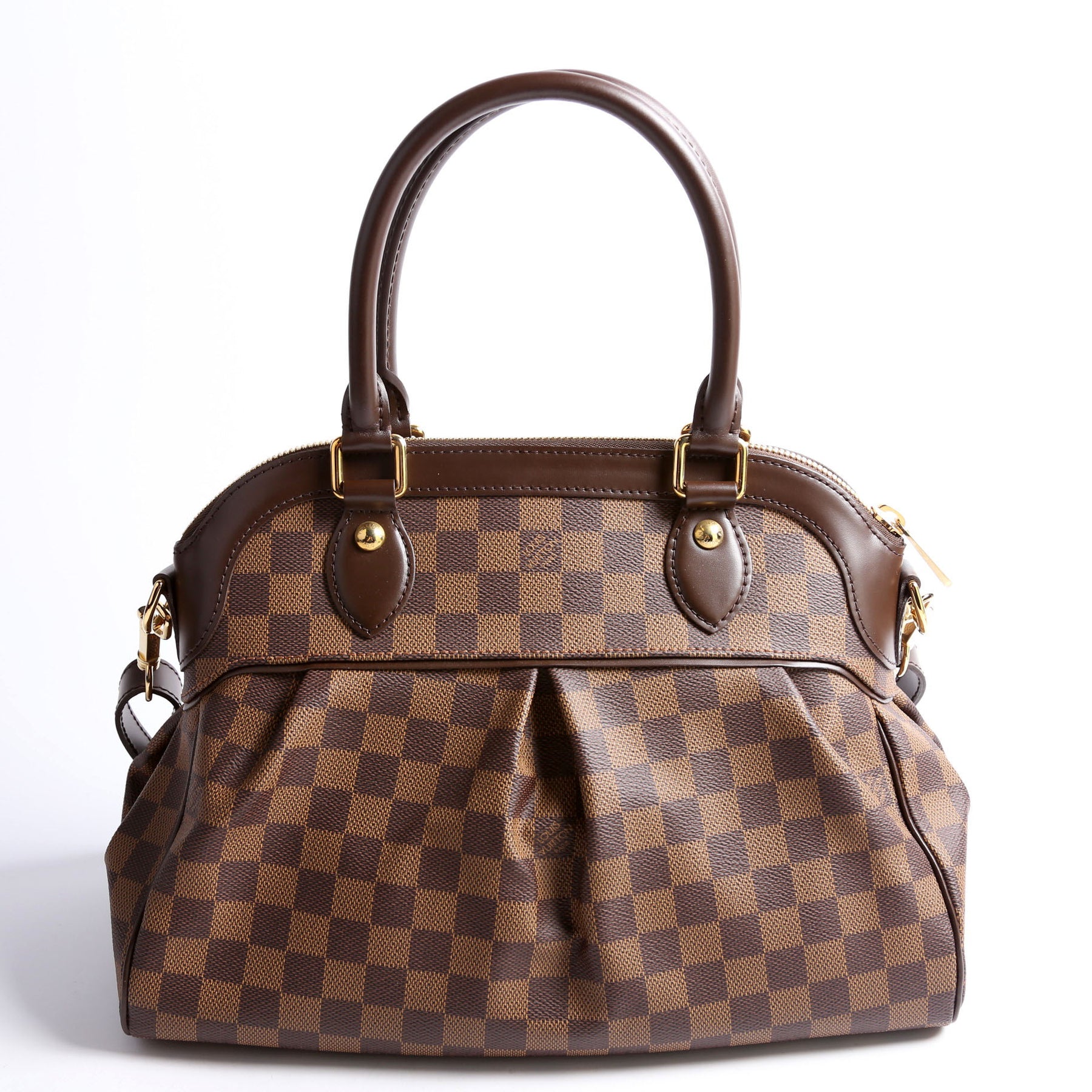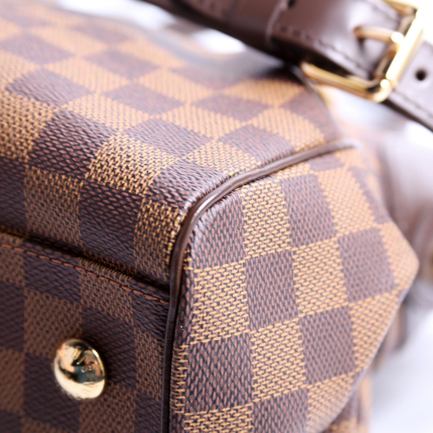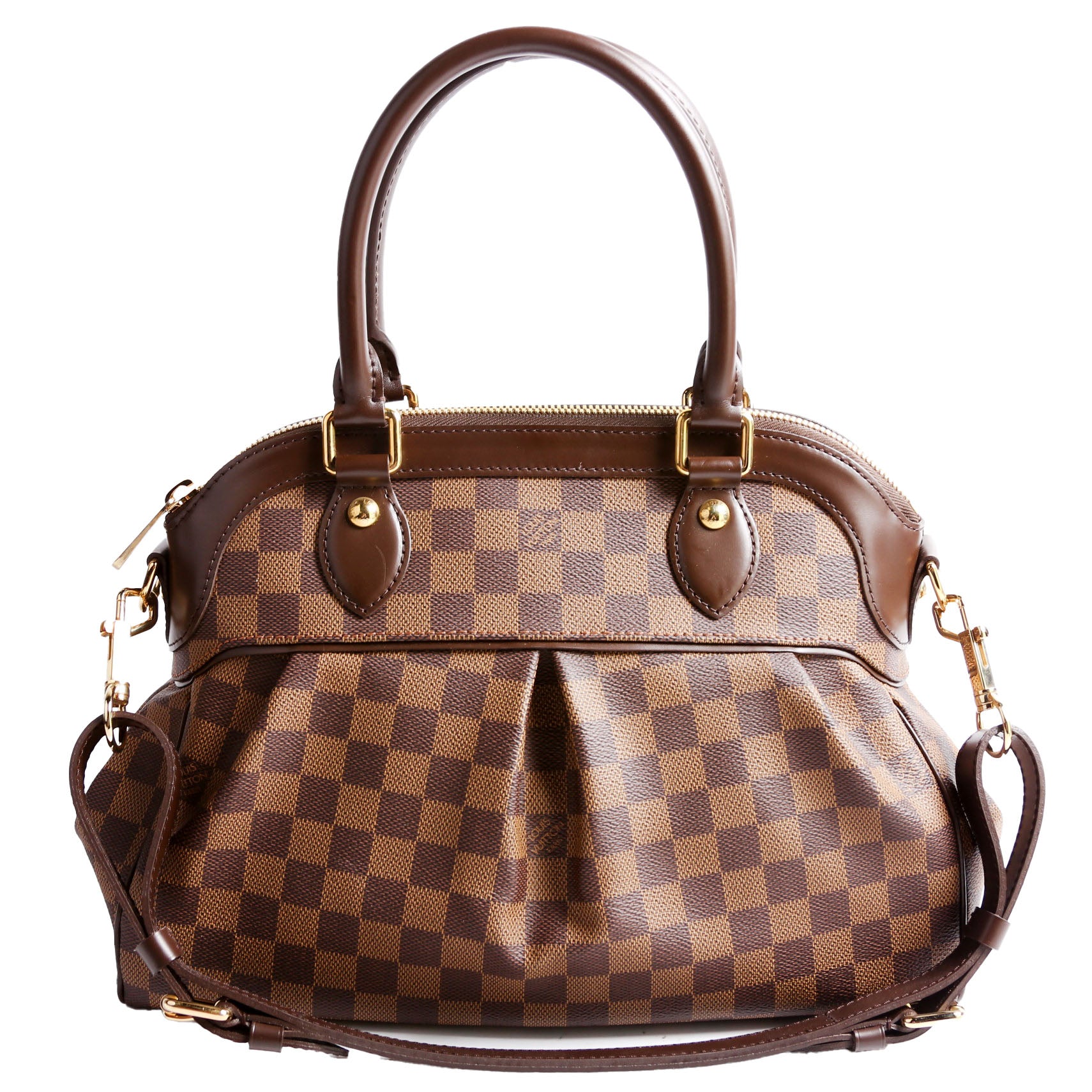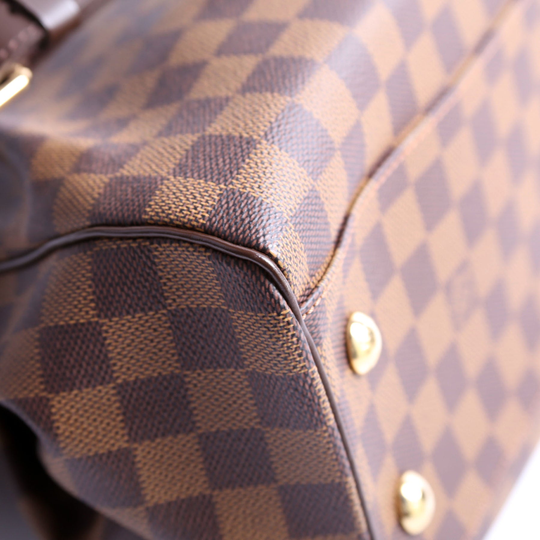 This pre-owned Louis Vuitton Trevi PM is guaranteed 100% authentic. The exterior is in the classic Louis Vuitton Damier Ebene coated canvas.