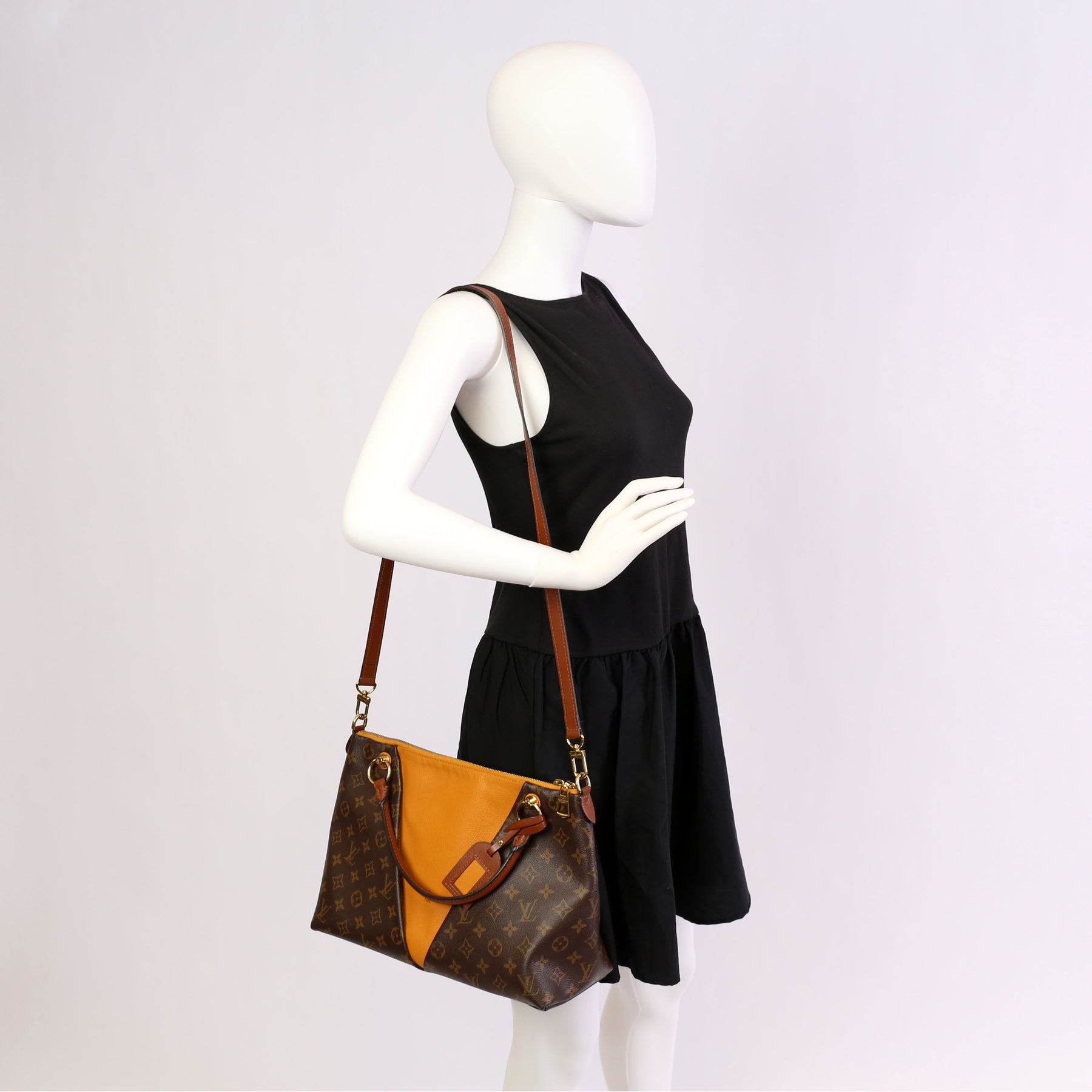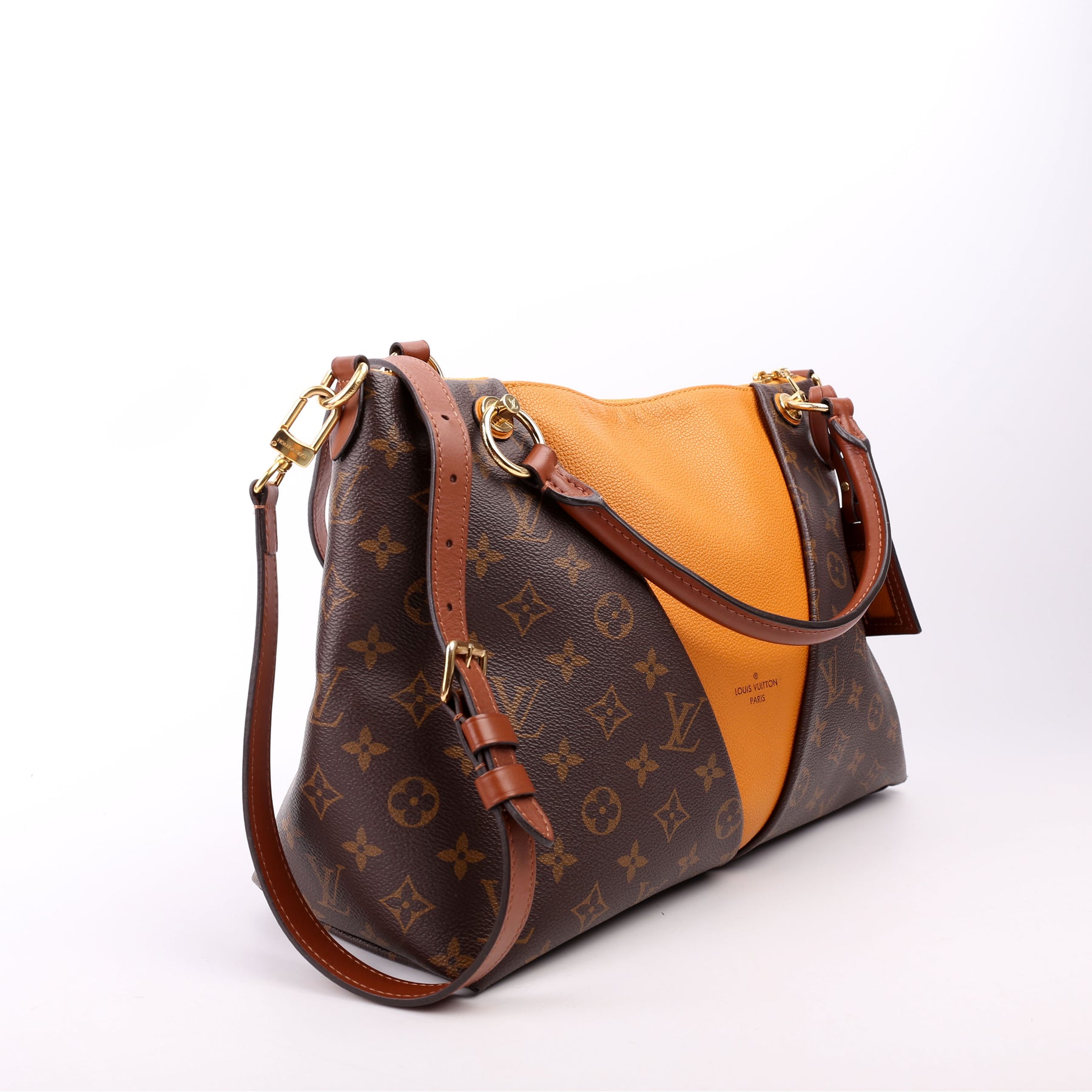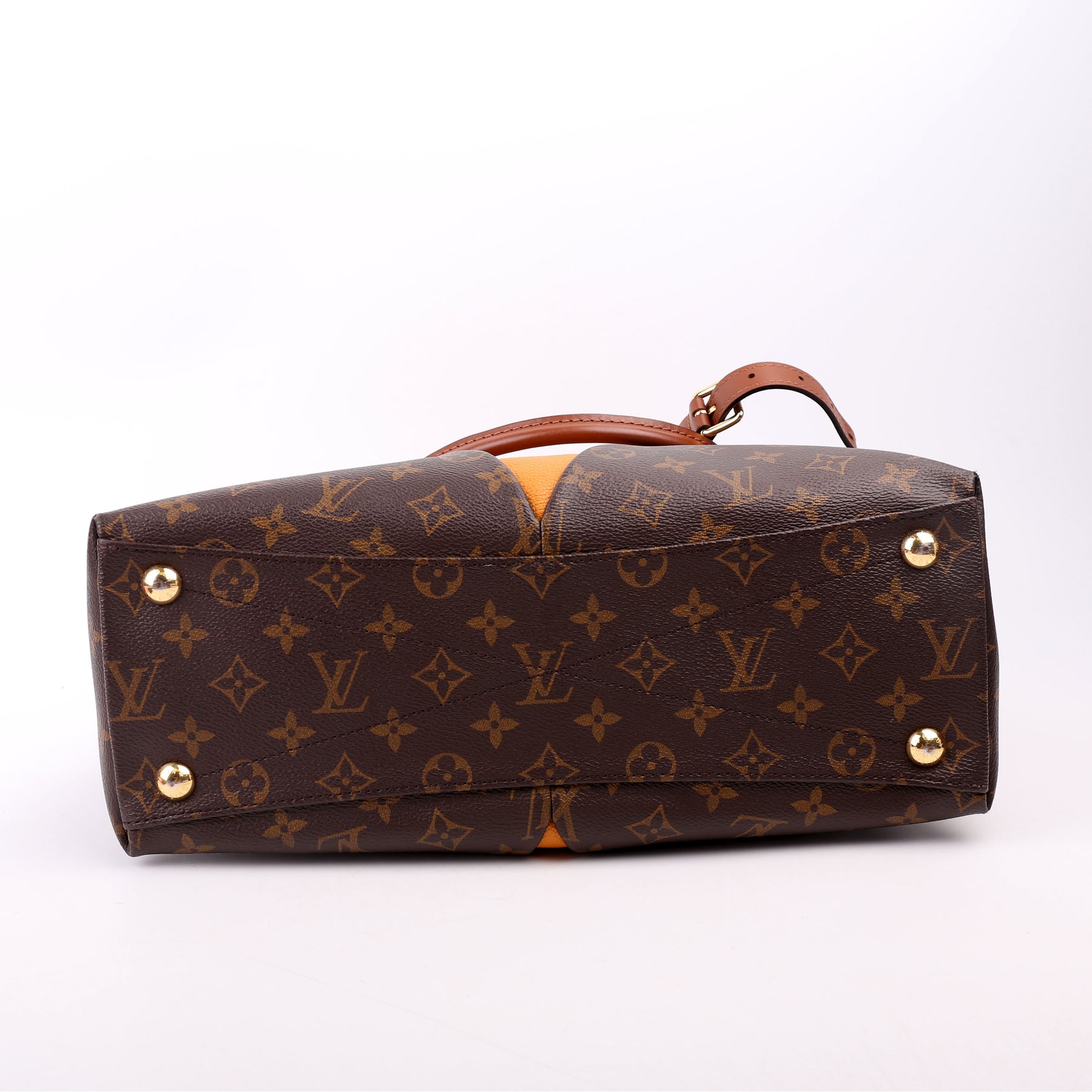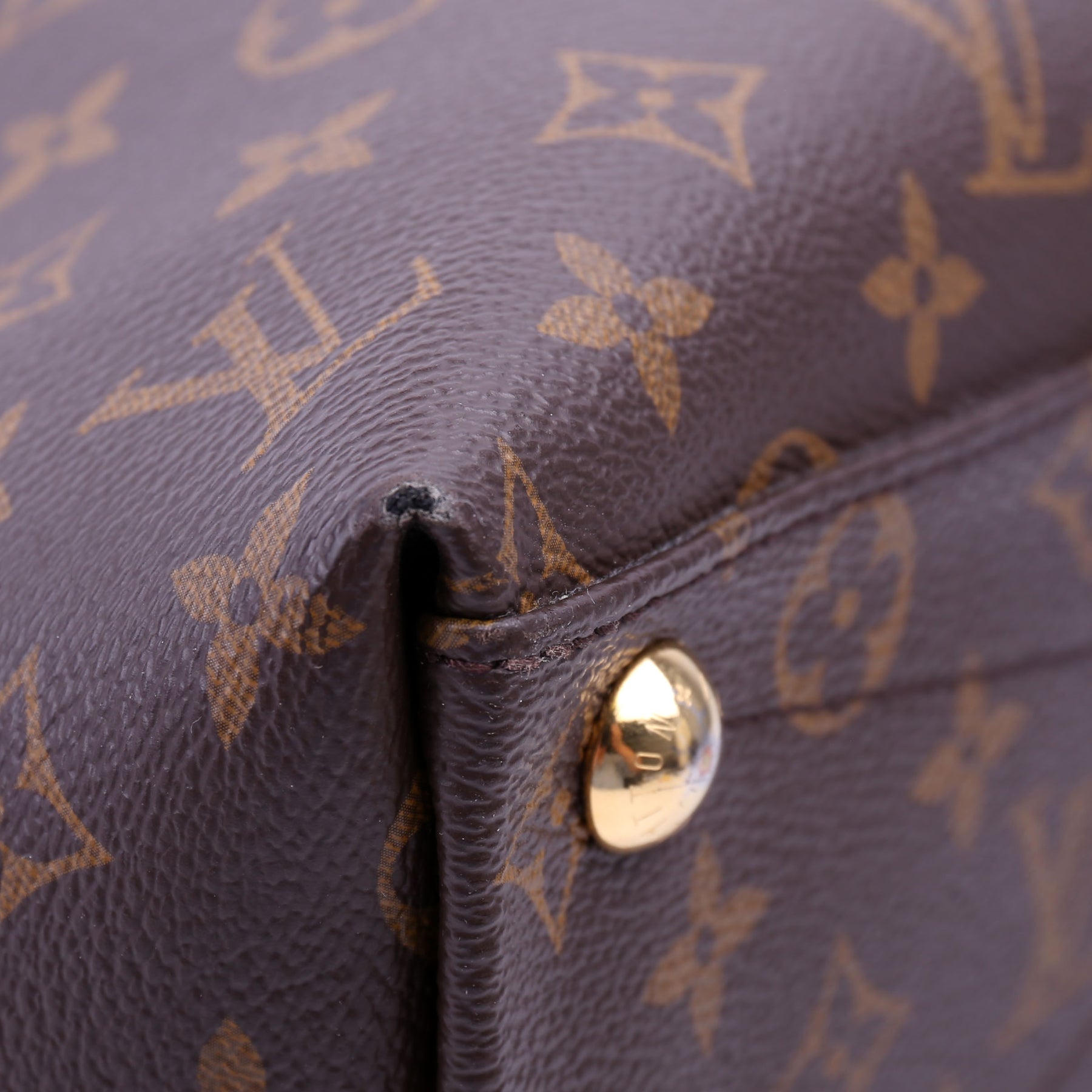 This pre-owned Louis Vuitton V Tote MM is guaranteed 100% authentic. The exterior is in the classic Louis Vuitton Monogram Coated Canvas