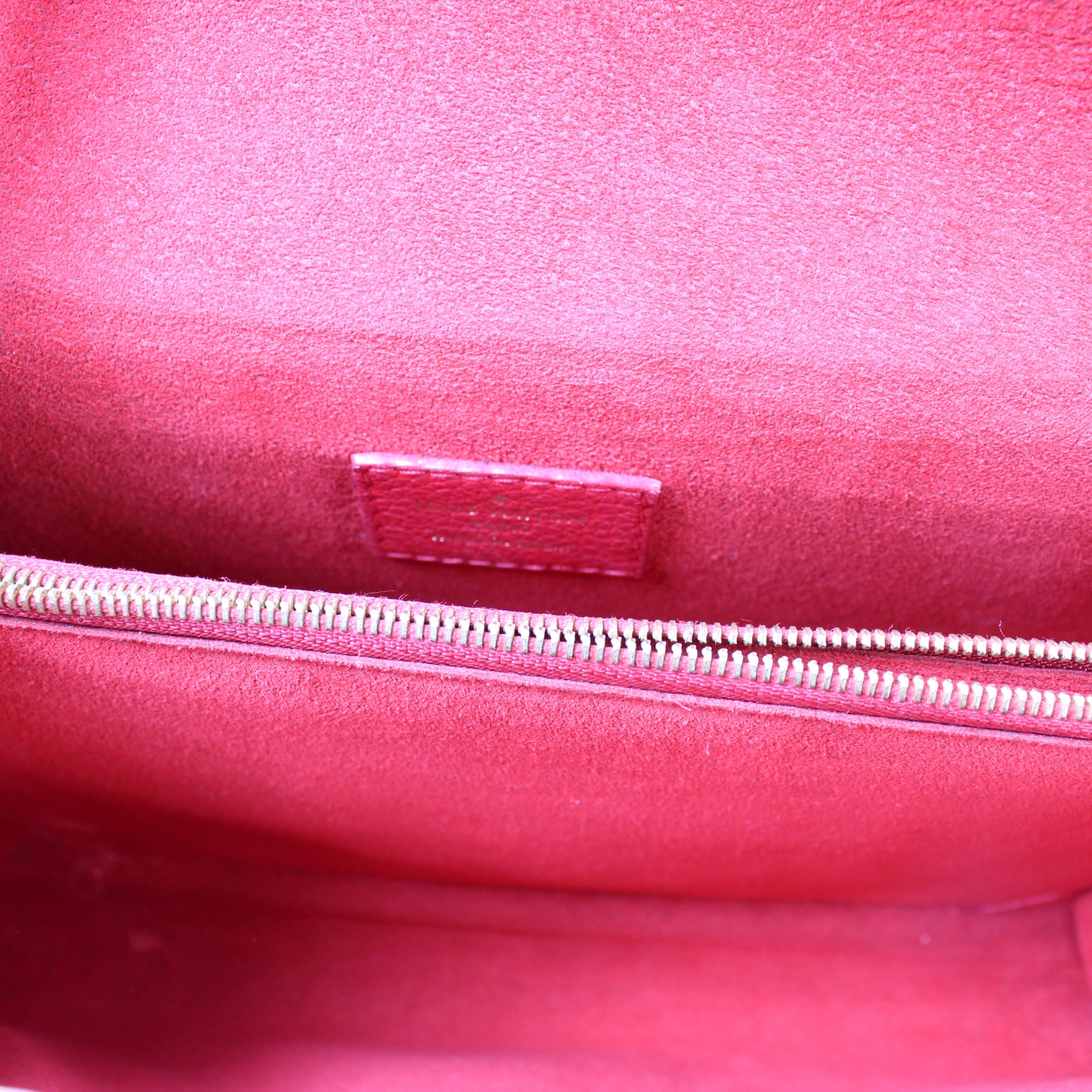 Interior: The interior shows light staining, and is free of rips or tears. The interior includes two open sections and one zip closure section.