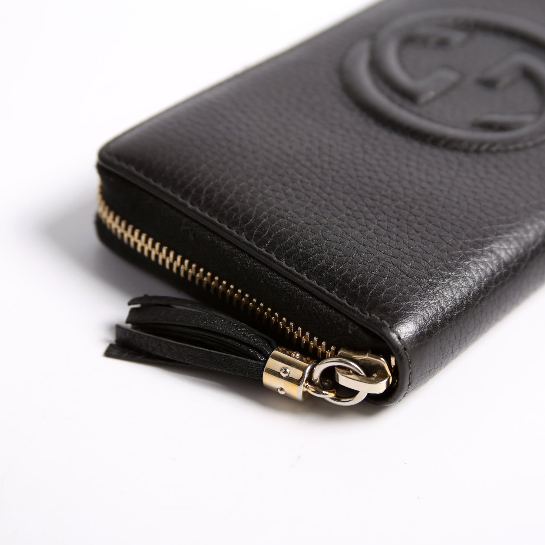 This pre-owned Gucci Soho Wallet is guaranteed 100% authentic. The exterior is in the classic Gucci Soho leather.