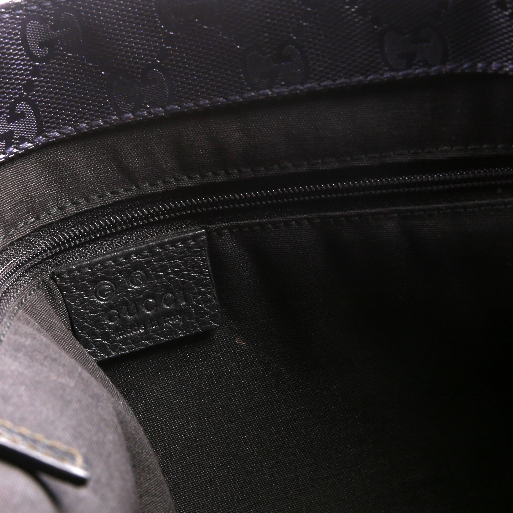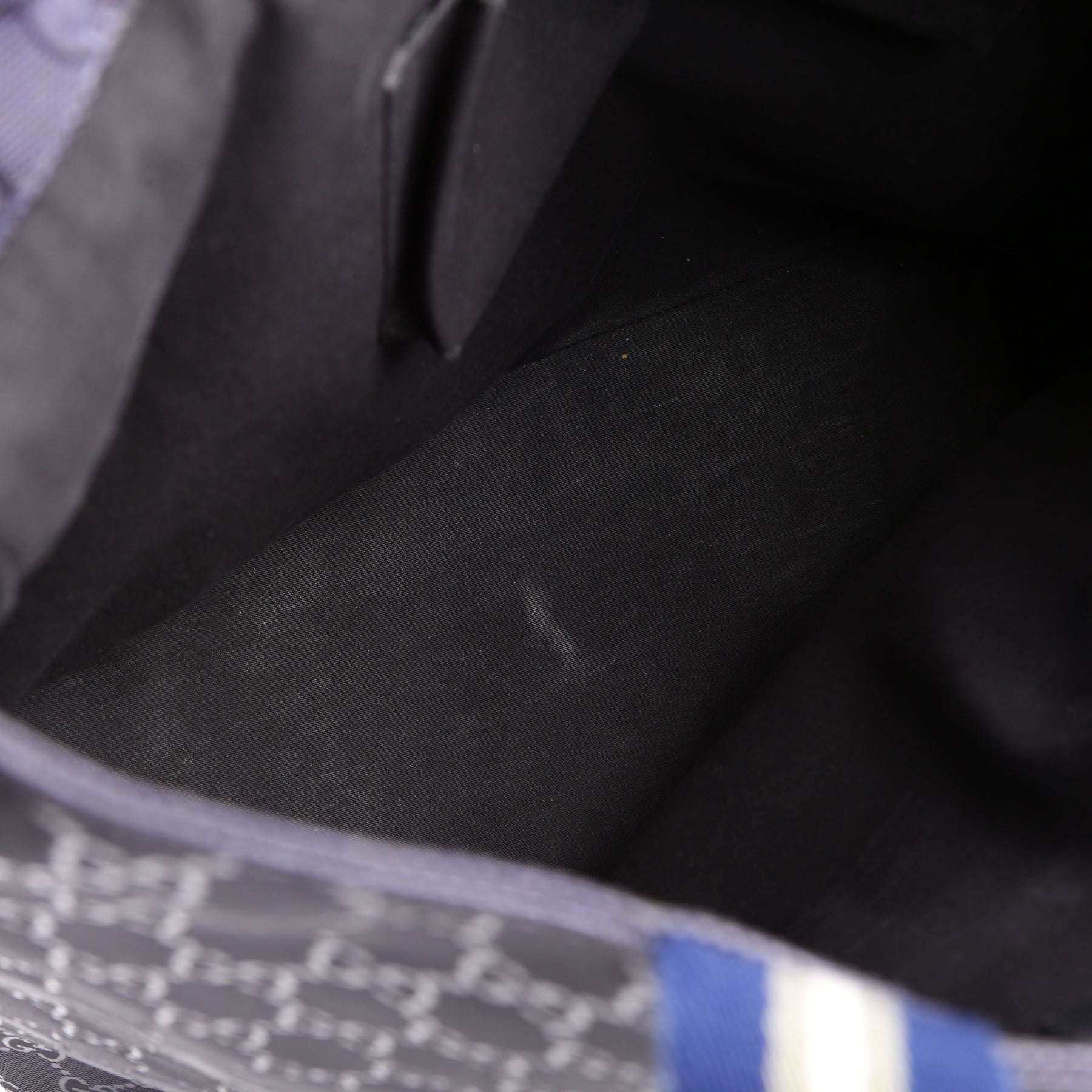 Interior: The interior features two open pockets and one zip closure pocket. The base has minor discoloration.