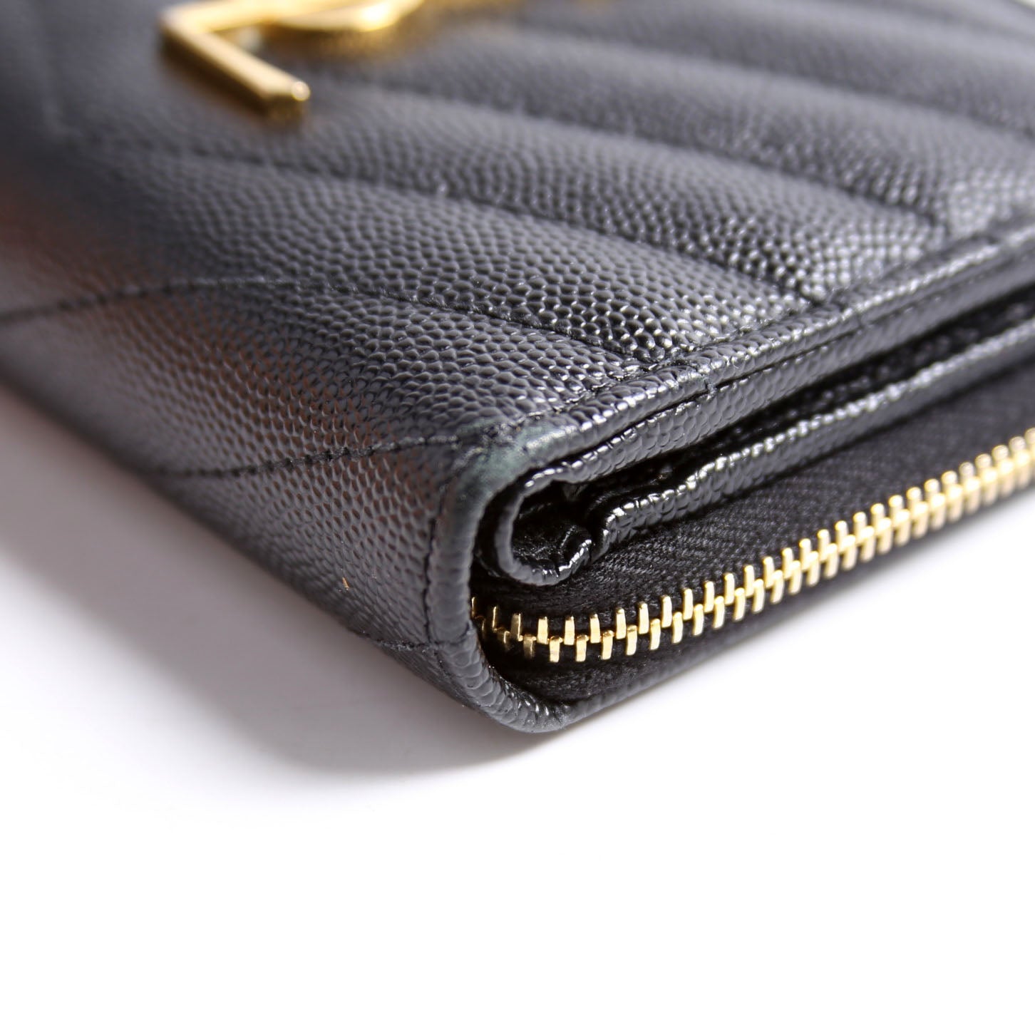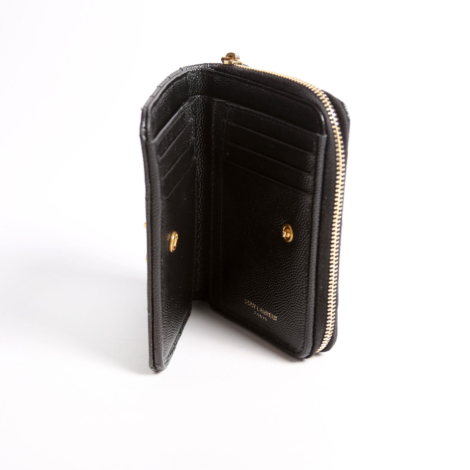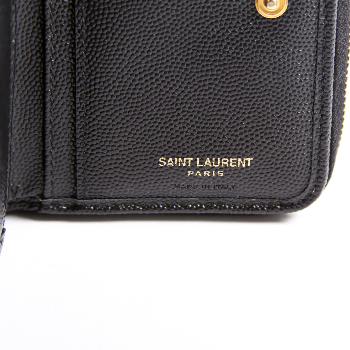 This pre-owned Saint Laurent Cassandre Compact Zip Around Wallet is guaranteed 100% authentic. The exterior is in the classic Saint Laurent Grain De Poudre leather.