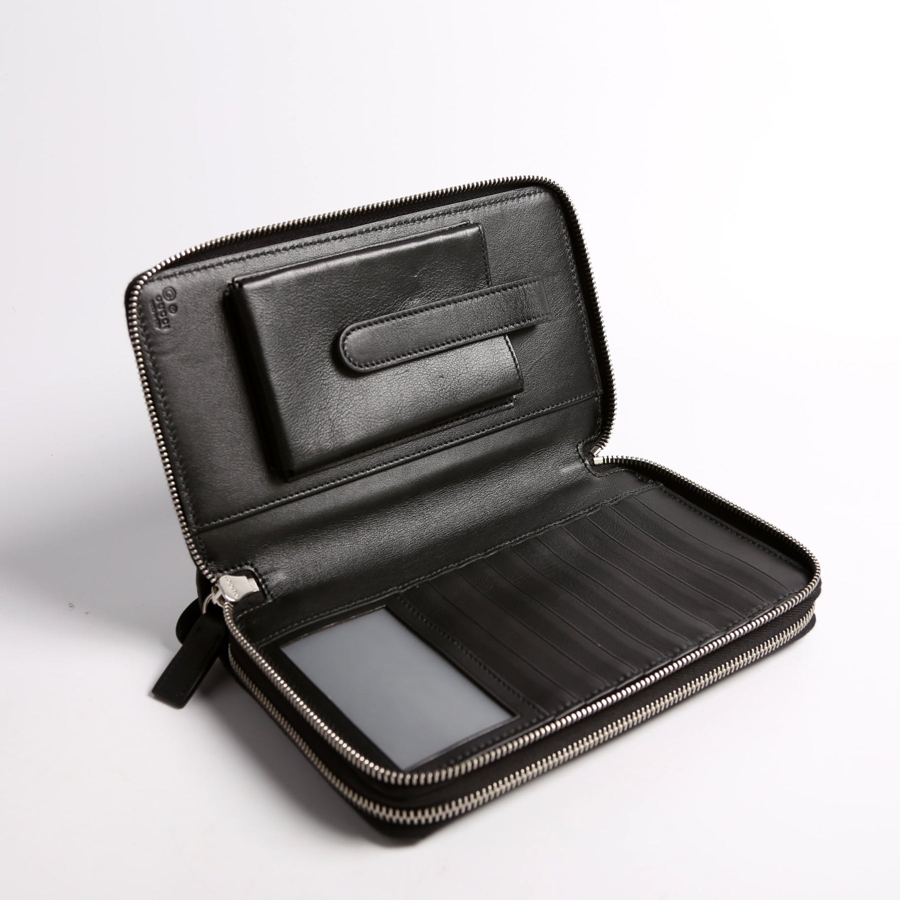 Interior: The interior has light scuffs throughout. It features two zip closure section with twelve bill slots and four pockets, and one snap closure section with ten card slots.