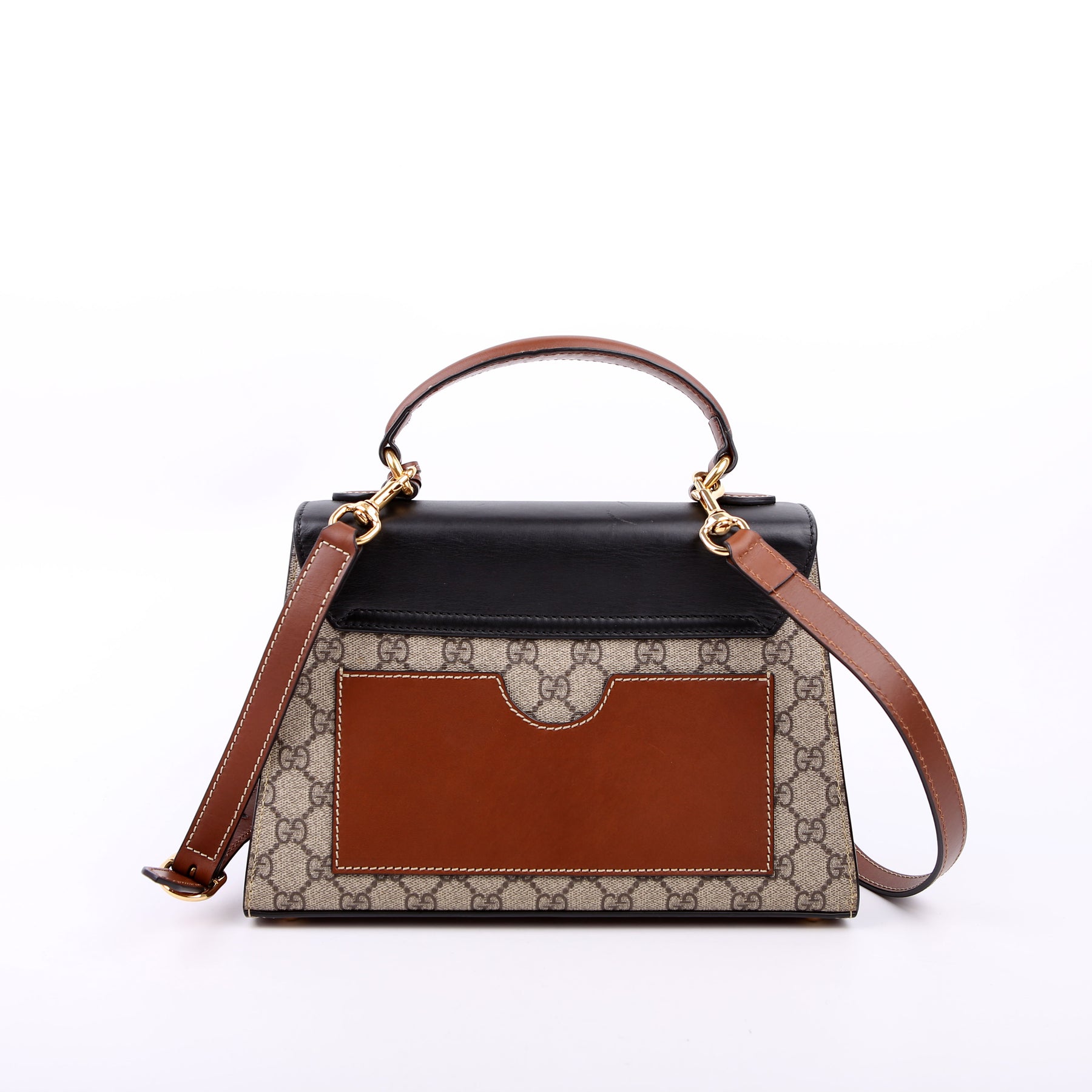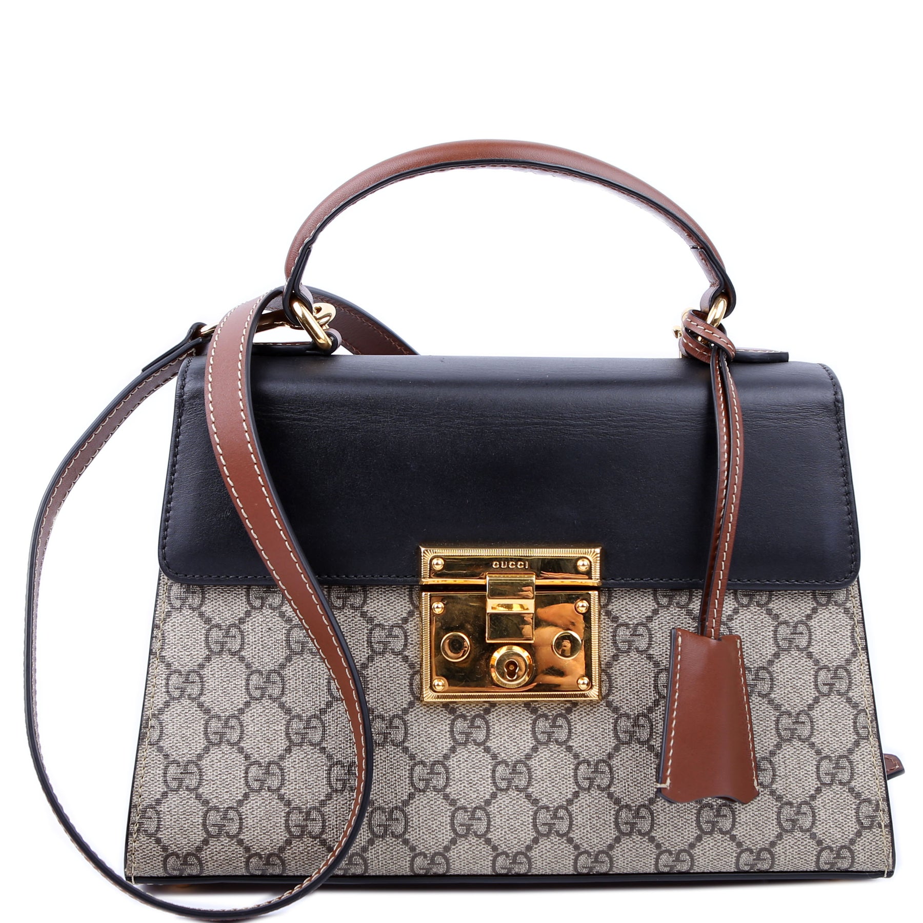 This pre-owned Gucci Padlock GG Supreme Top Handle Small is guaranteed 100% authentic. The exterior is in the classic Gucci GG Supreme coated canvas.