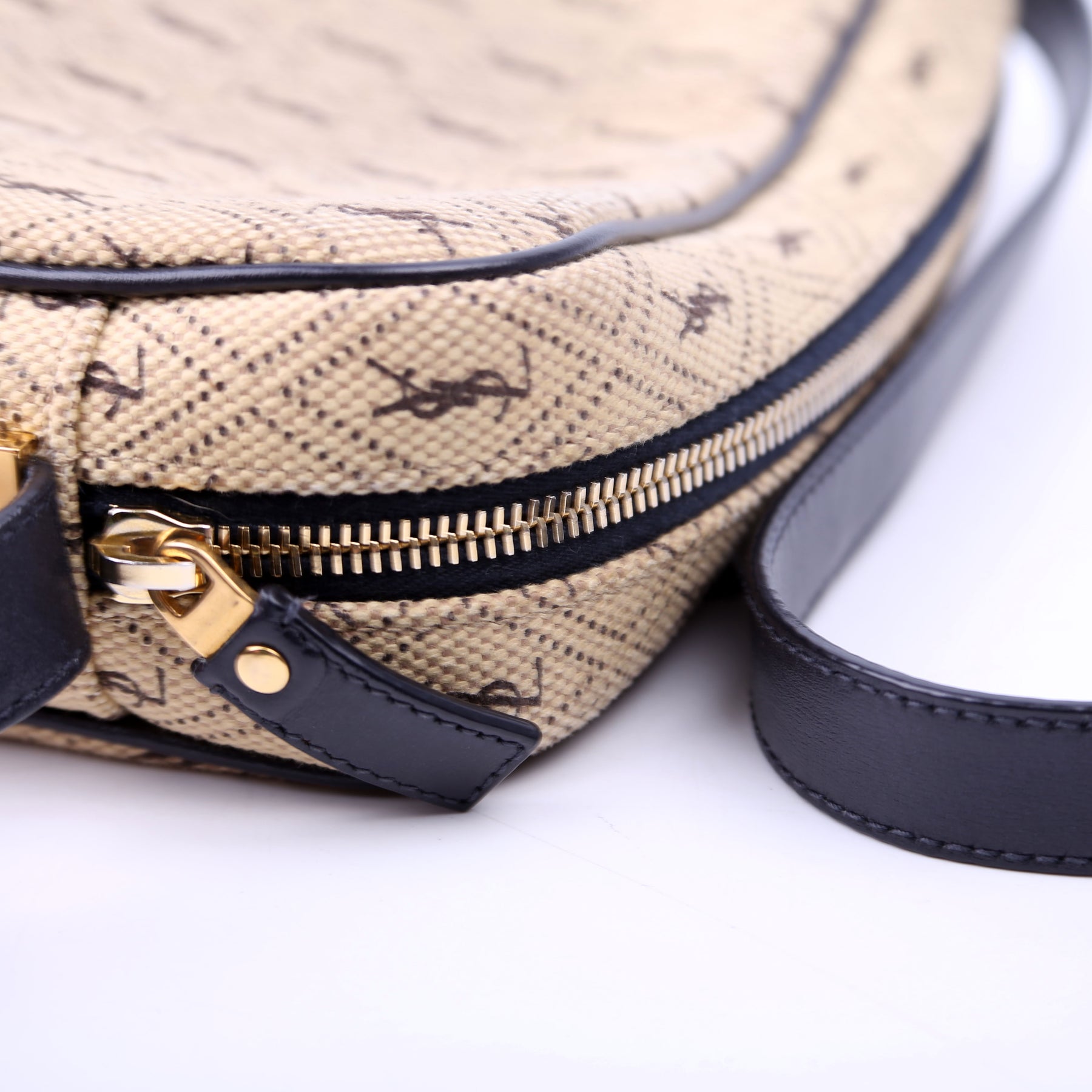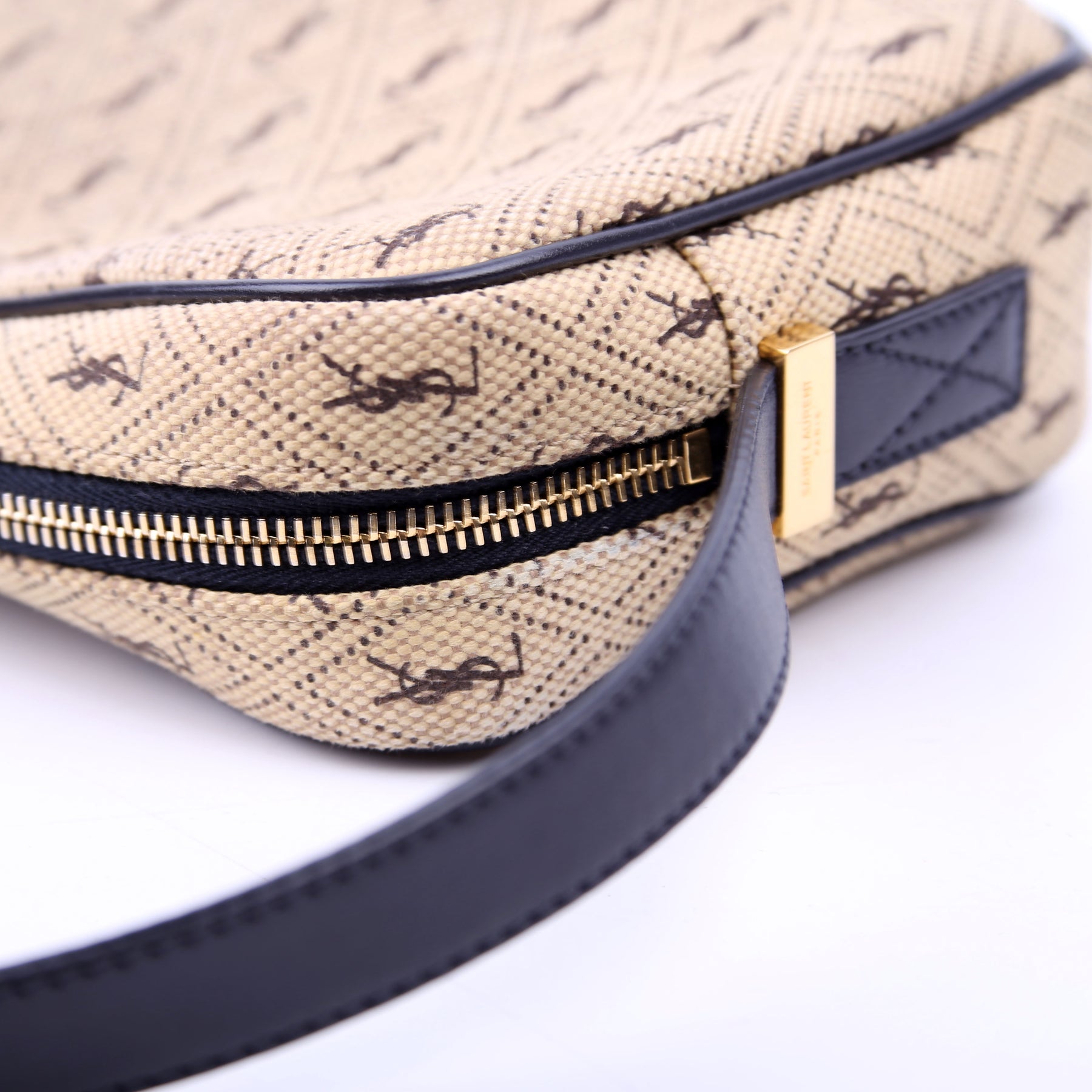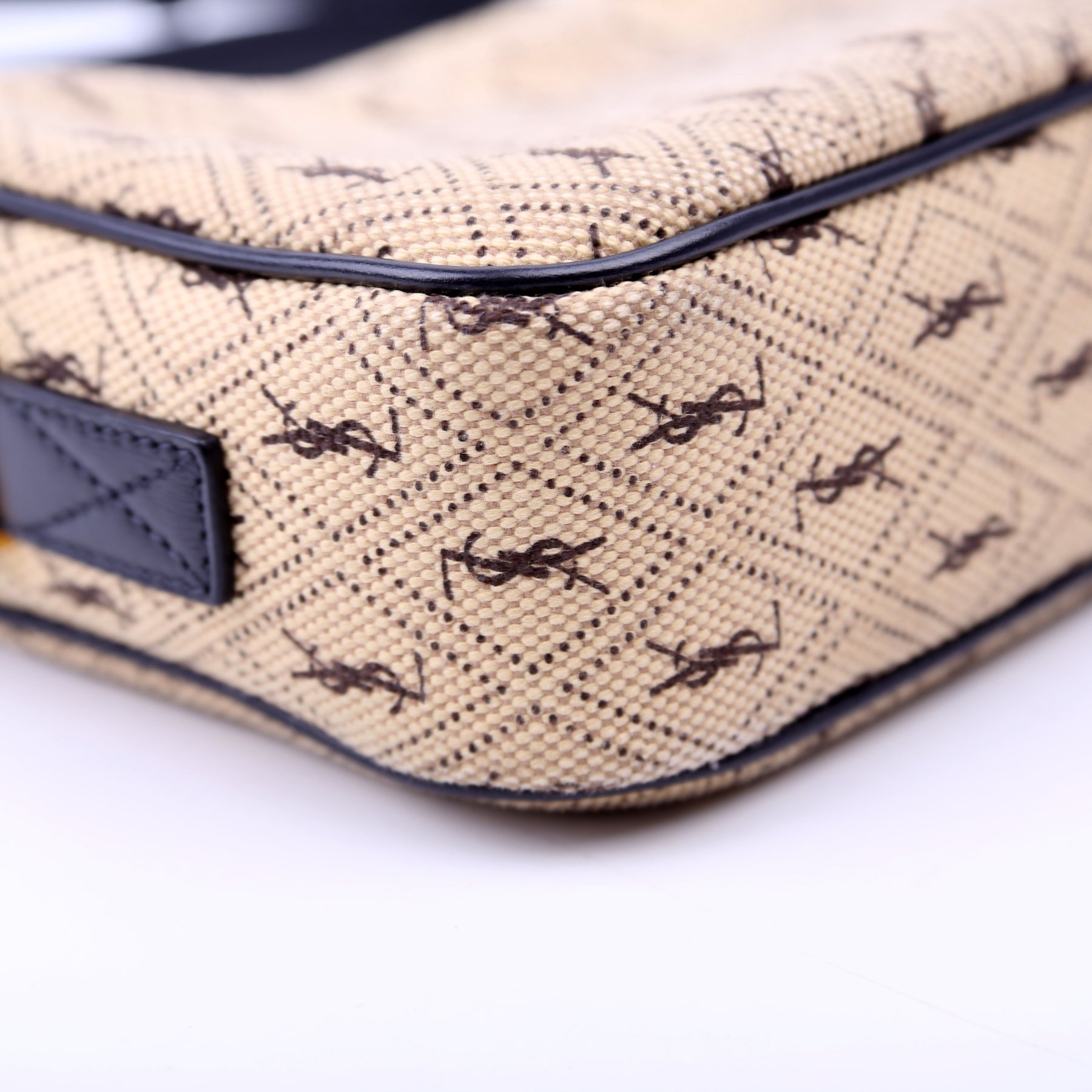 This pre-owned Saint Laurent All Over Logo Canvas Camera Bag is guaranteed 100% authentic. The exterior is in the classic Saint Laurent logo canvas.