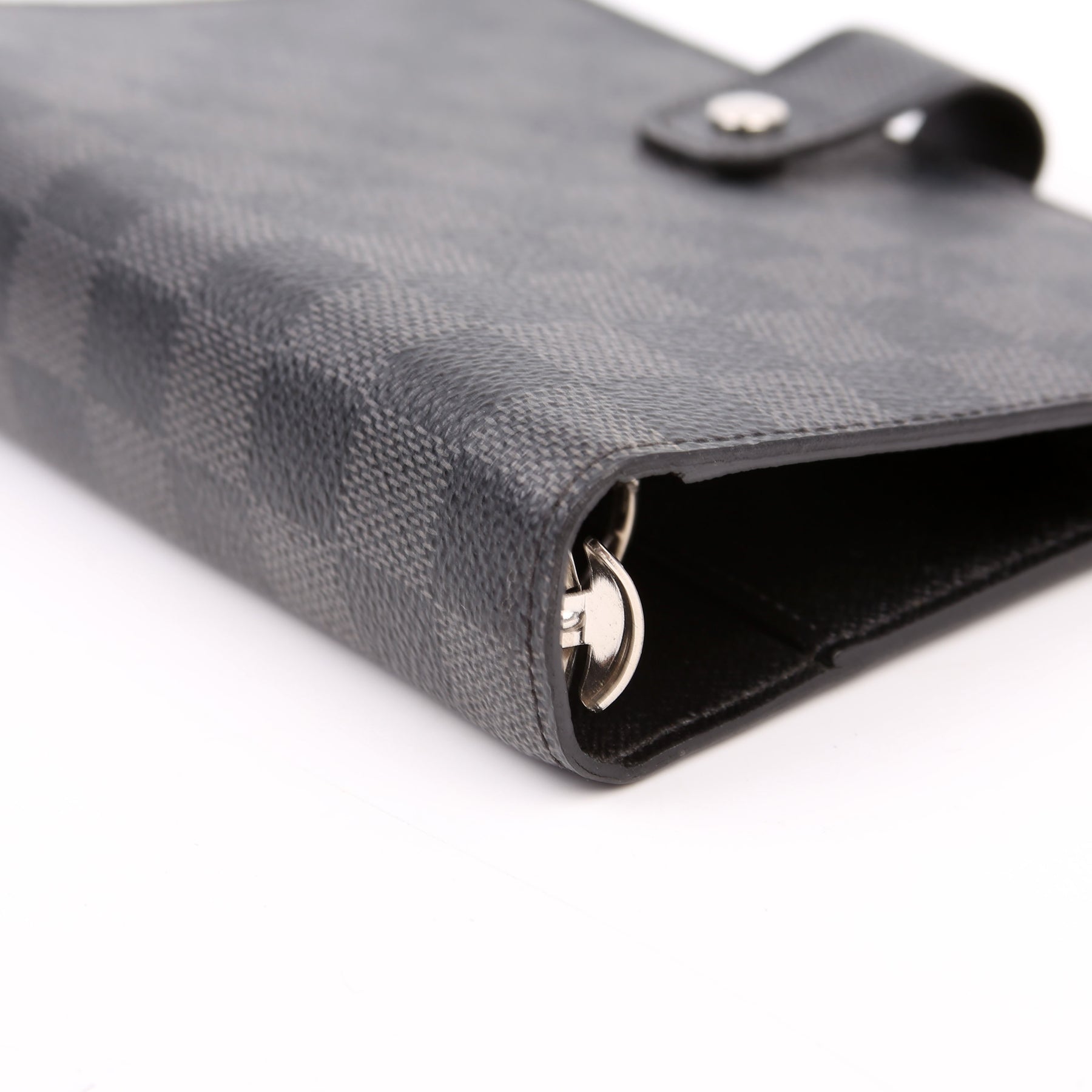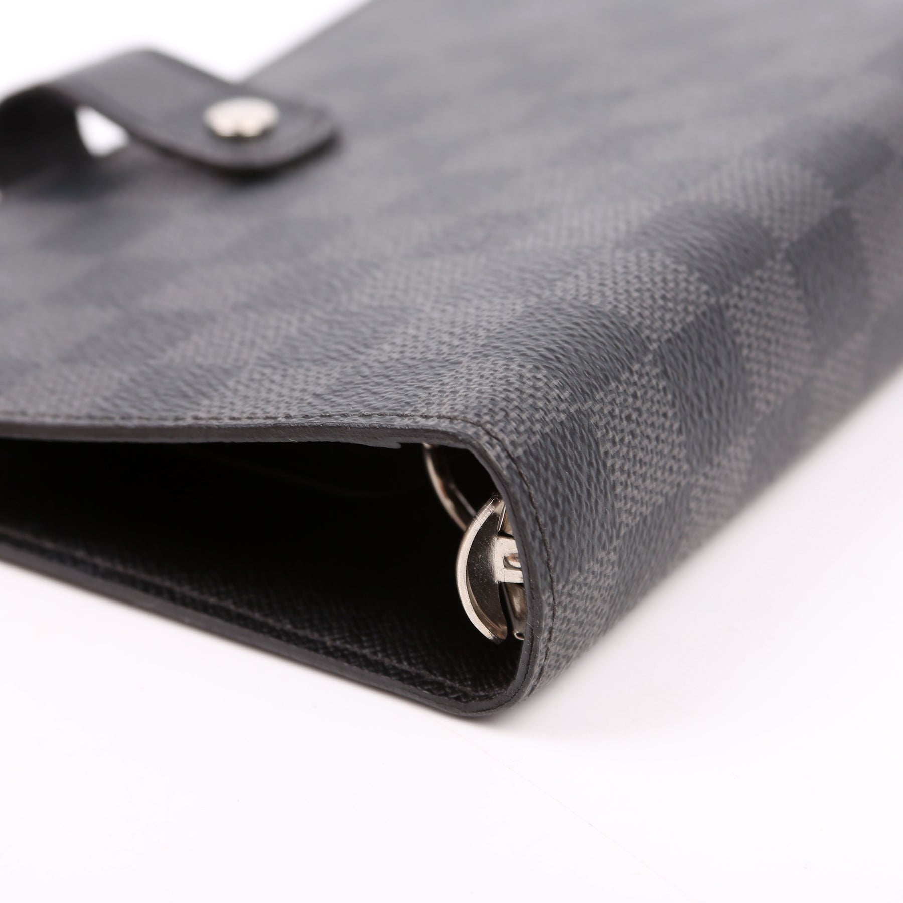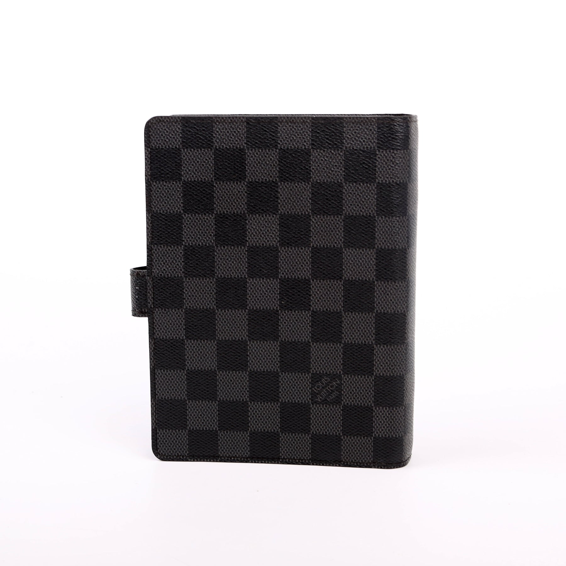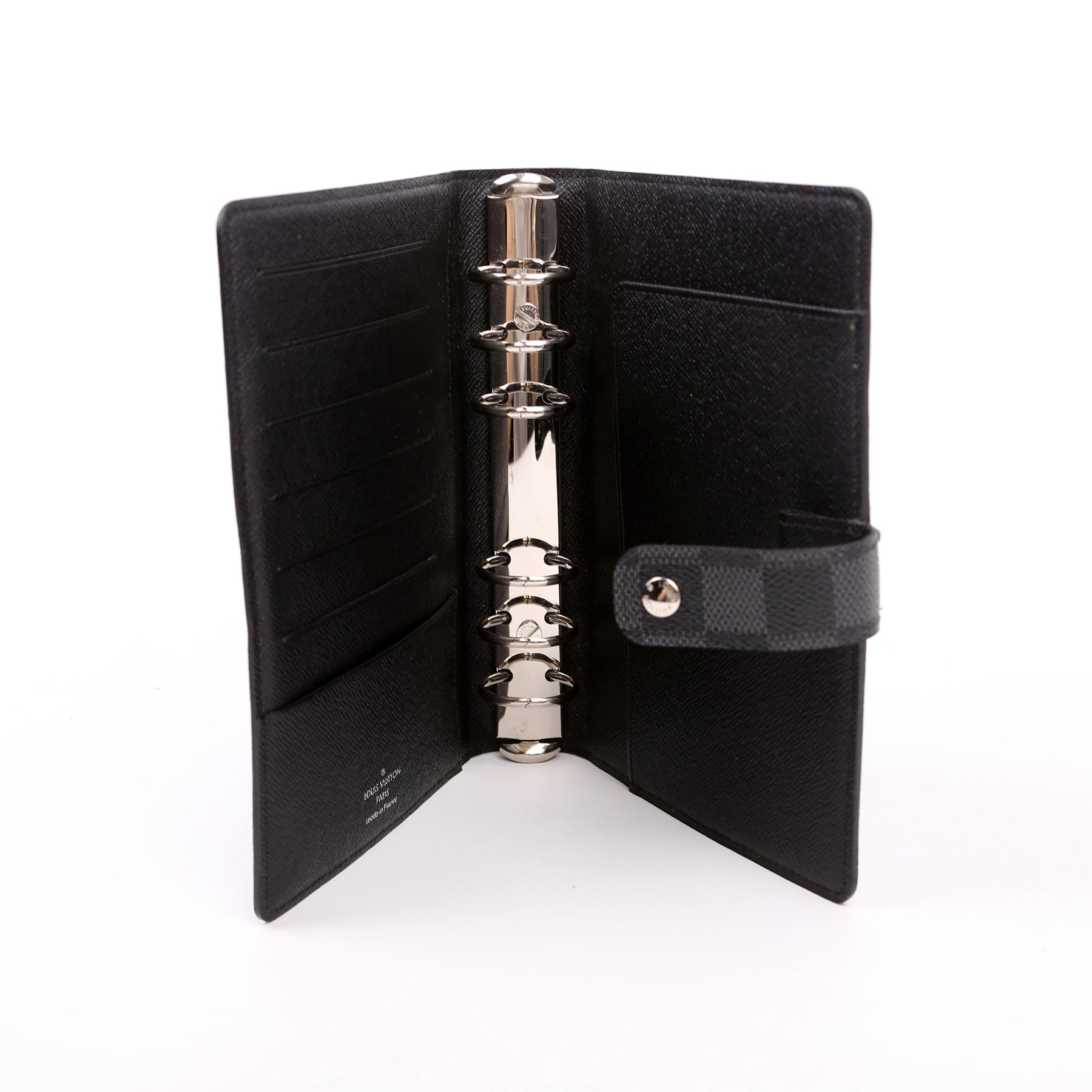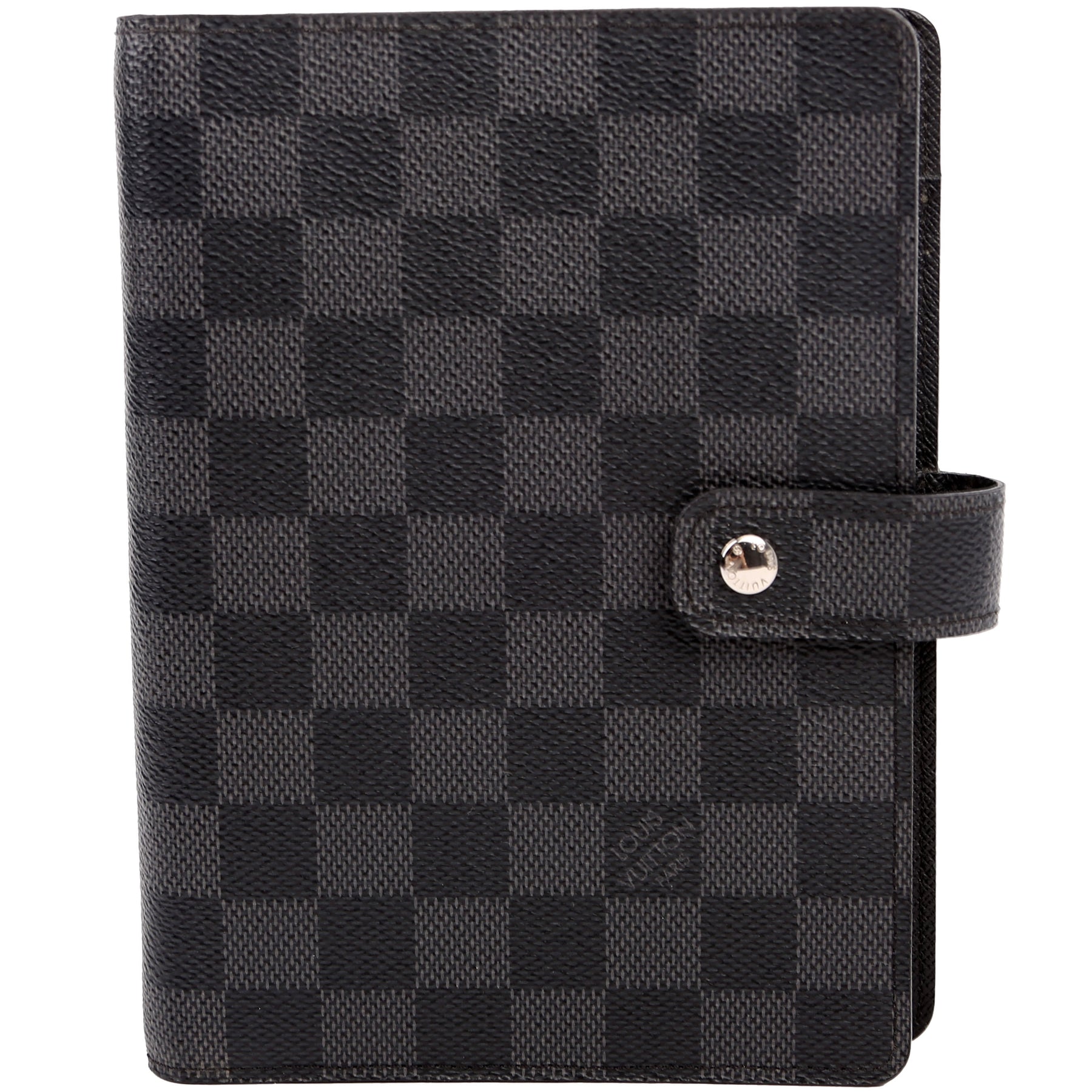This pre-owned Louis Vuitton Agenda Medium Ring is guaranteed 100% authentic. The exterior is in the classic Damier Graphite canvas.