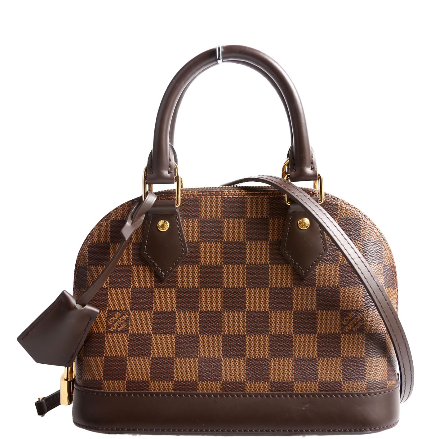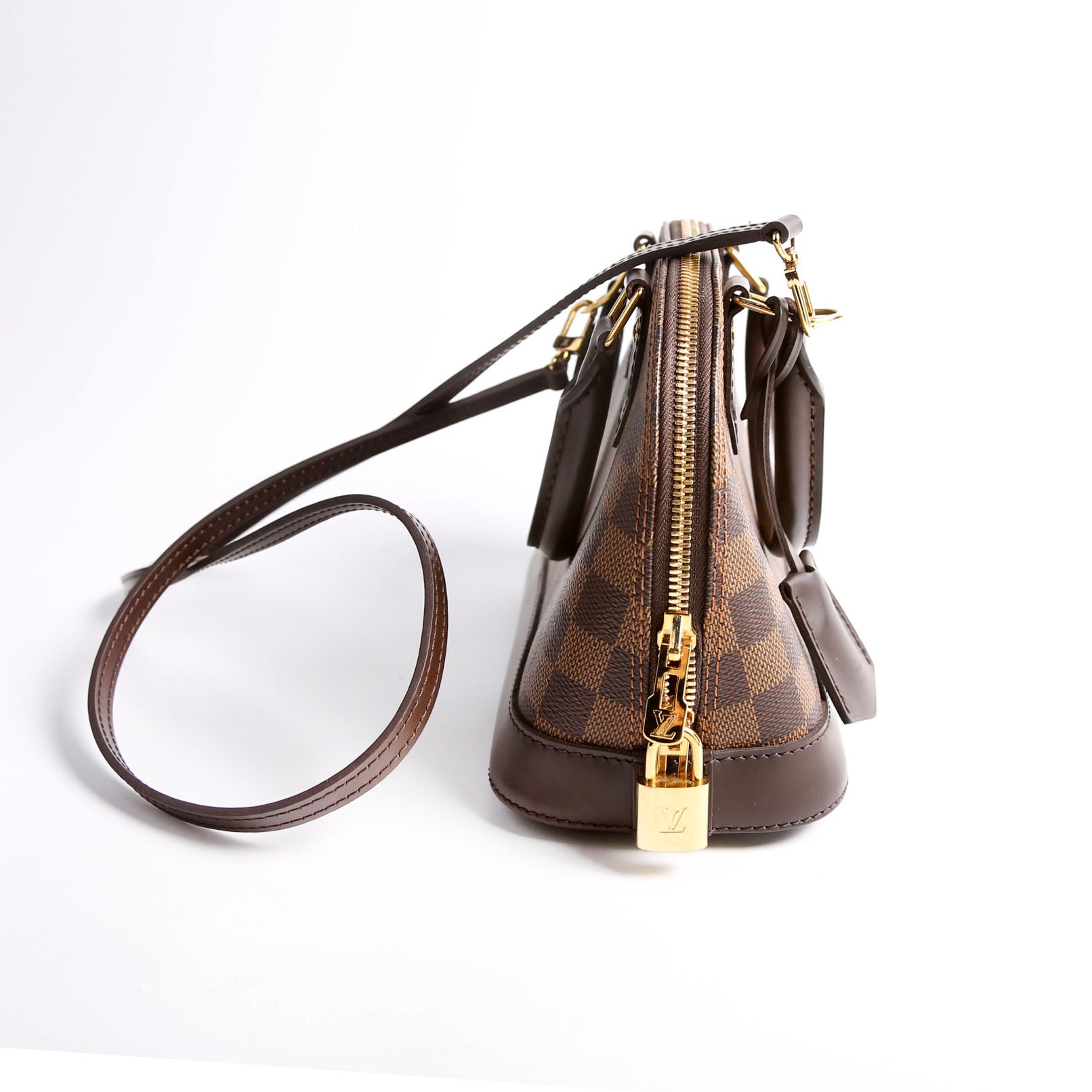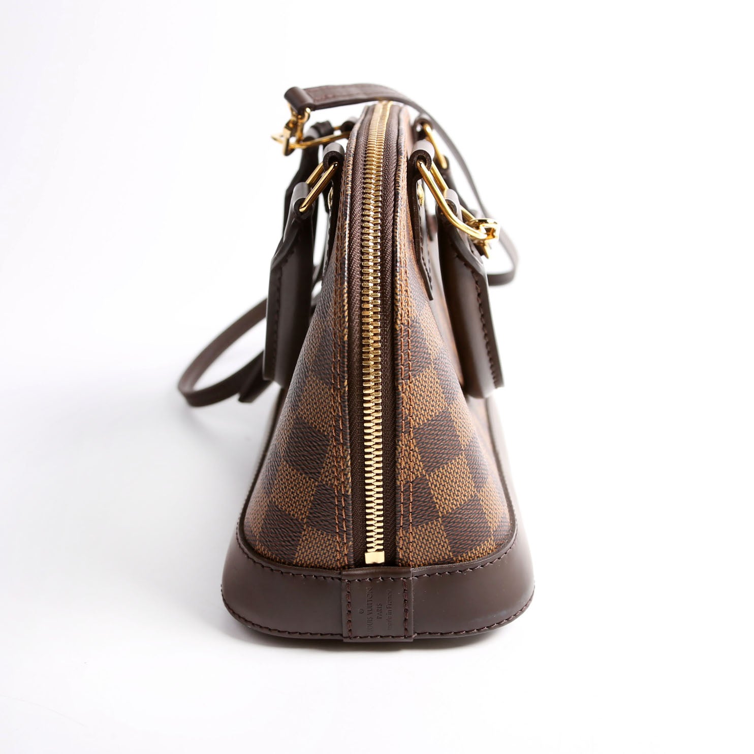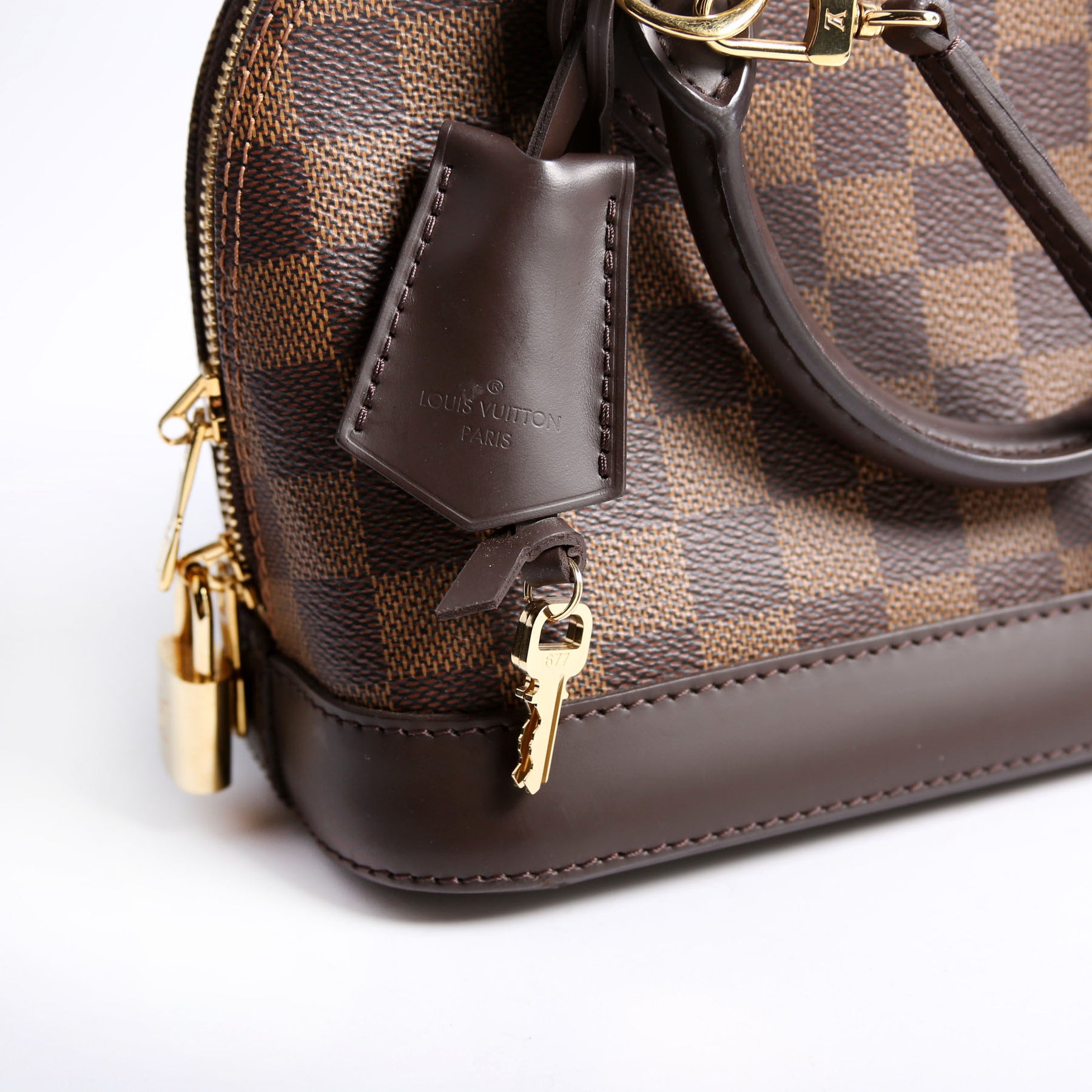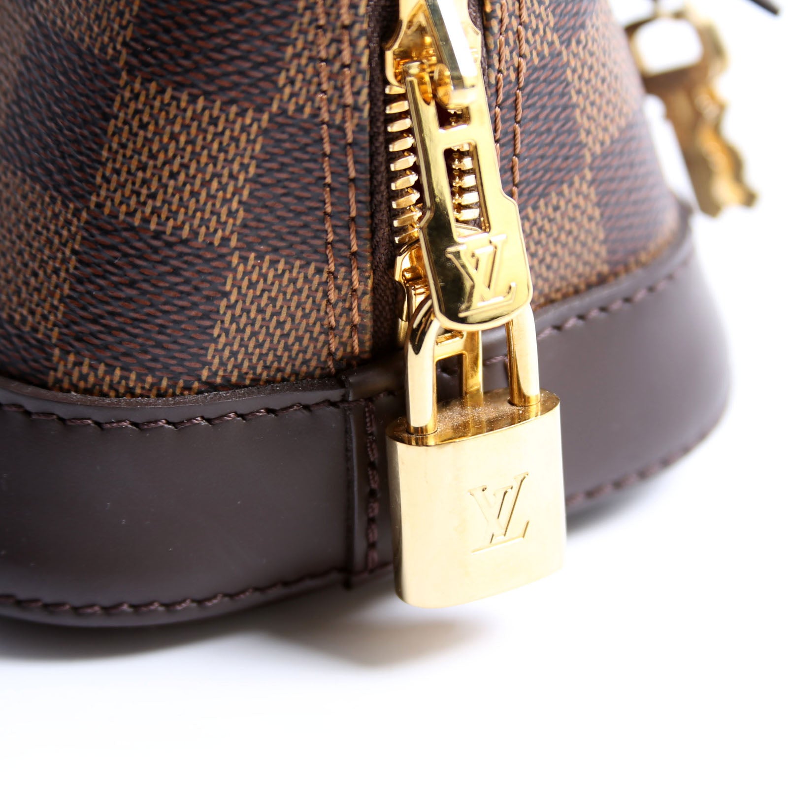 This pre-owned Louis Vuitton Alma BB is guaranteed 100% authentic. The exterior is in the classic Louis Vuitton Damier Ebene coated canvas.
