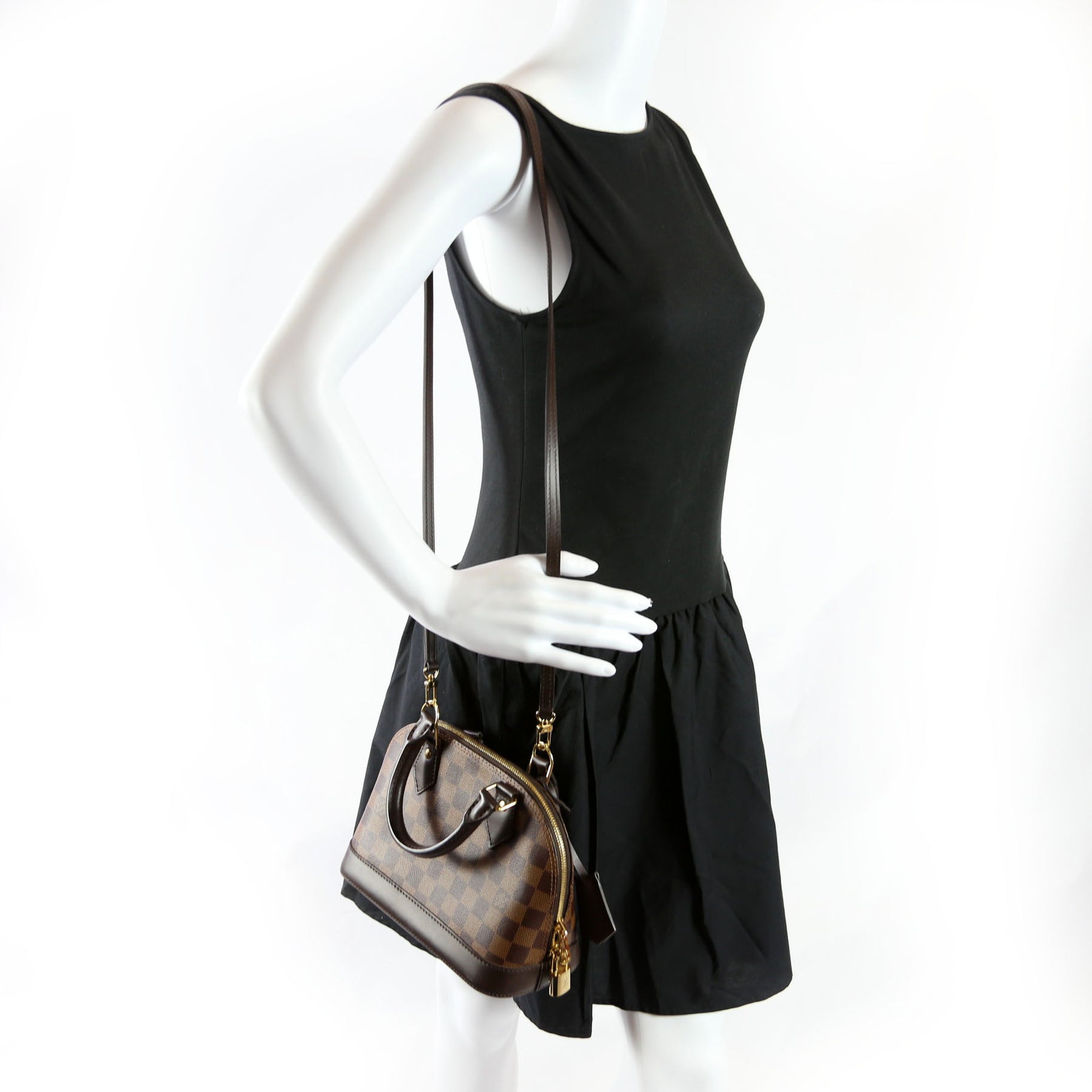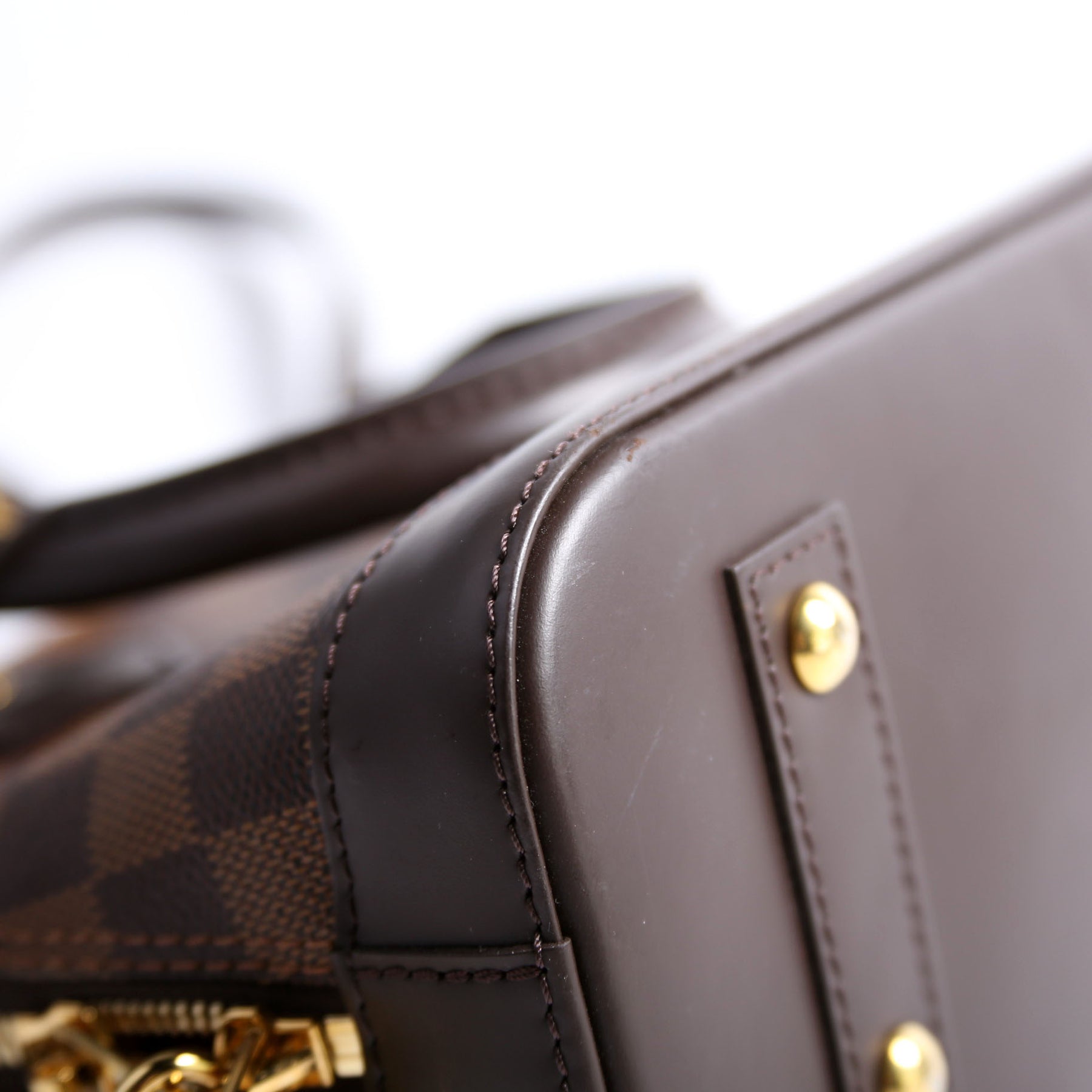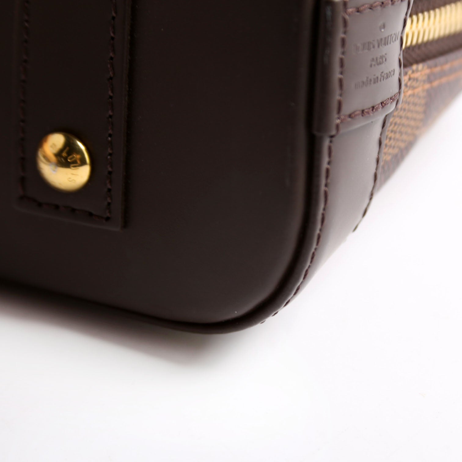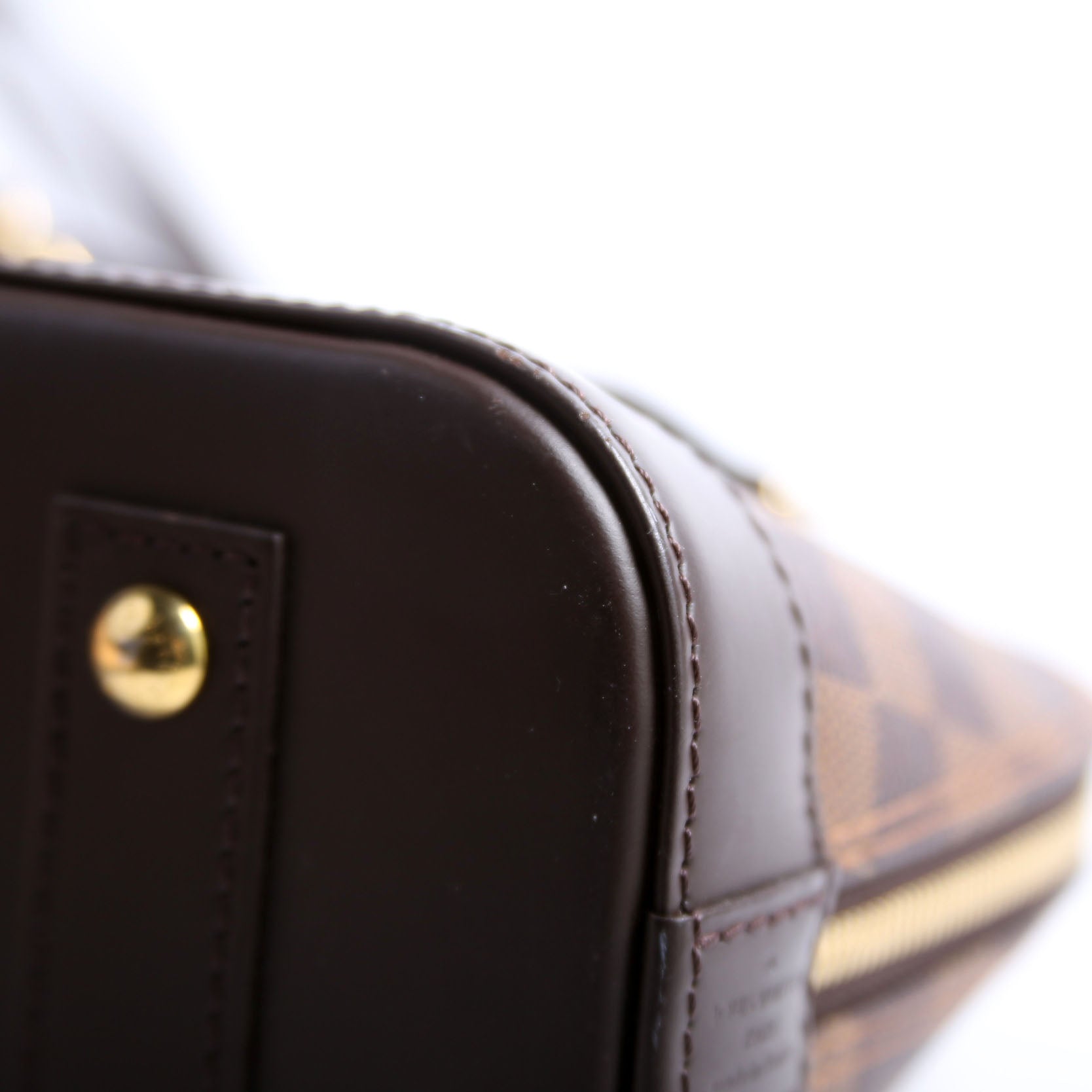This pre-owned Louis Vuitton Alma BB is guaranteed 100% authentic. The exterior is in the classic Louis Vuitton Damier Ebene coated canvas.