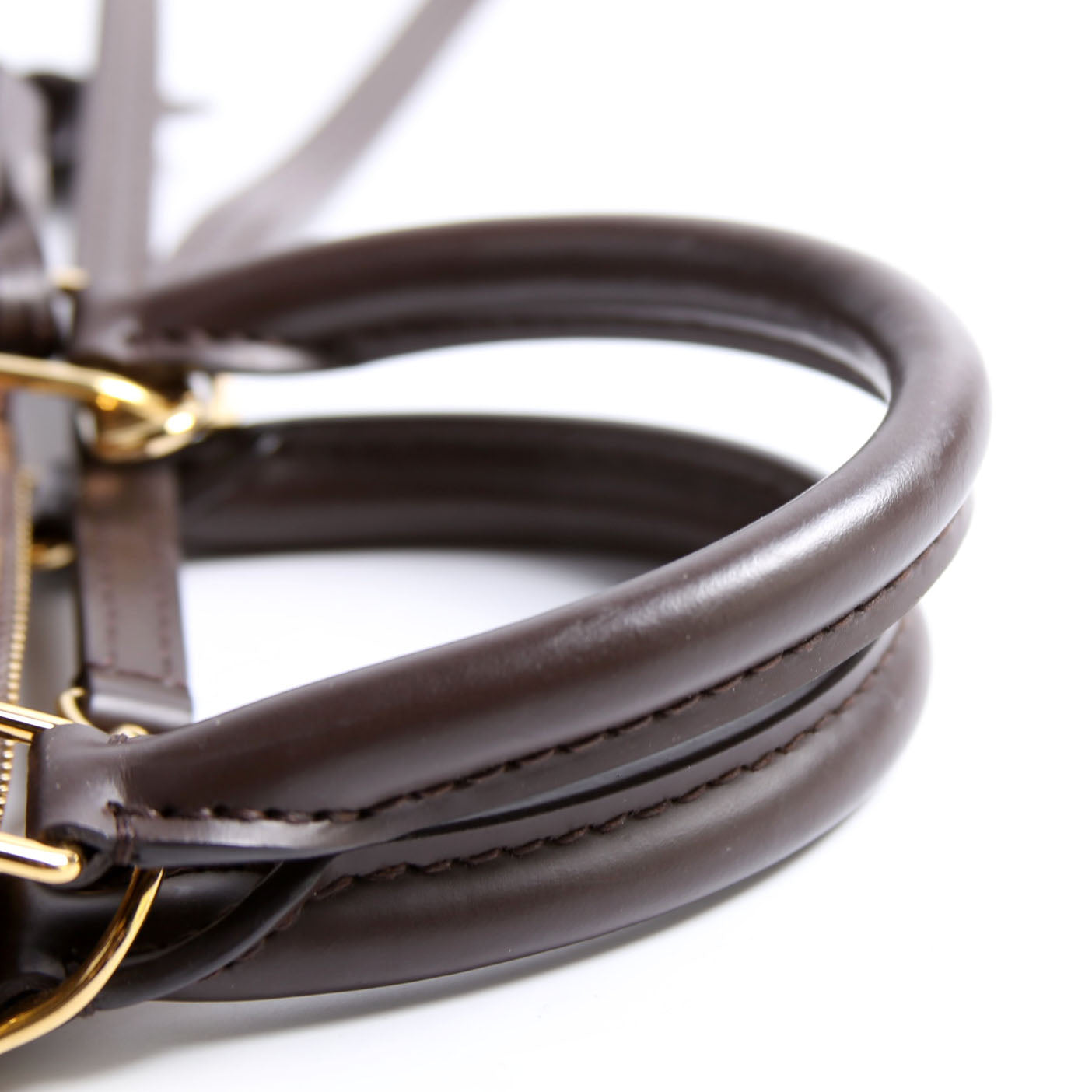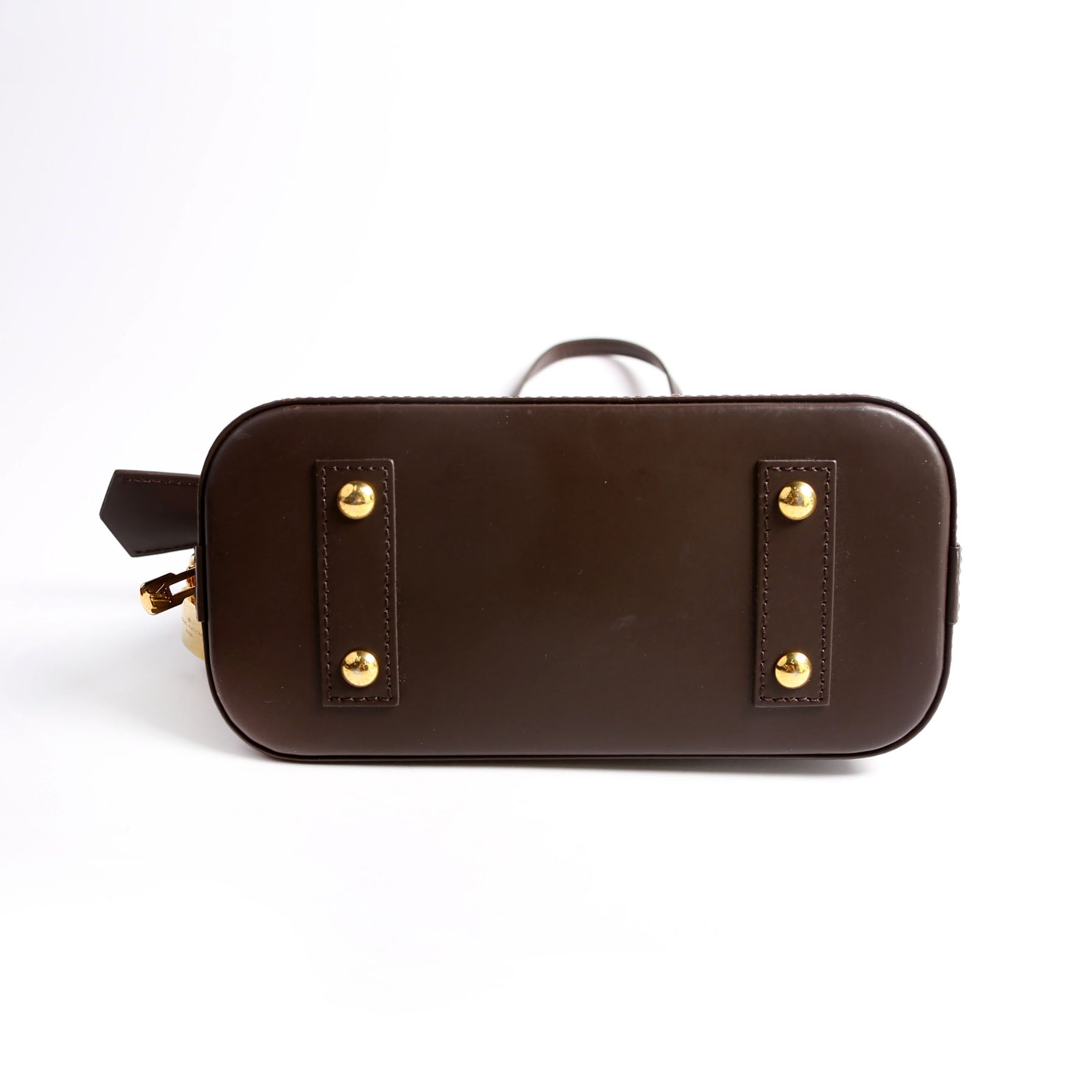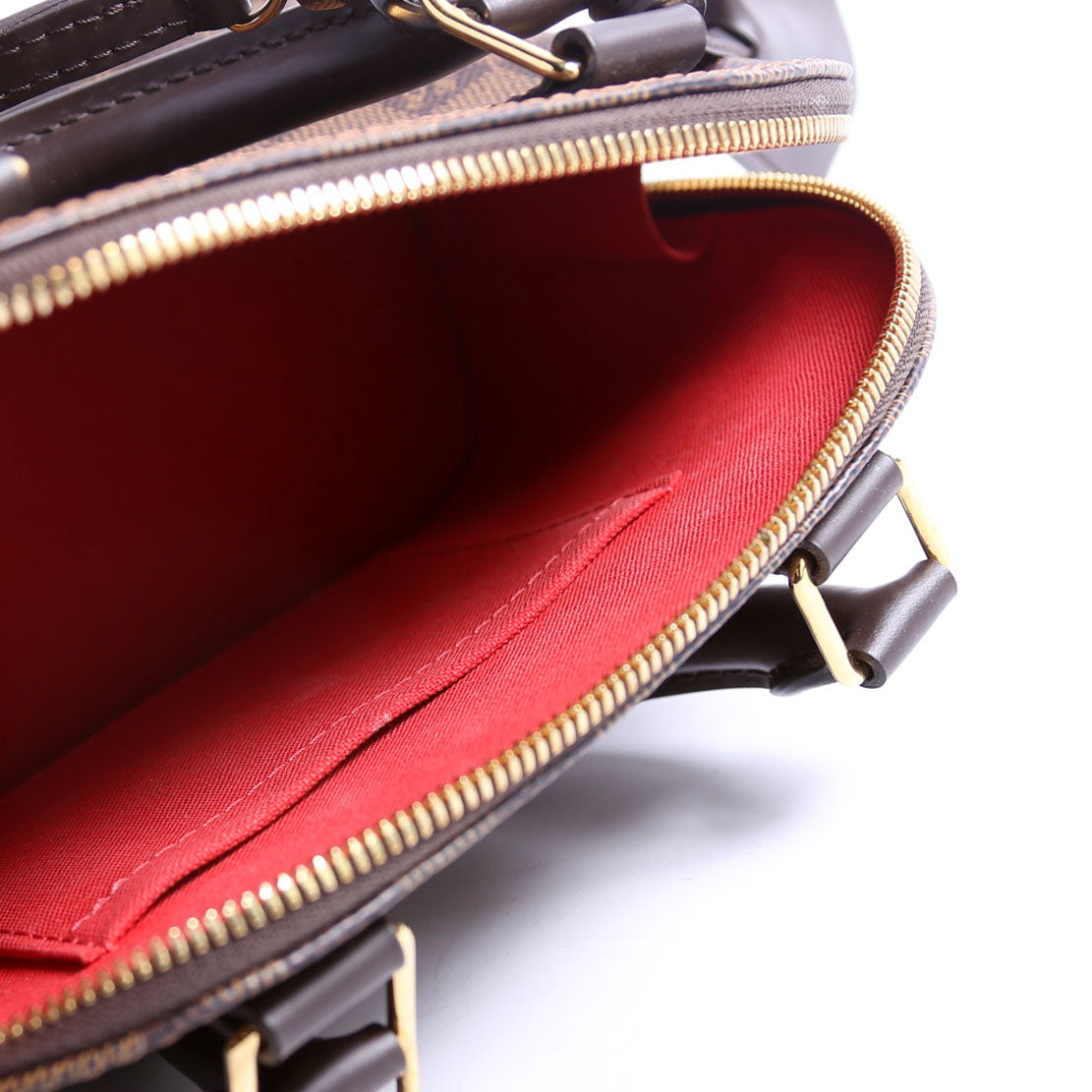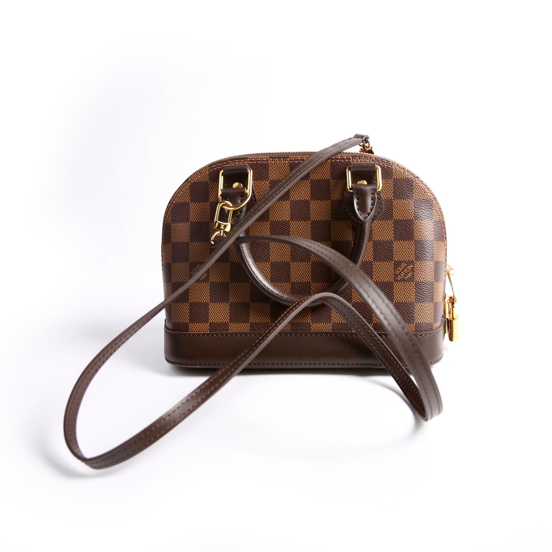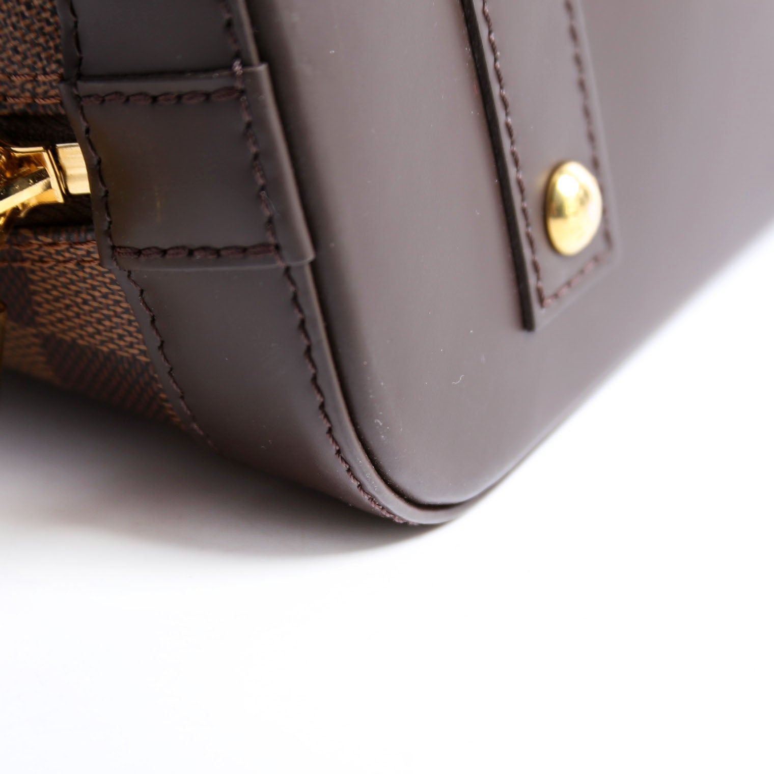 This pre-owned Louis Vuitton Alma BB is guaranteed 100% authentic. The exterior is in the classic Louis Vuitton Damier Ebene coated canvas.