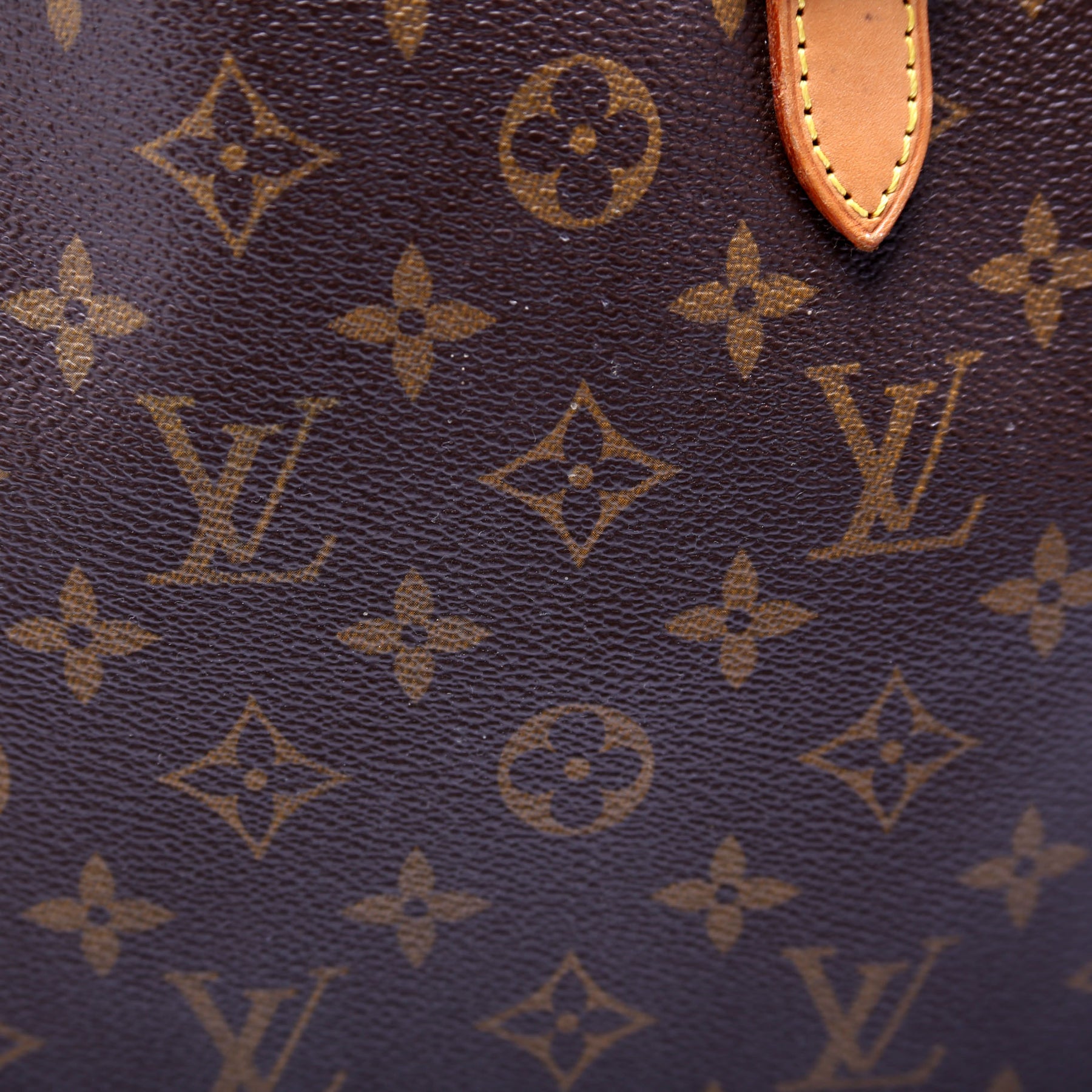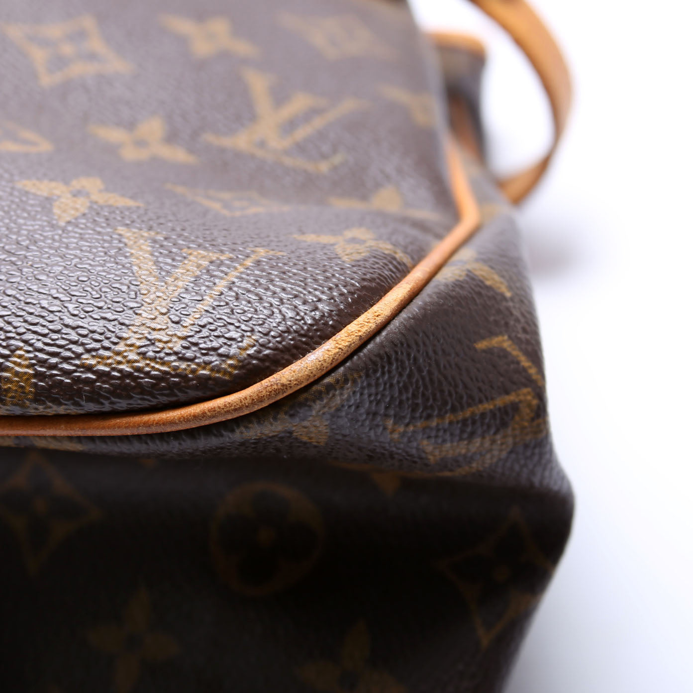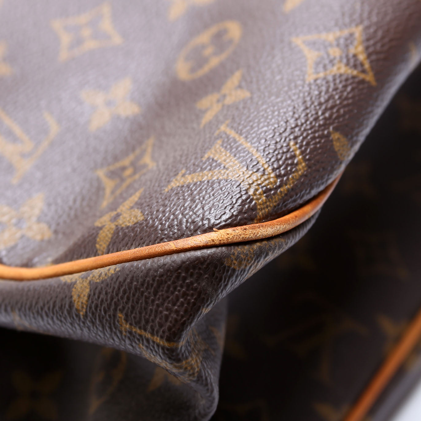 Exterior: The exterior Monogram coated canvas is free of any rips or cracks. The corners and leather details show discoloration and wear as pictured.