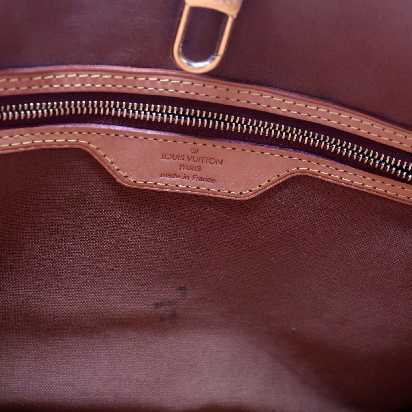 Interior: The interior features one open pocket and one zip closure pocket. There is discoloration and wear to the interior fabric.