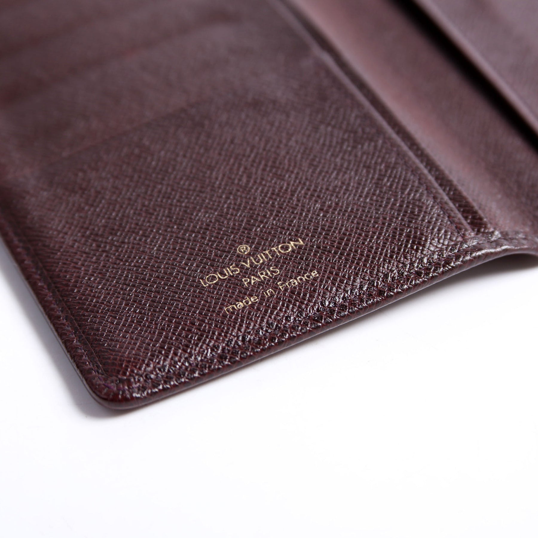 Interior: The interior shows light wear and indentions throughout the leather. It features seven card slots, and three bill slots.