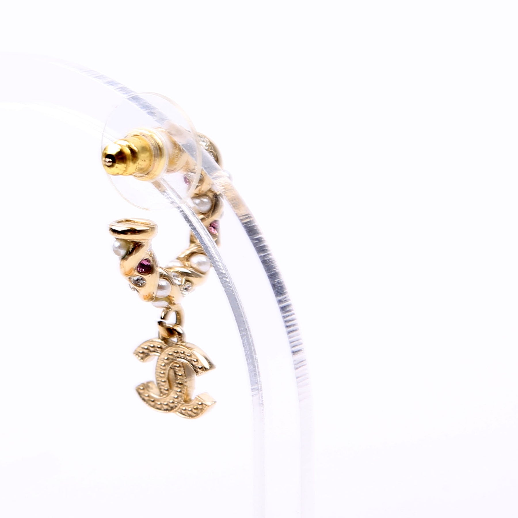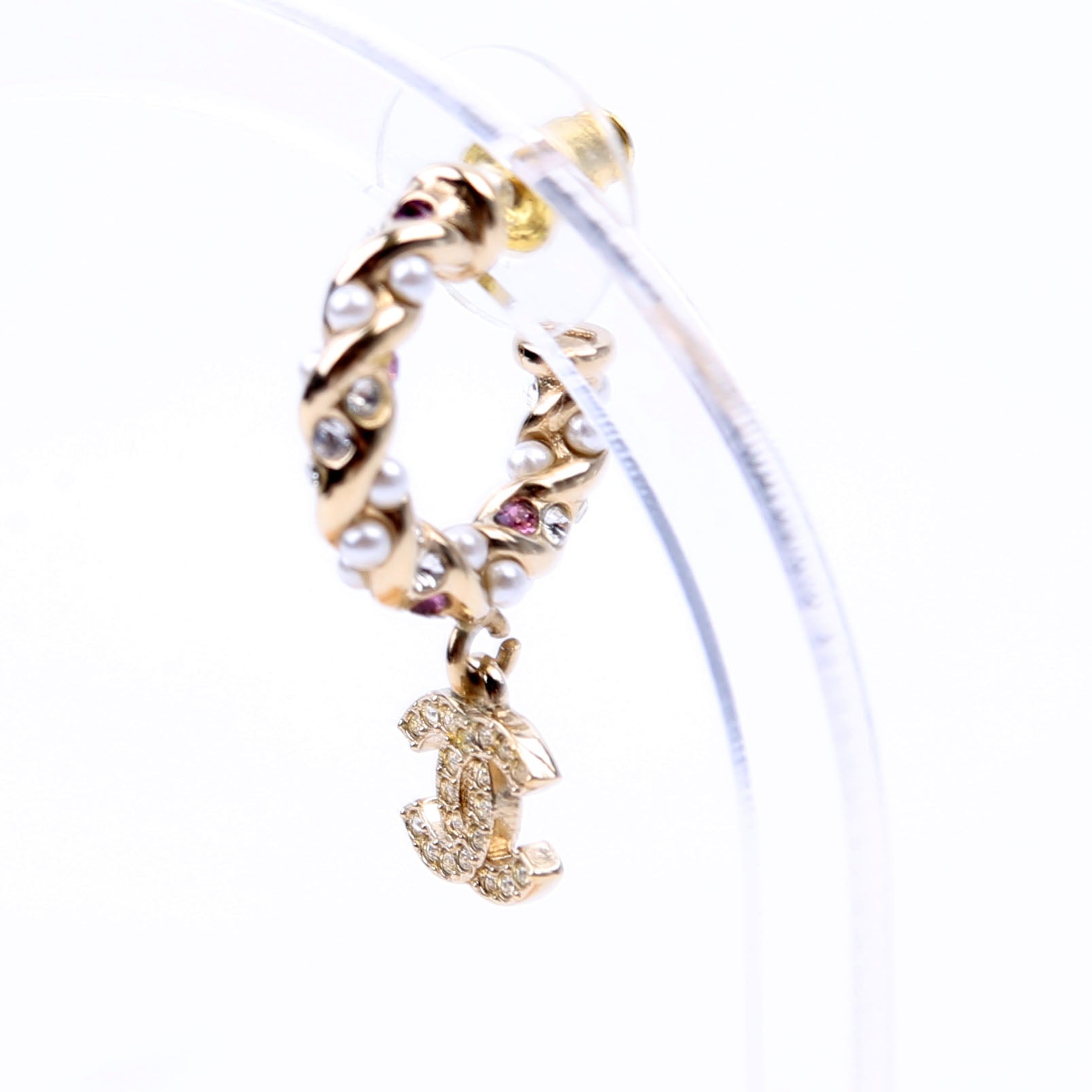 These pre-owned Chanel CC Crystal/Pearl Rope Small Hoop Earrings are guaranteed 100% authentic.