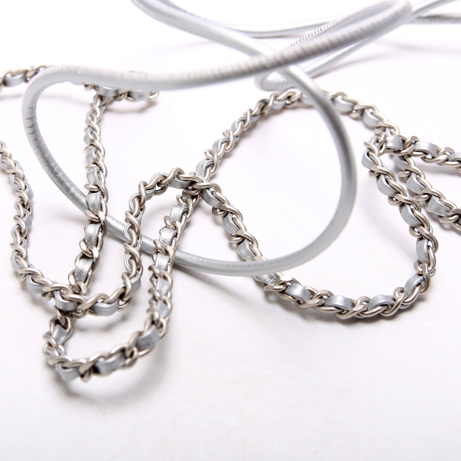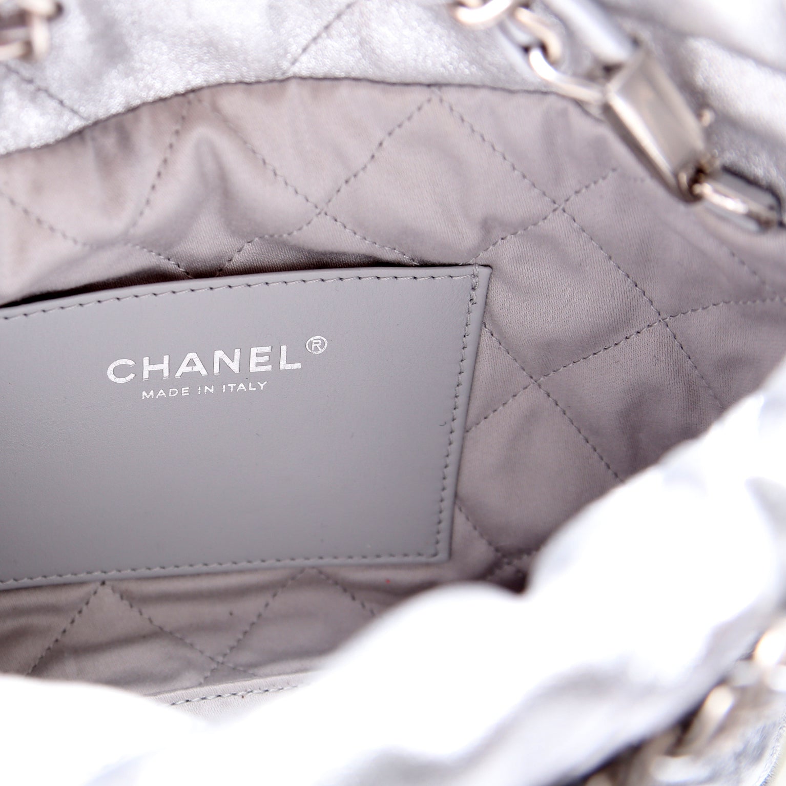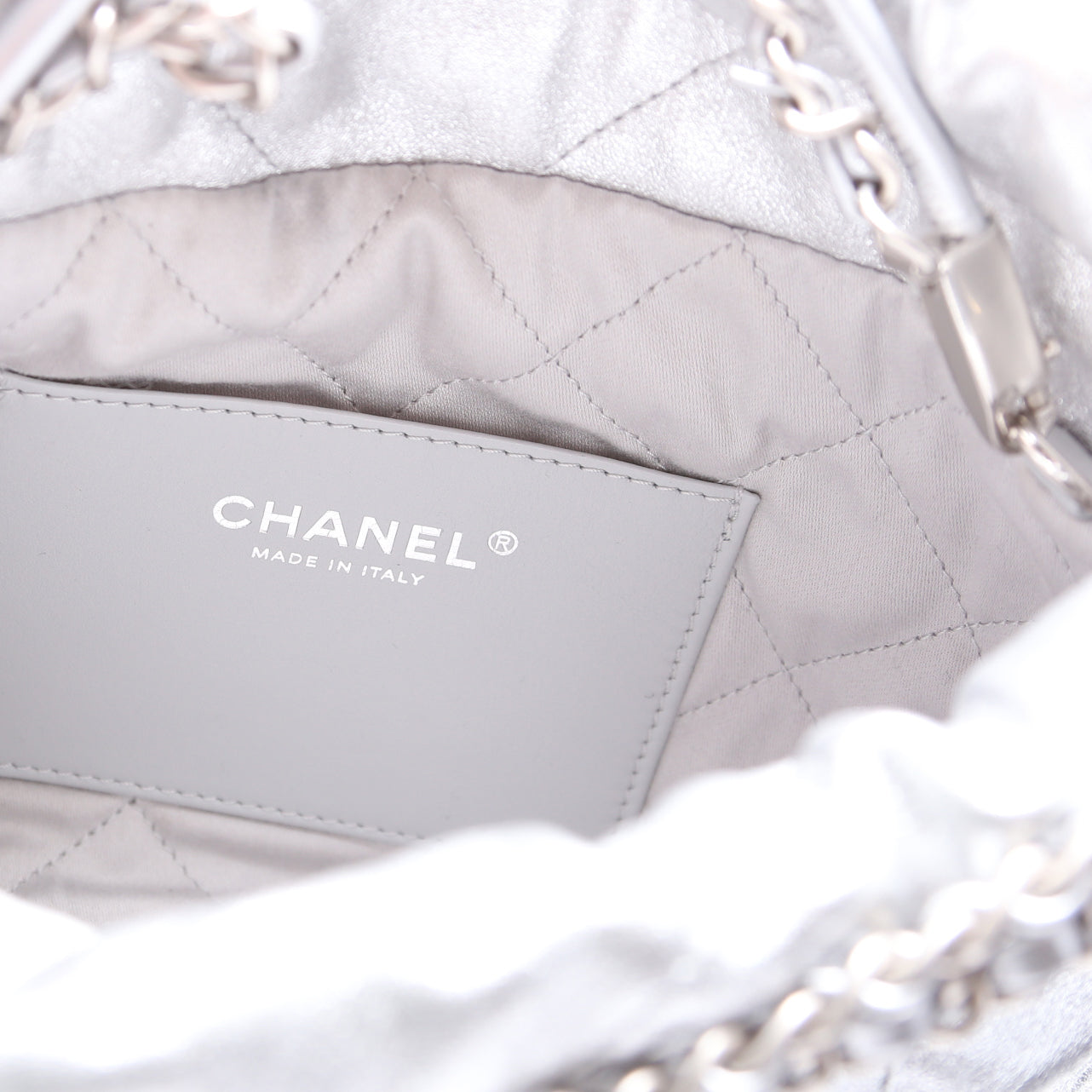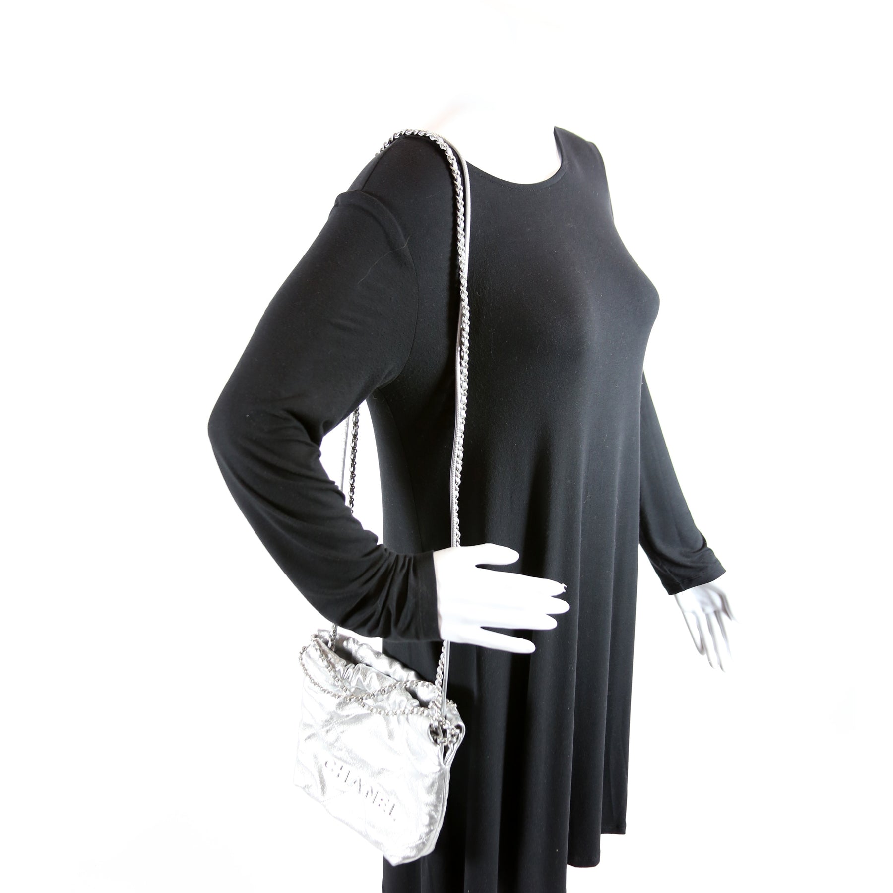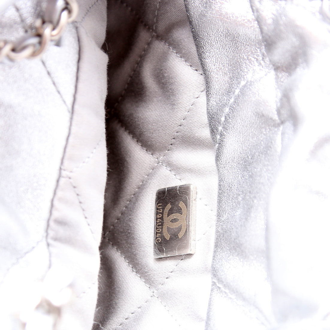 This pre-owned Chanel 22 Mini Metallic Calfskin is guaranteed 100% authentic. The exterior is in the classic Chanel Calfskin leather.