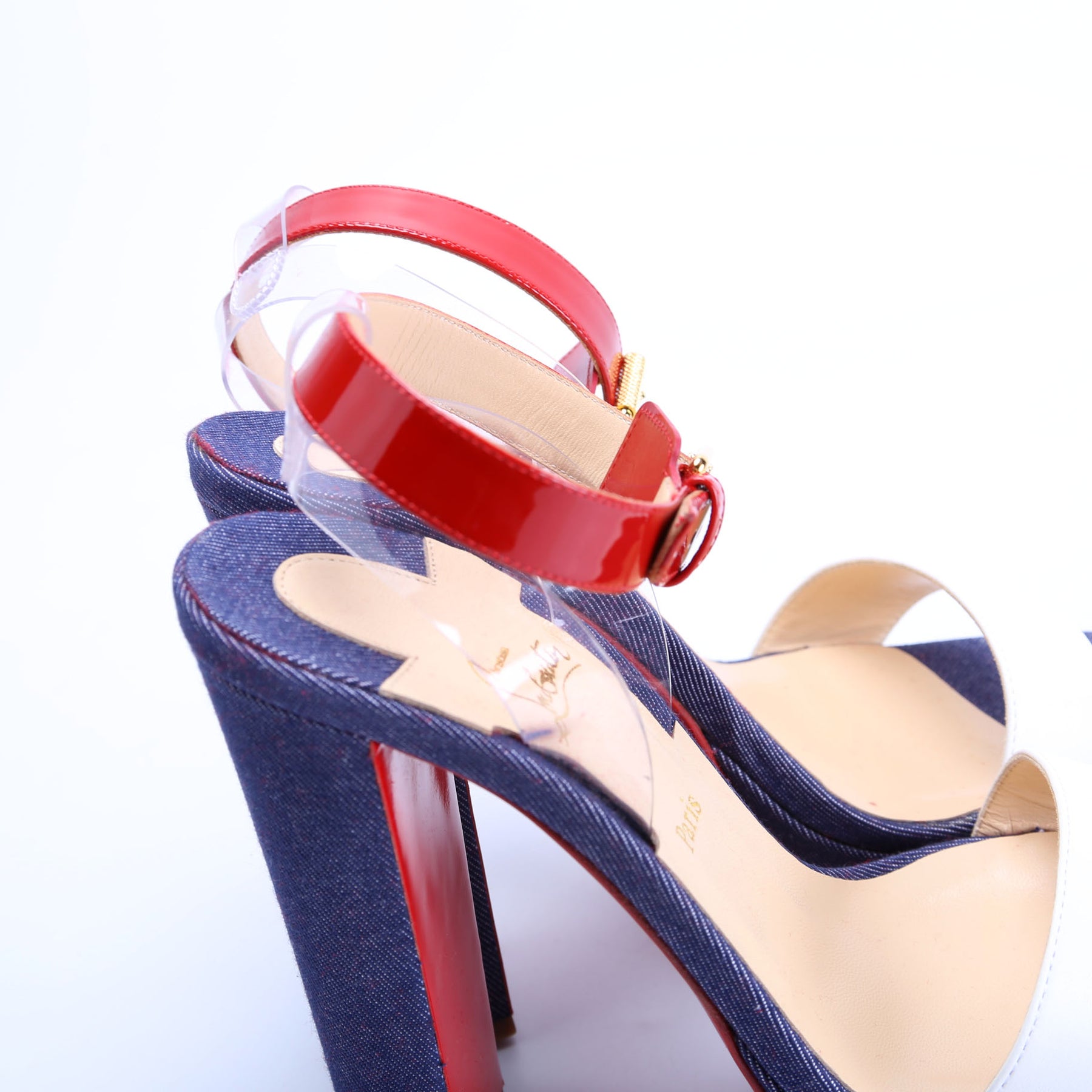 These pre-owned Christian Louboutin Cherry Sandal 140MM Denim/Patent Sandals are guaranteed 100% authentic.