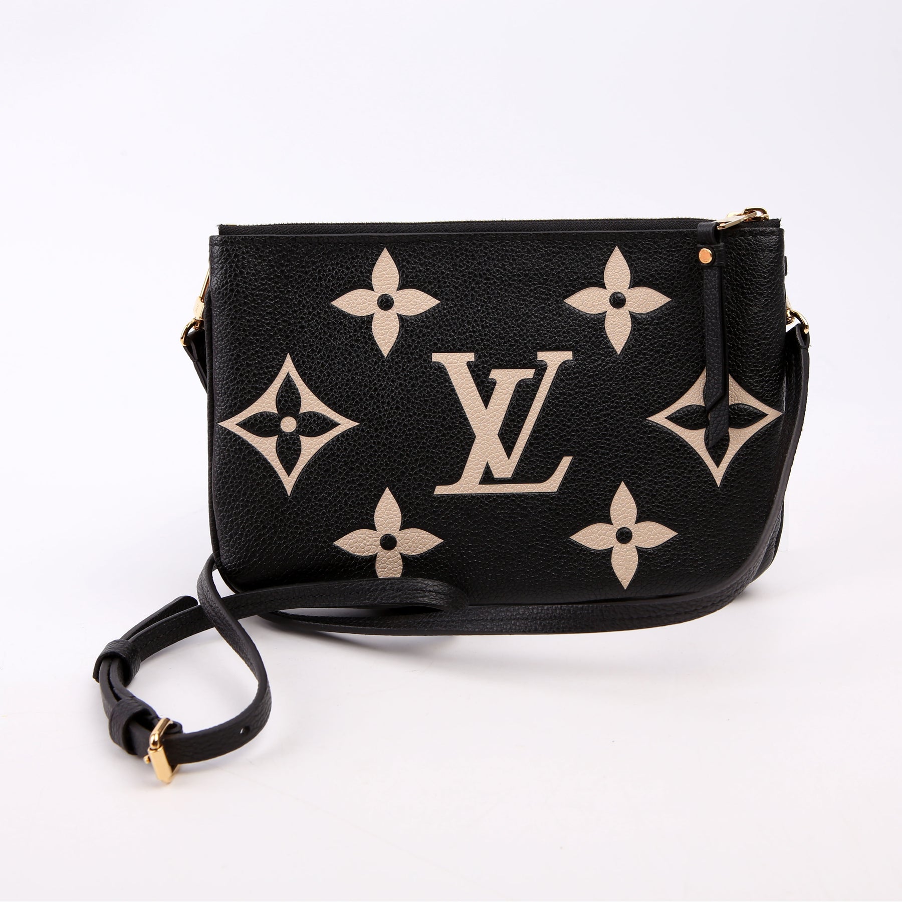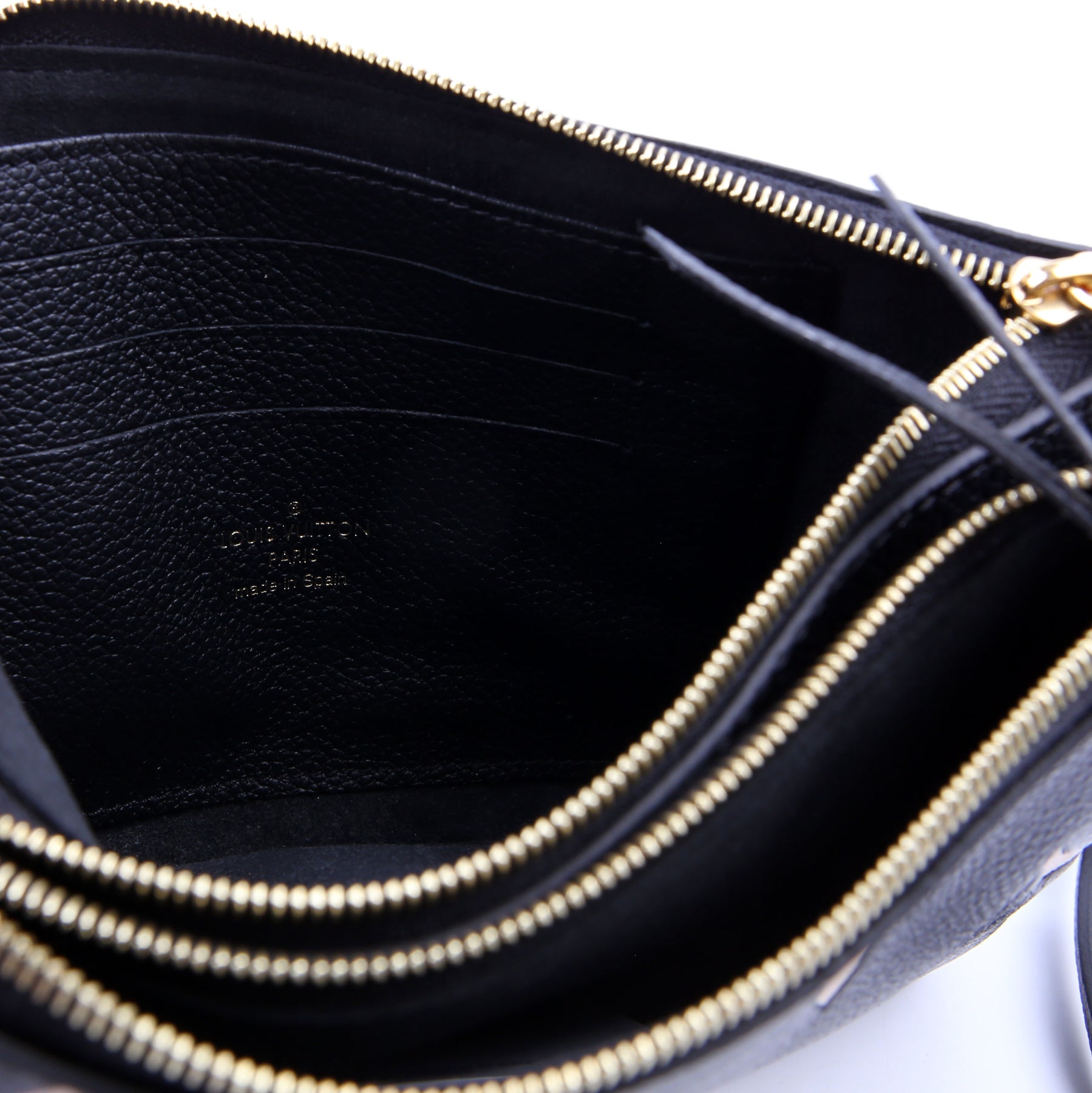 This pre-owned Louis Vuitton Double Zip Pochette guaranteed 100% authentic. The exterior is in the classic Louis Vuitton Empreinte leather.