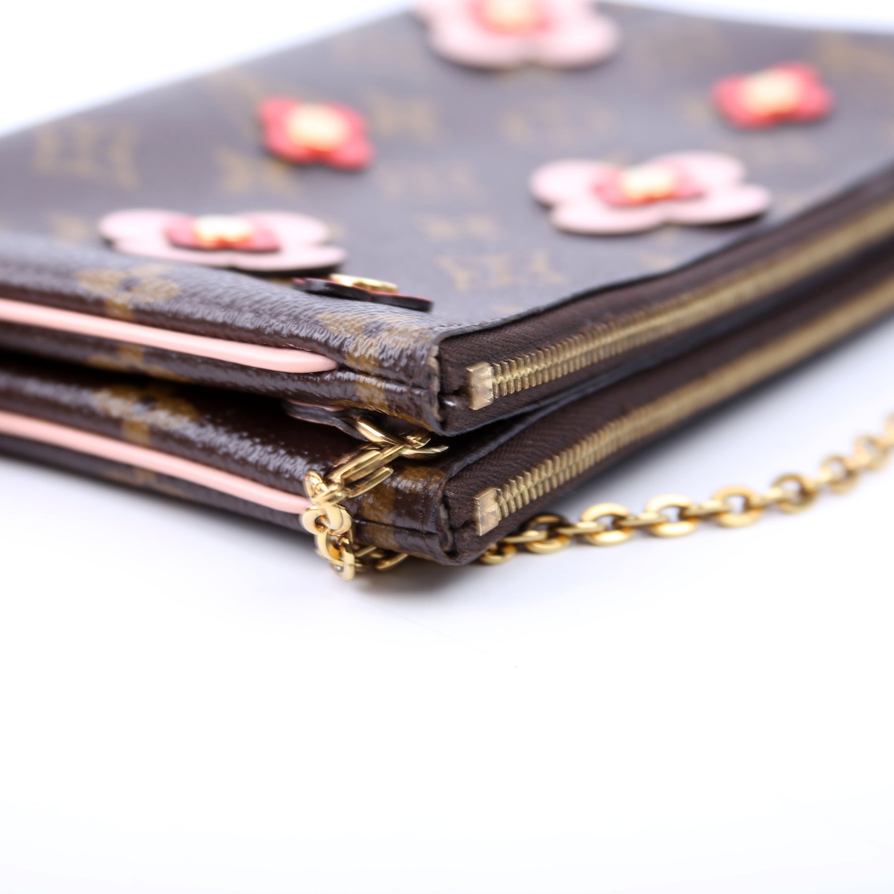 This pre-owned Louis Vuitton Double Zip Pochette Blooming Flowers is guaranteed 100% authentic. The exterior is in the classic Louis Vuitton Monogram coated canvas.
