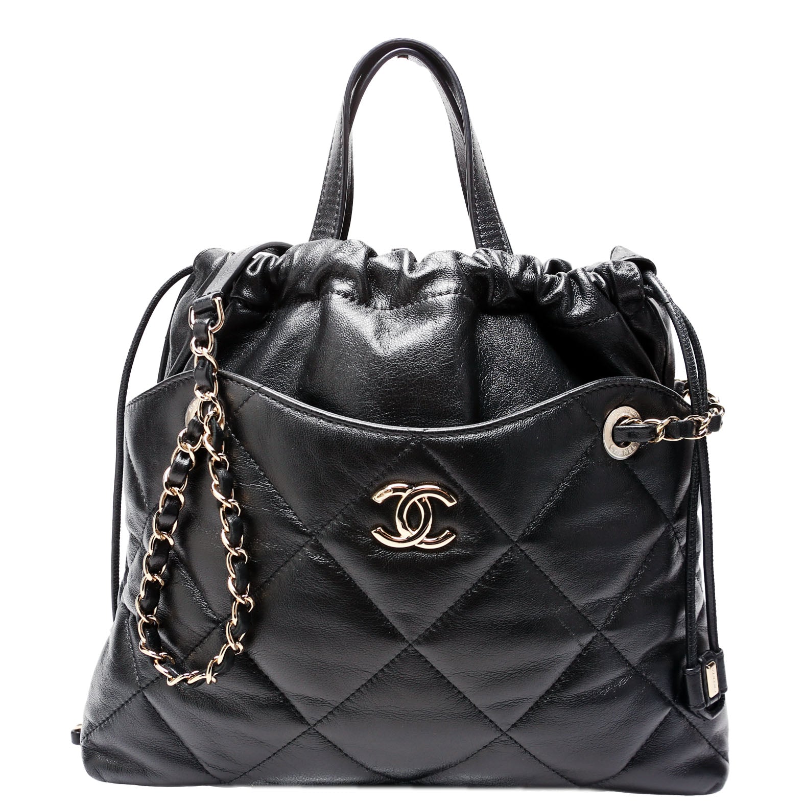 This pre-owned Chanel Drawstring Shopping Bag Small Lambskin is guaranteed 100% authentic.