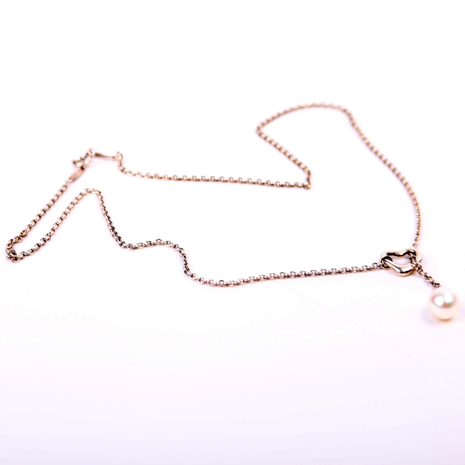 This pre-owned Tiffany & Co. Elsa Peretti Open Heart Pearl Lariat 7.5-8MM 925 Necklace is guaranteed 100% authentic.