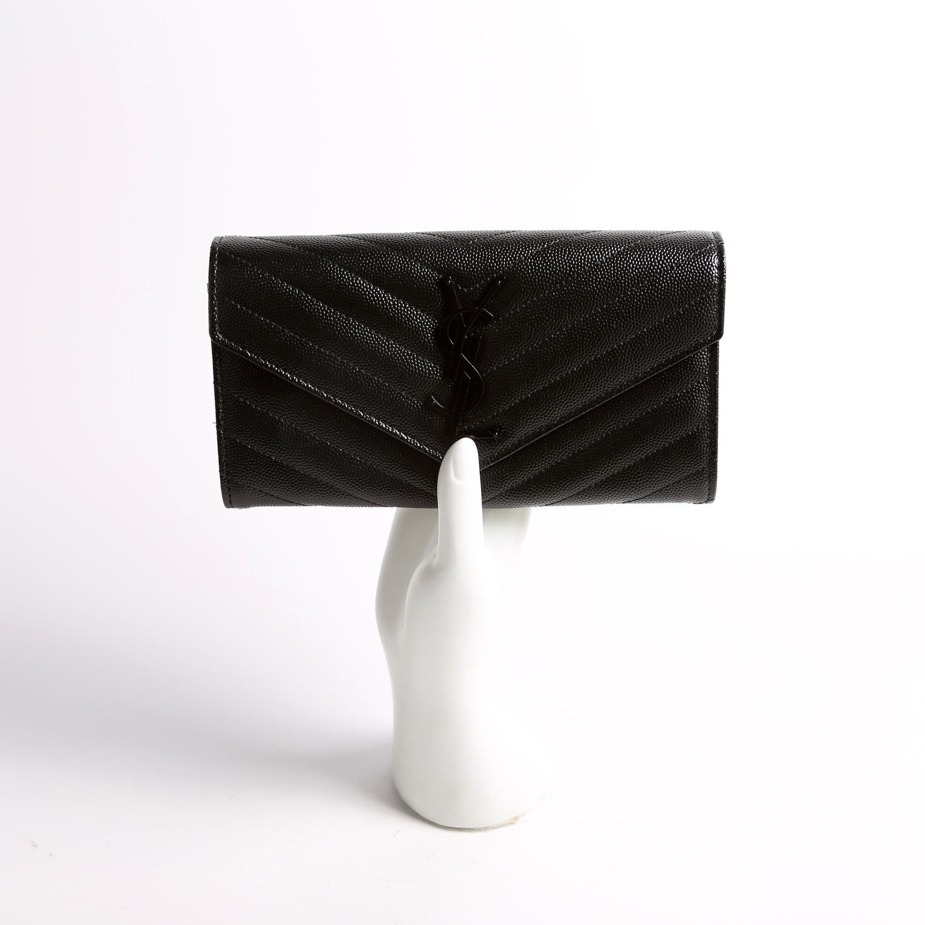 This pre-owned Saint Laurent Flap Wallet Large is guaranteed 100% authentic. The exterior is in the classic Saint Laurent Grain De Poudre leather.