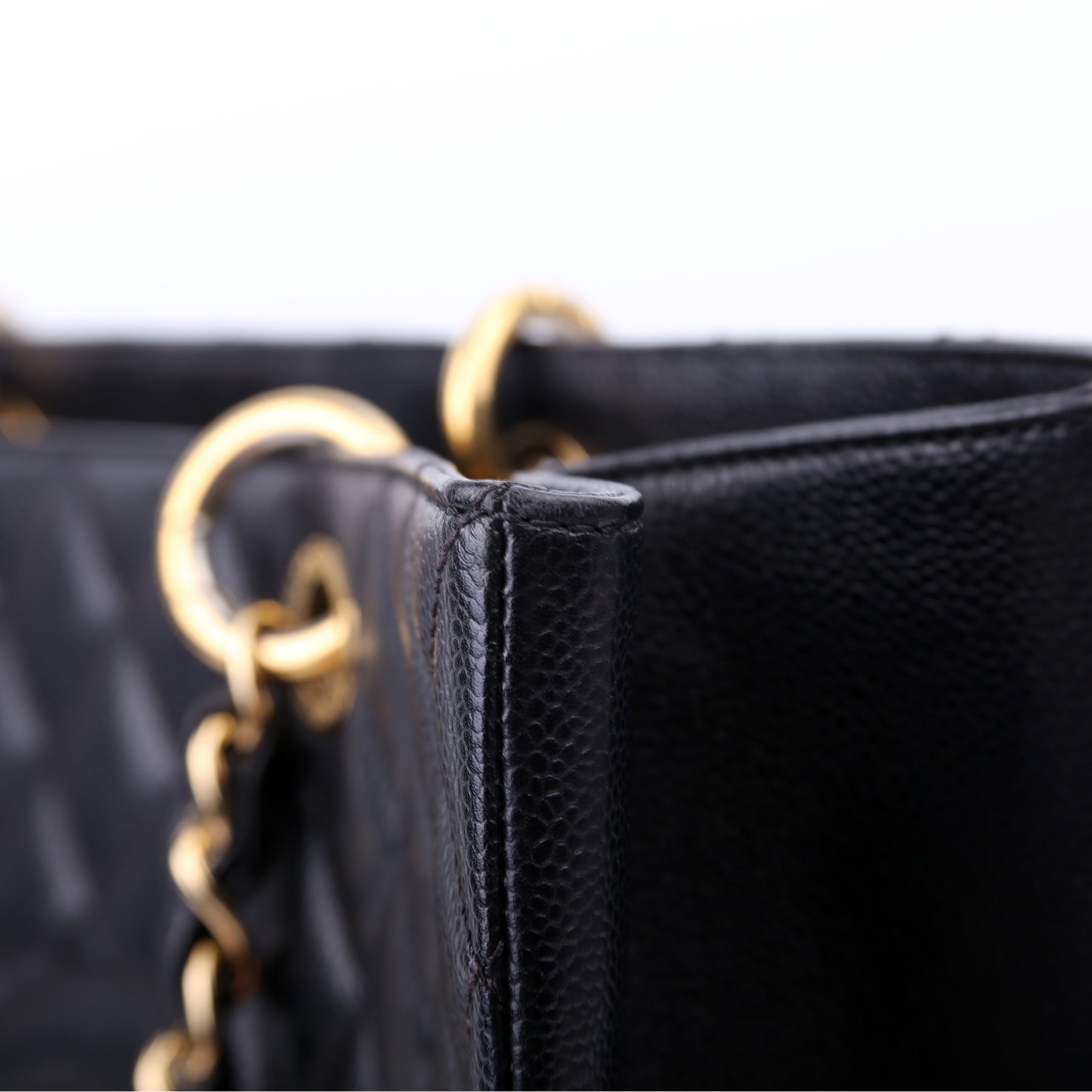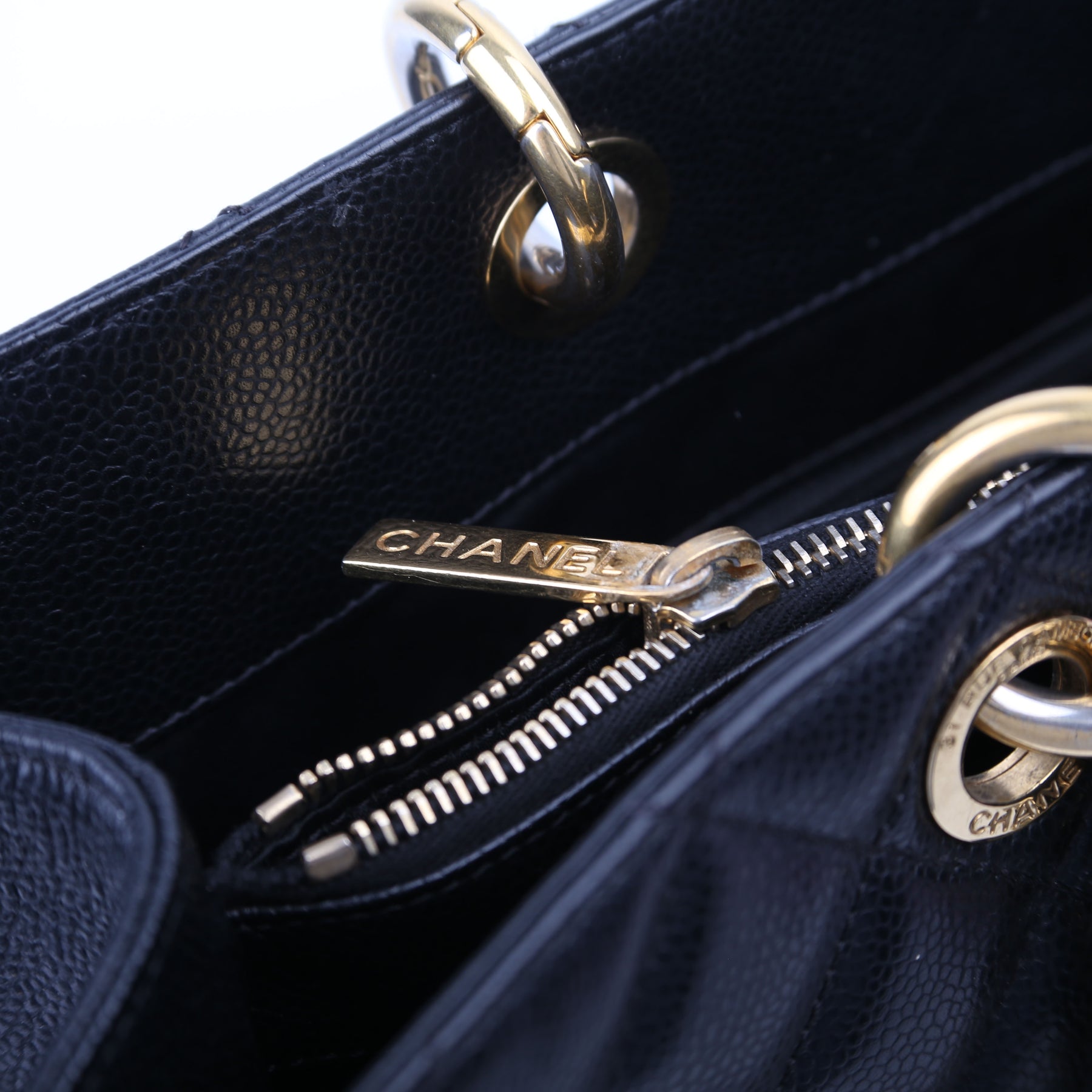 This pre-owned Chanel Grand Shopping Tote XL is guaranteed 100% authentic. The exterior is in the classic Chanel Caviar leather.