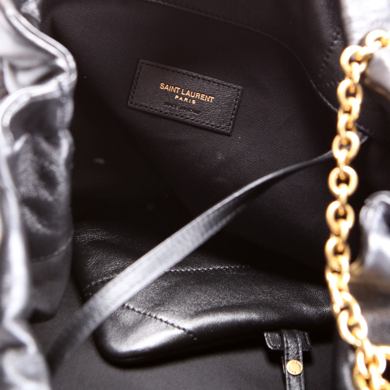 This pre-owned Saint Laurent Jamie Large Pochon is guaranteed 100% authentic. The exterior is in the classic Saint Laurent Lambskin leather.