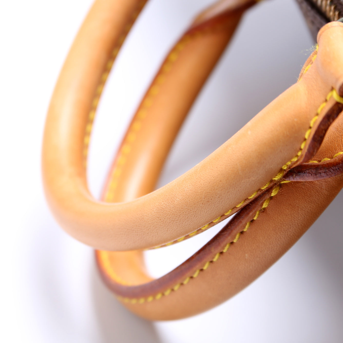 Exterior: The exterior coated canvas is free of any rips or cracks. The leather details show wear and discoloration throughout.