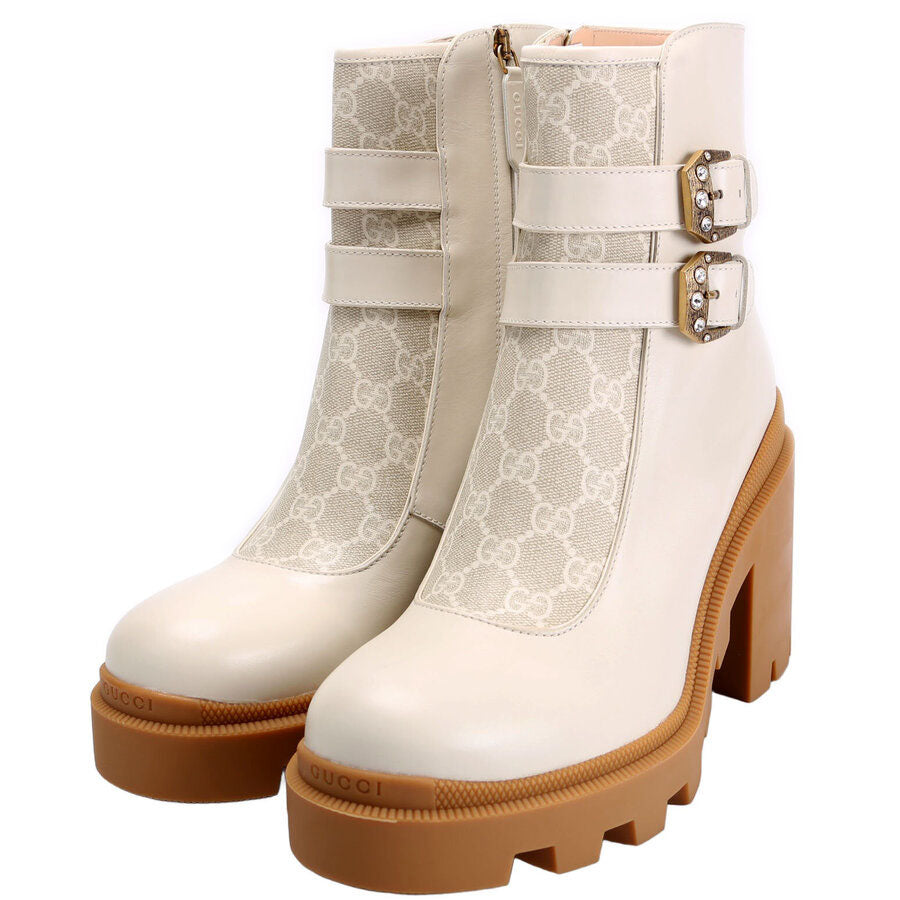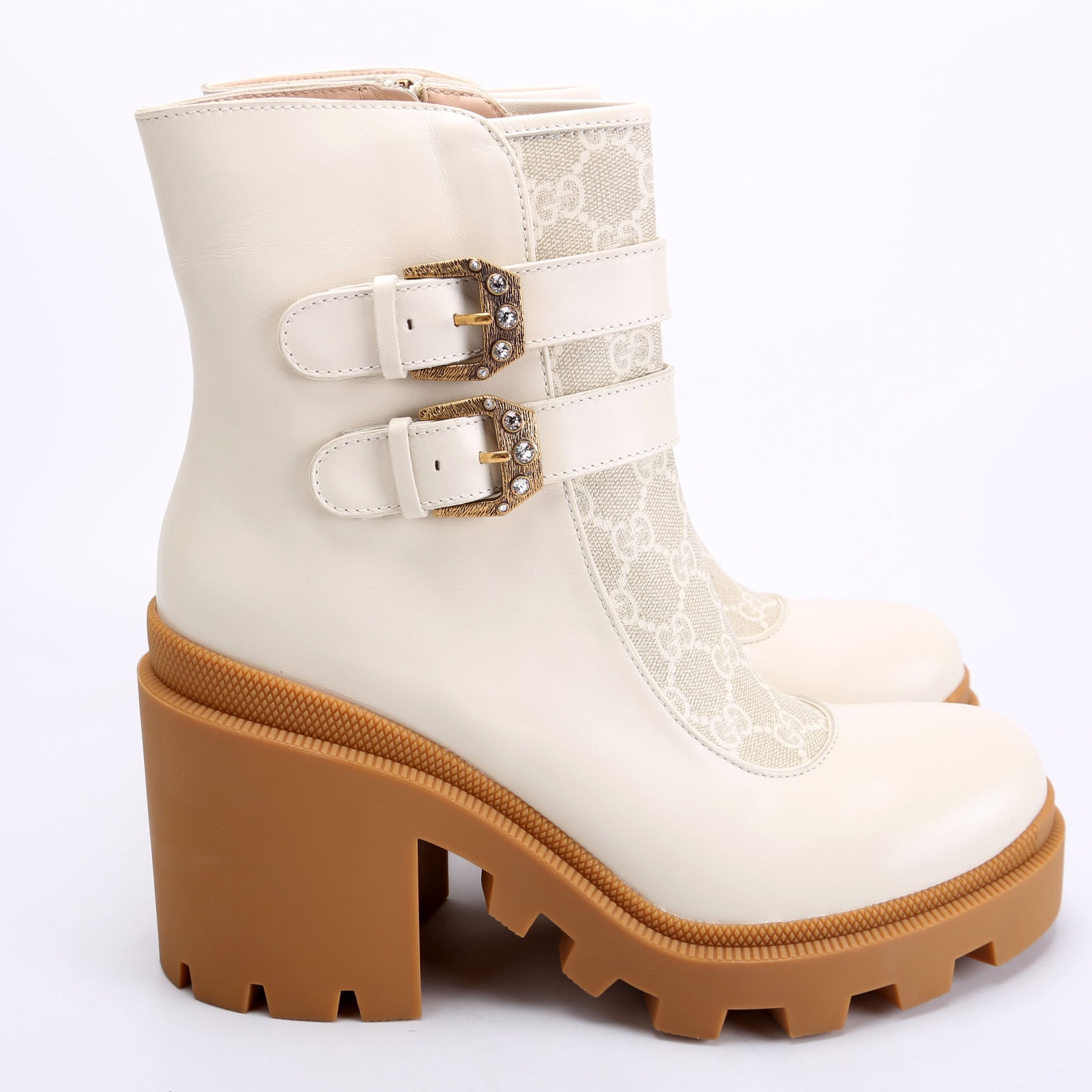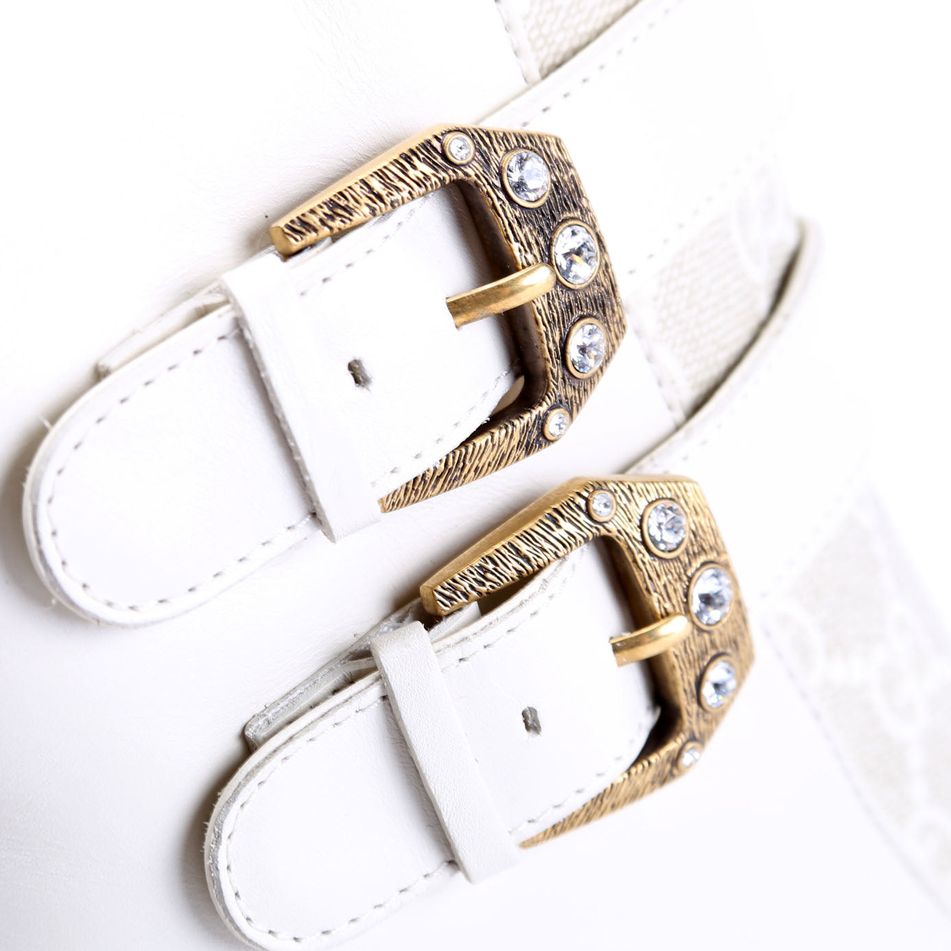 These pre-owned Gucci Kensington GG Double Buckle Ankle Boots are guaranteed 100% authentic.