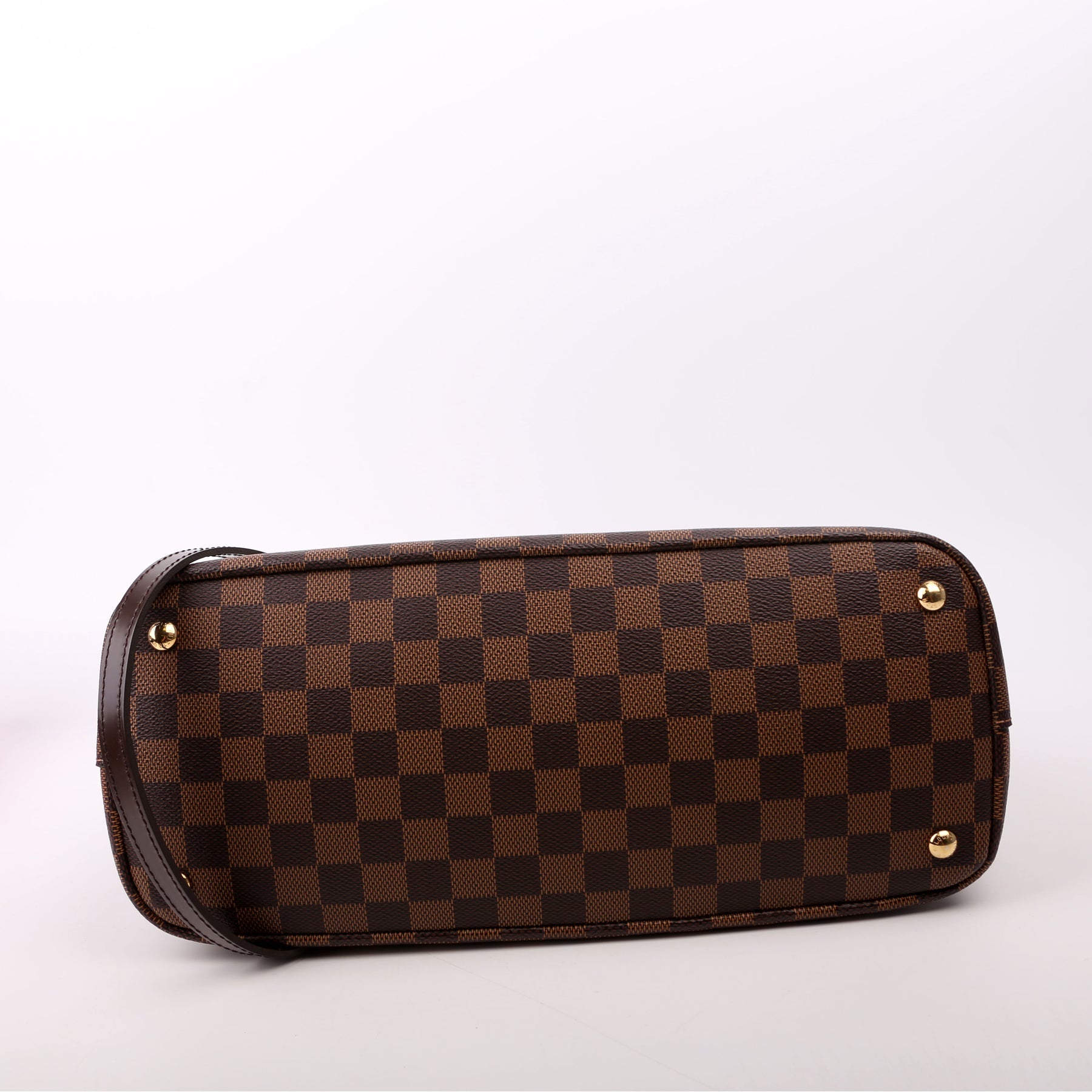 This pre-owned Louis Vuitton Kensington Bowling Bag is guaranteed 100% authentic. The exterior is in the classic Louis Vuitton Damier Ebene coated canvas.
