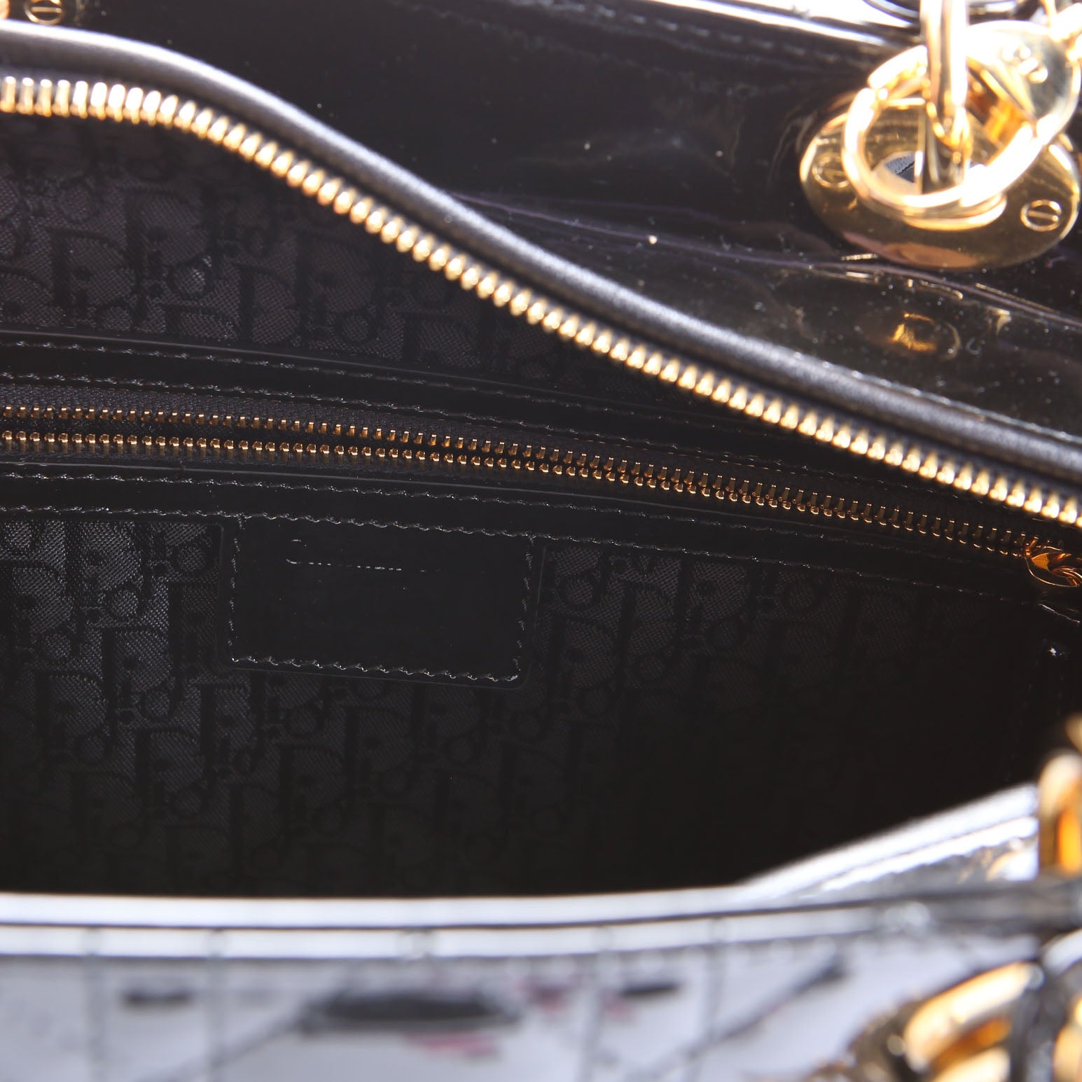 This pre-owned Lady Dior Large is guaranteed 100% authentic. The exterior is in the classic patent leather.