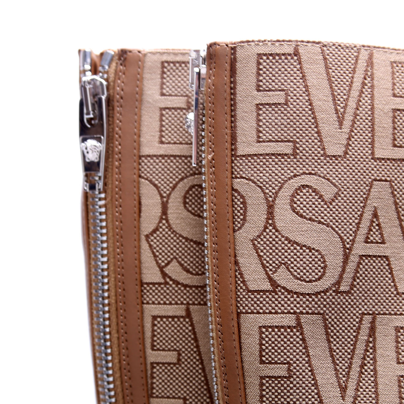 These pre-owned Versace Logo All Over Knee High Boots are guaranteed 100% authentic.