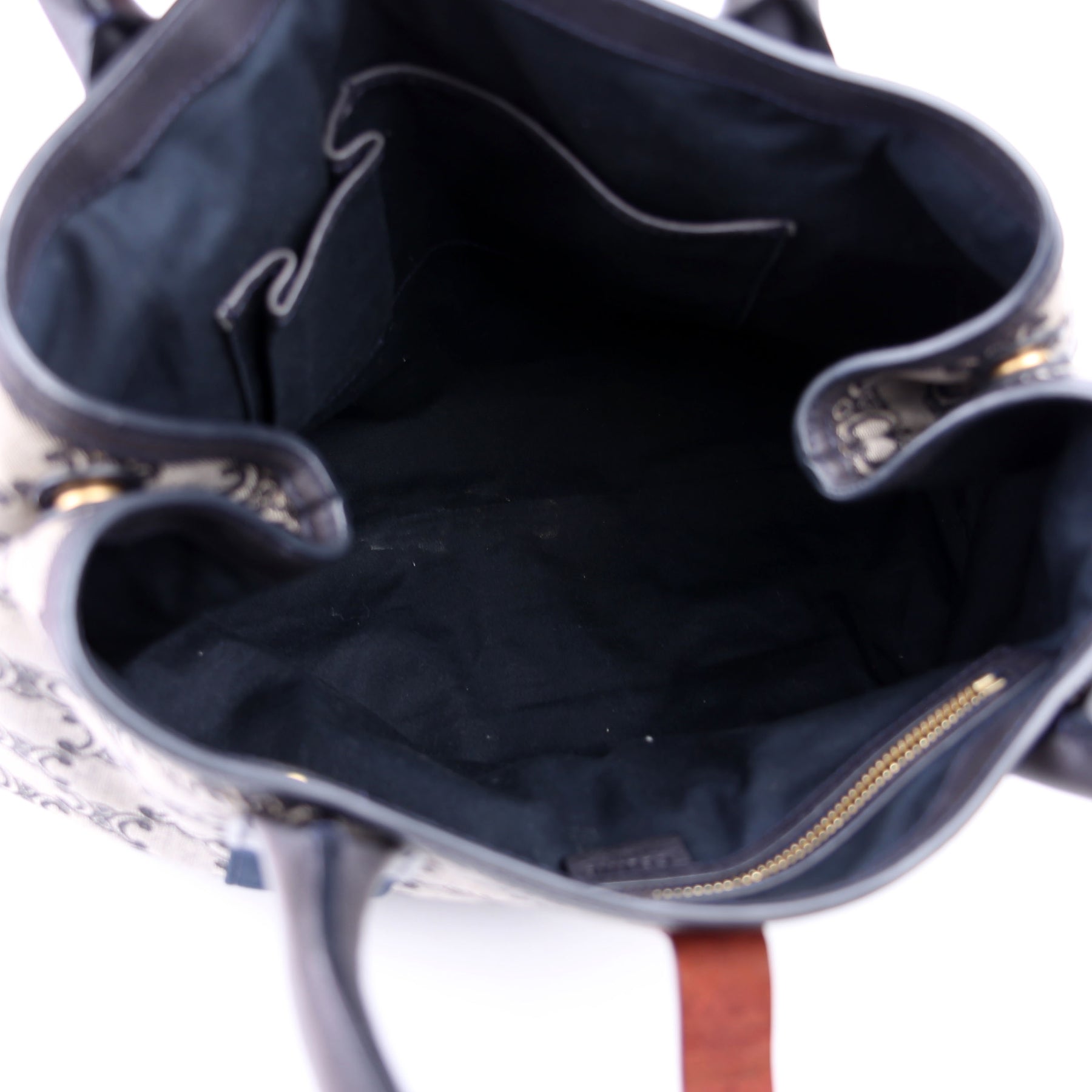 Interior: The interior has minor stains throughout, and it features two open pockets and one zip closure pocket.
