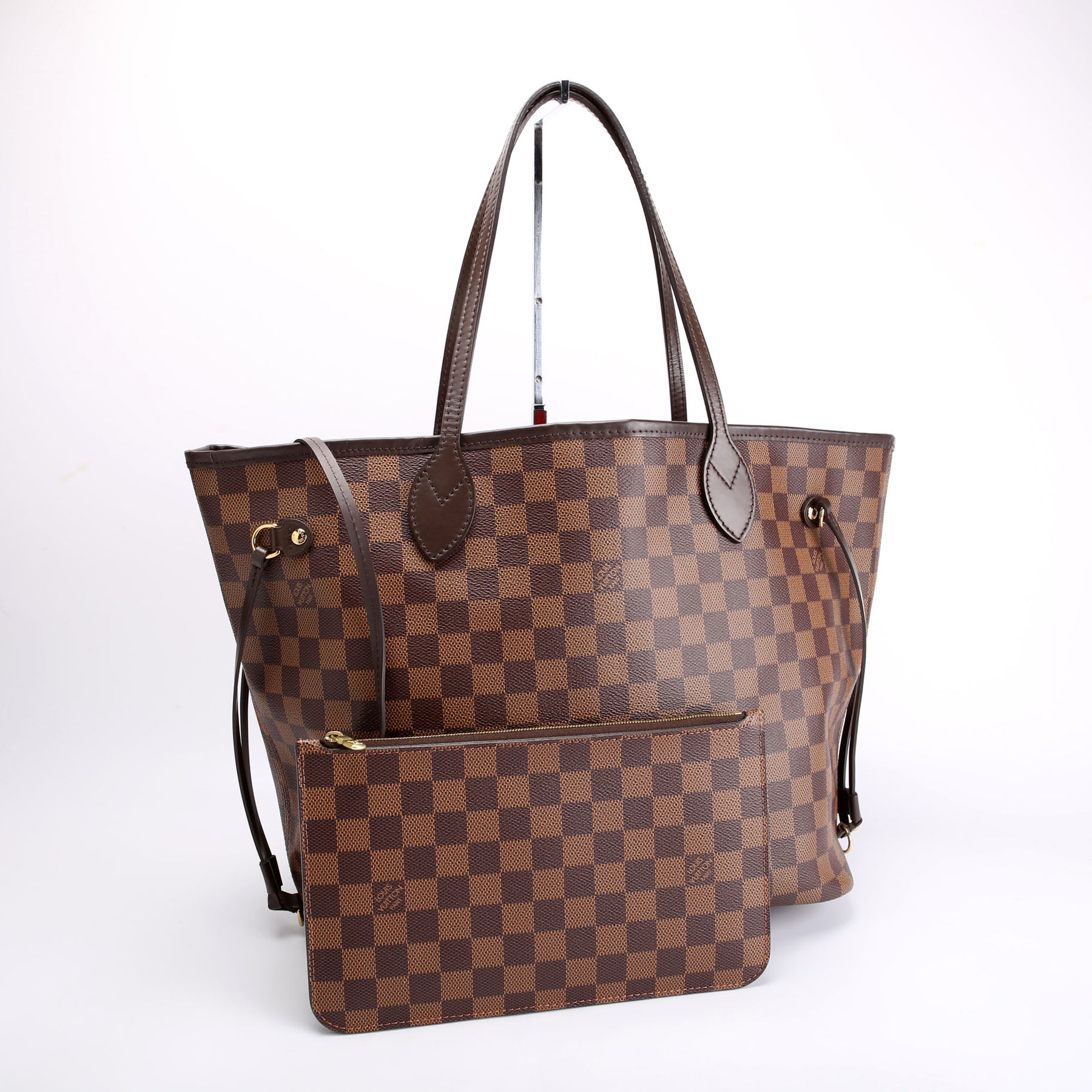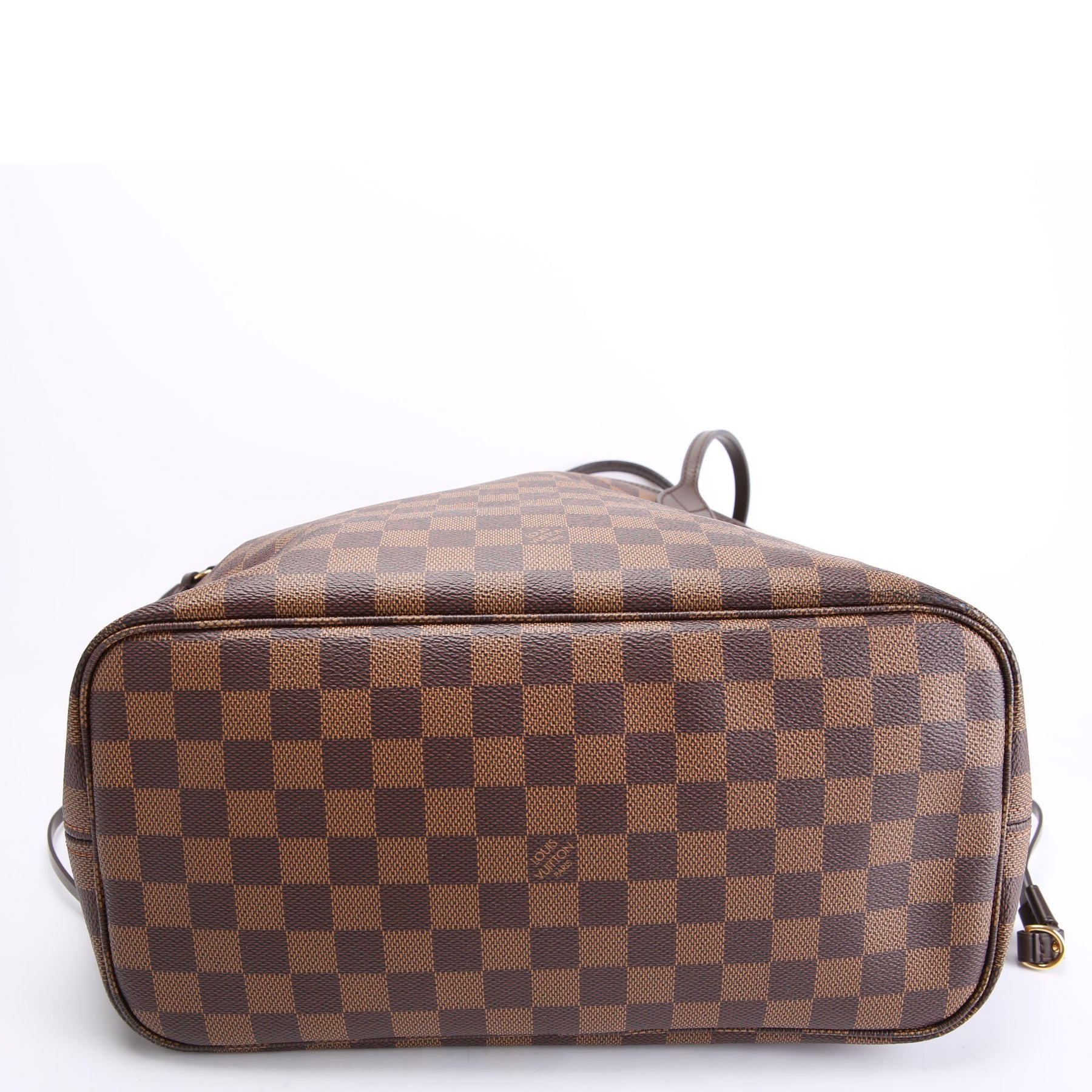 This pre-owned Louis Vuitton Neverfull With Wallet MM is guaranteed 100% authentic. The exterior is in the classic Louis Vuitton Damier Ebene coated canvas.