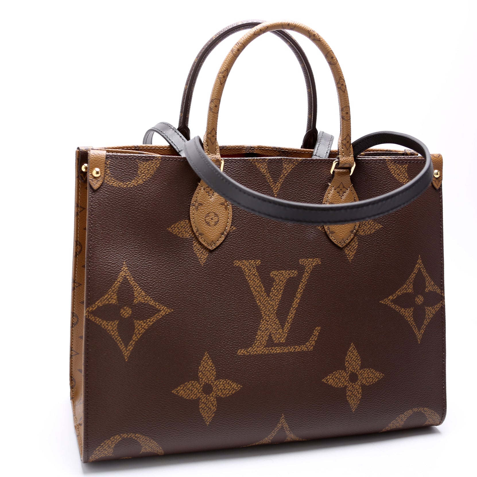 This pre-owned Louis Vuitton ONTHEGO MM is guaranteed 100% authentic. The exterior is in the classic Louis Vuitton Reverse Monogram coated canvas.
