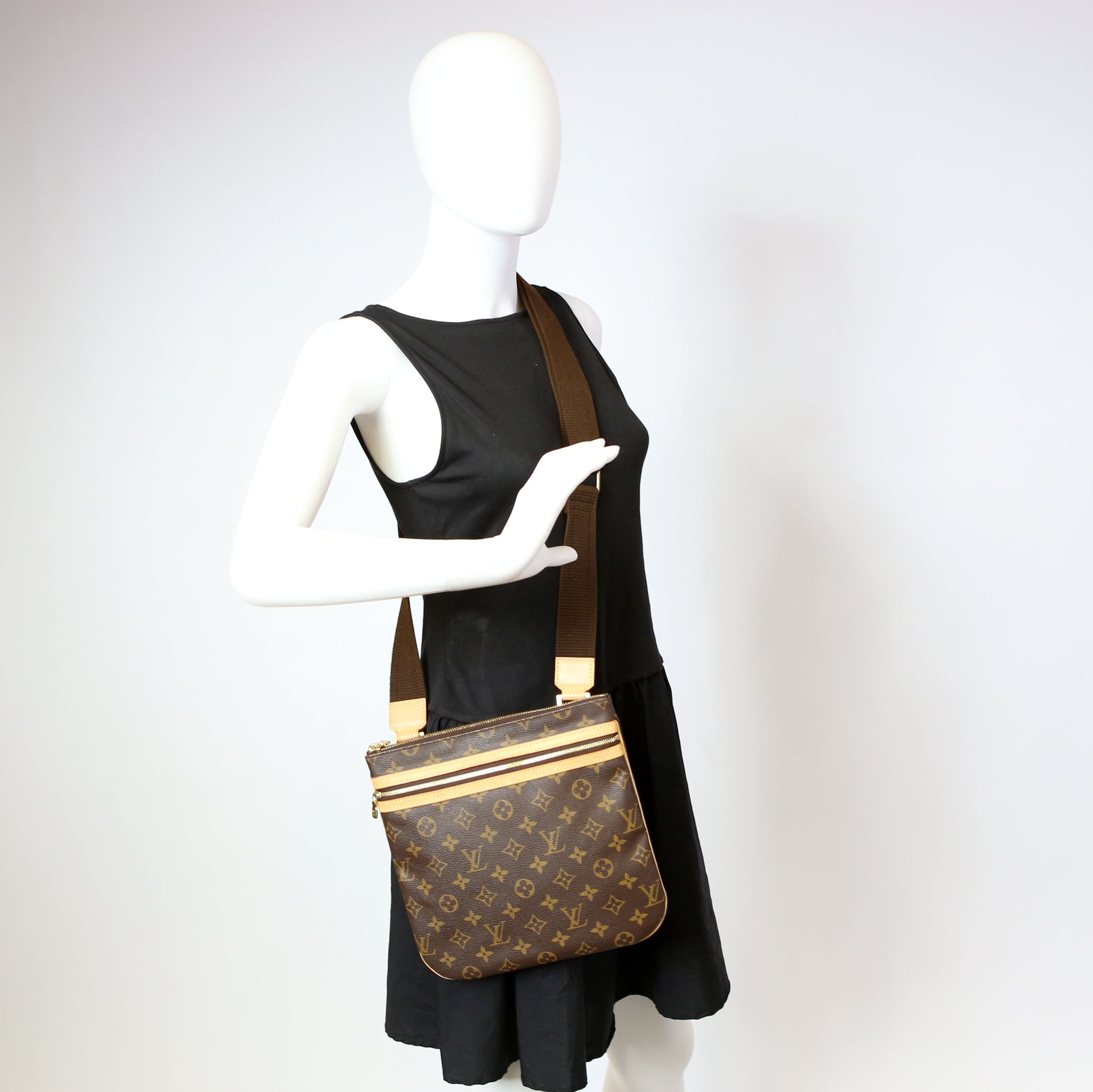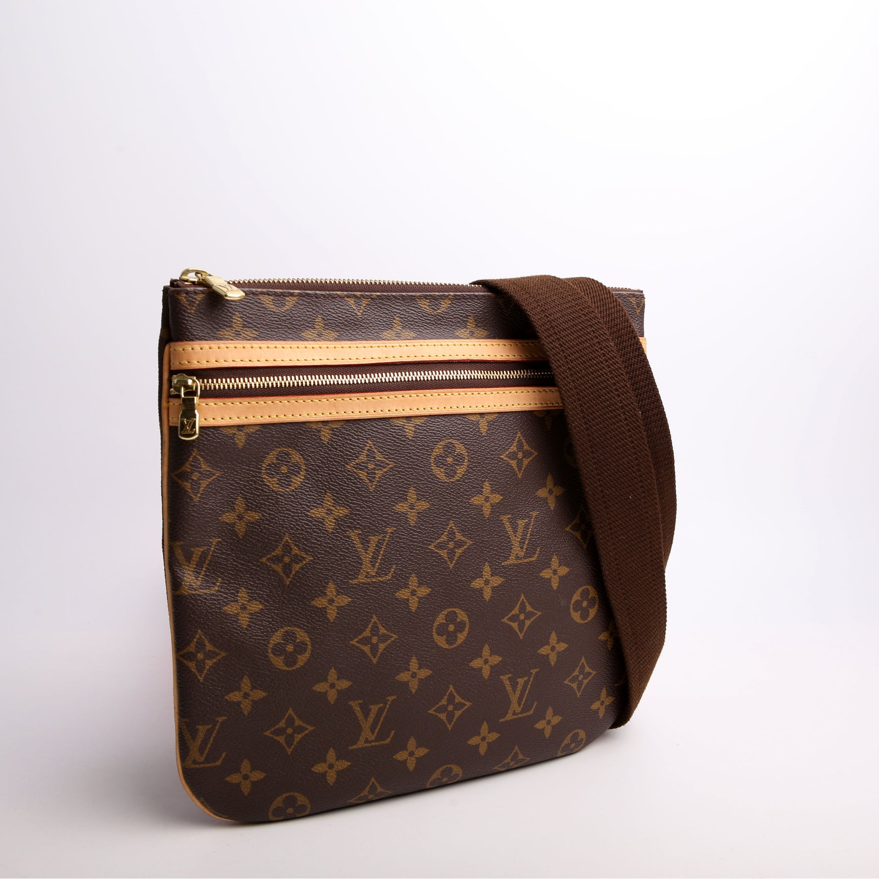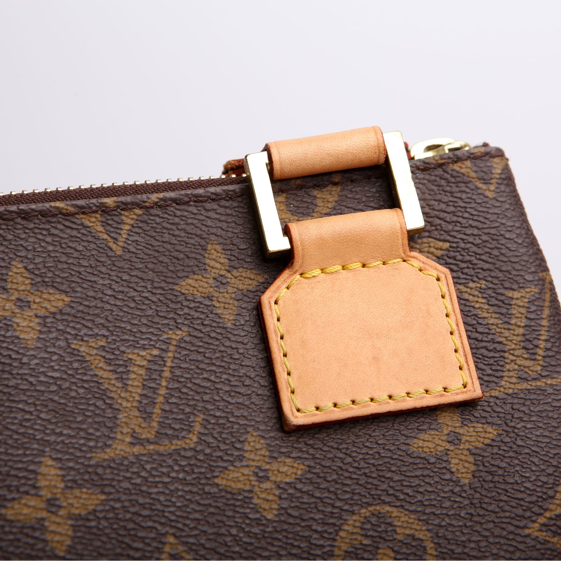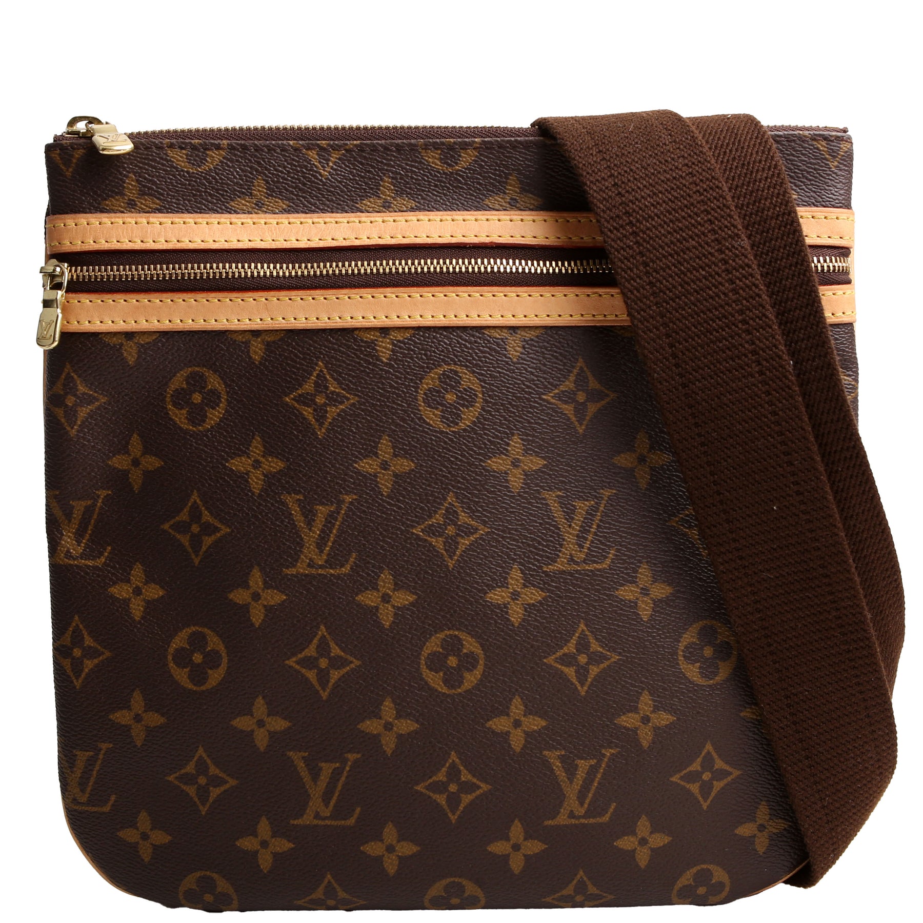 This pre-owned Louis Vuitton Pochette Bosphore is guaranteed 100% authentic. The exterior is in the classic Louis Vuitton Monogram coated canvas.