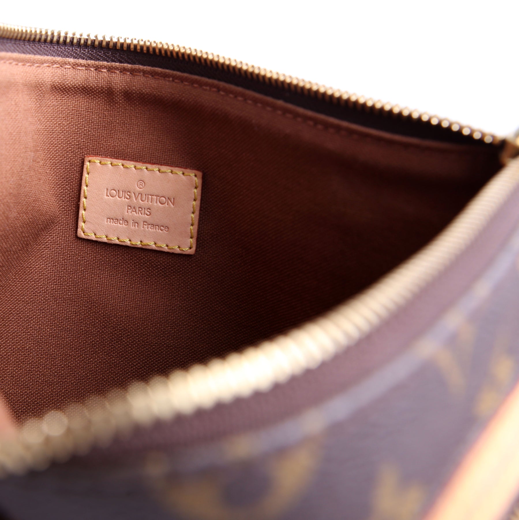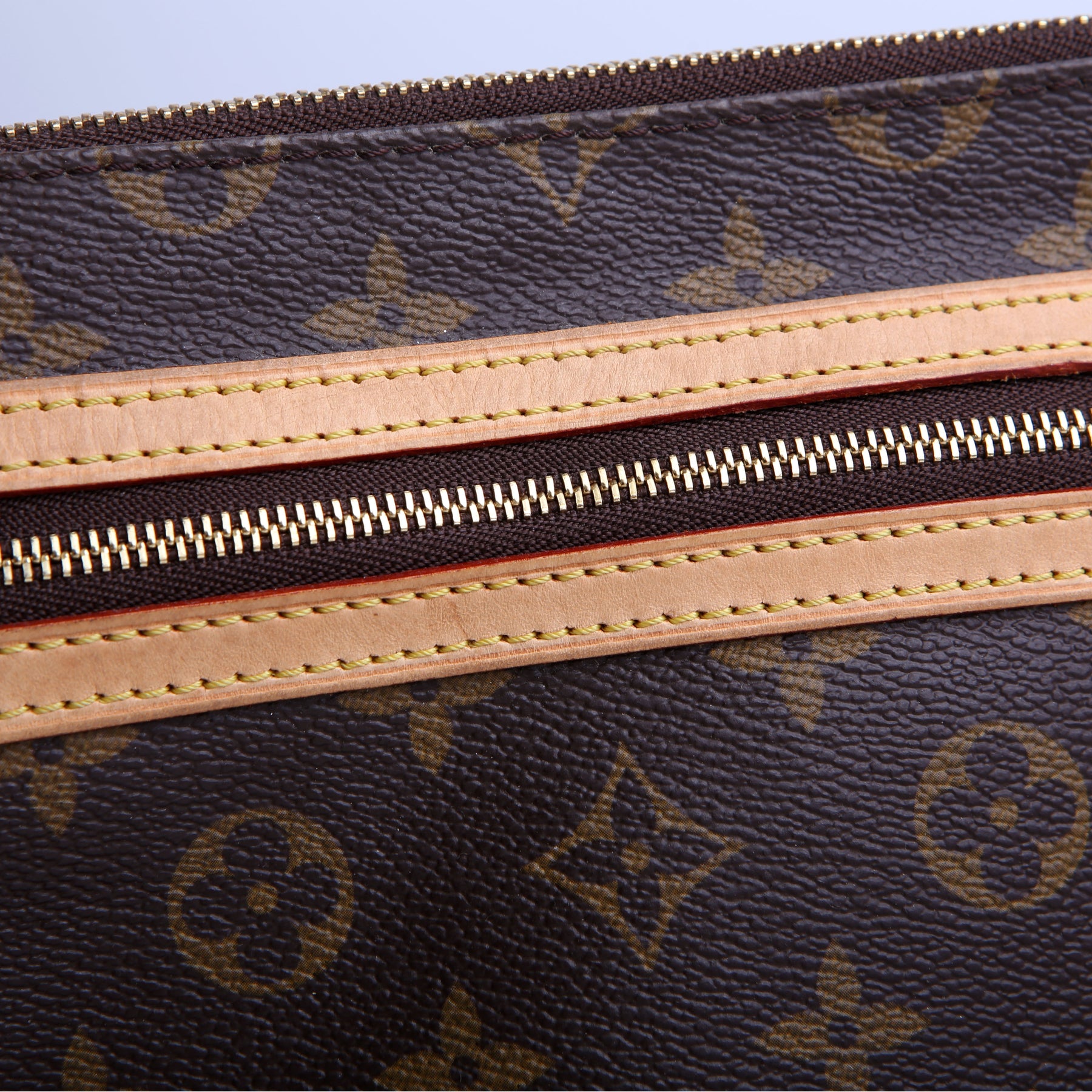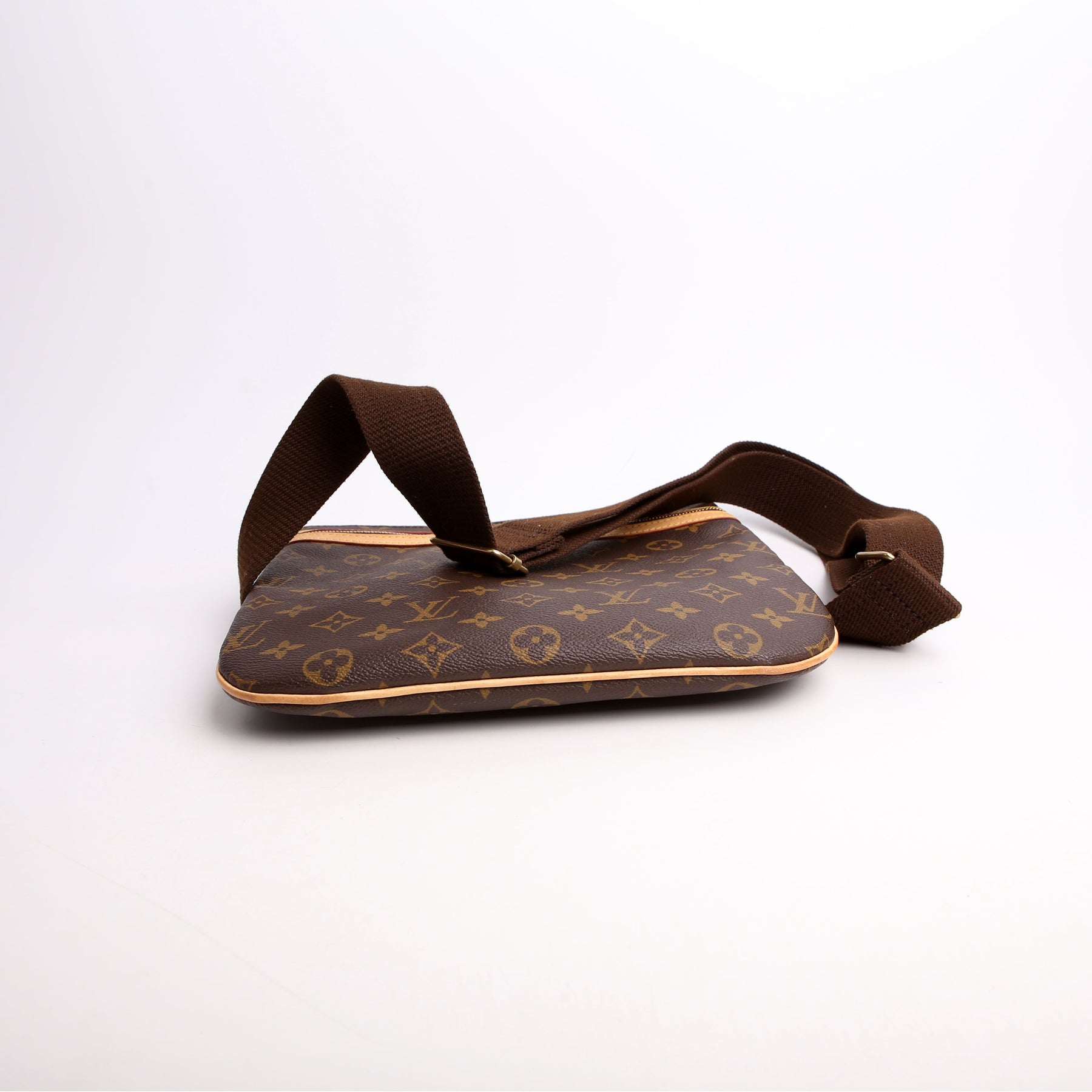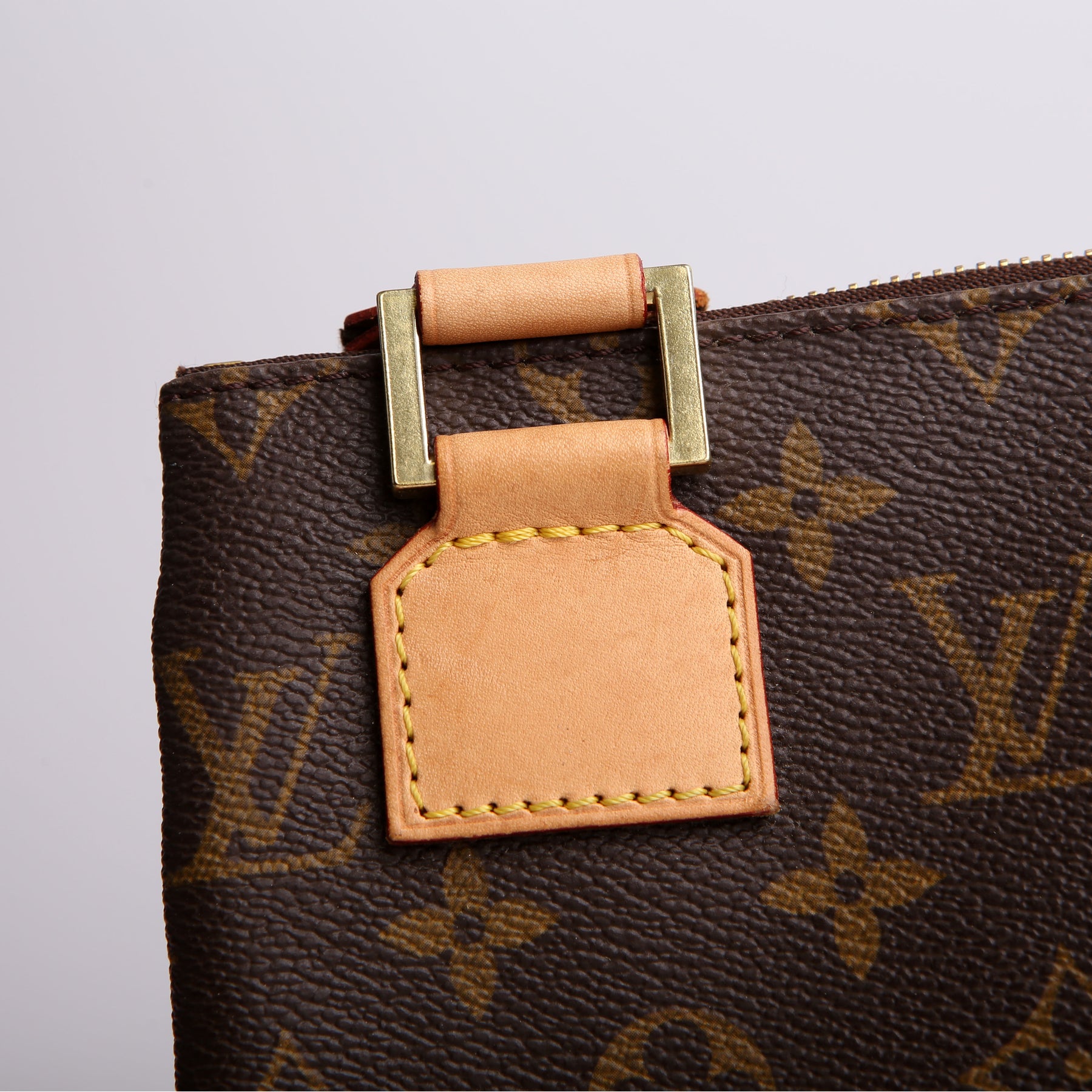 This pre-owned Louis Vuitton Pochette Bosphore is guaranteed 100% authentic. The exterior is in the classic Louis Vuitton Monogram coated canvas.