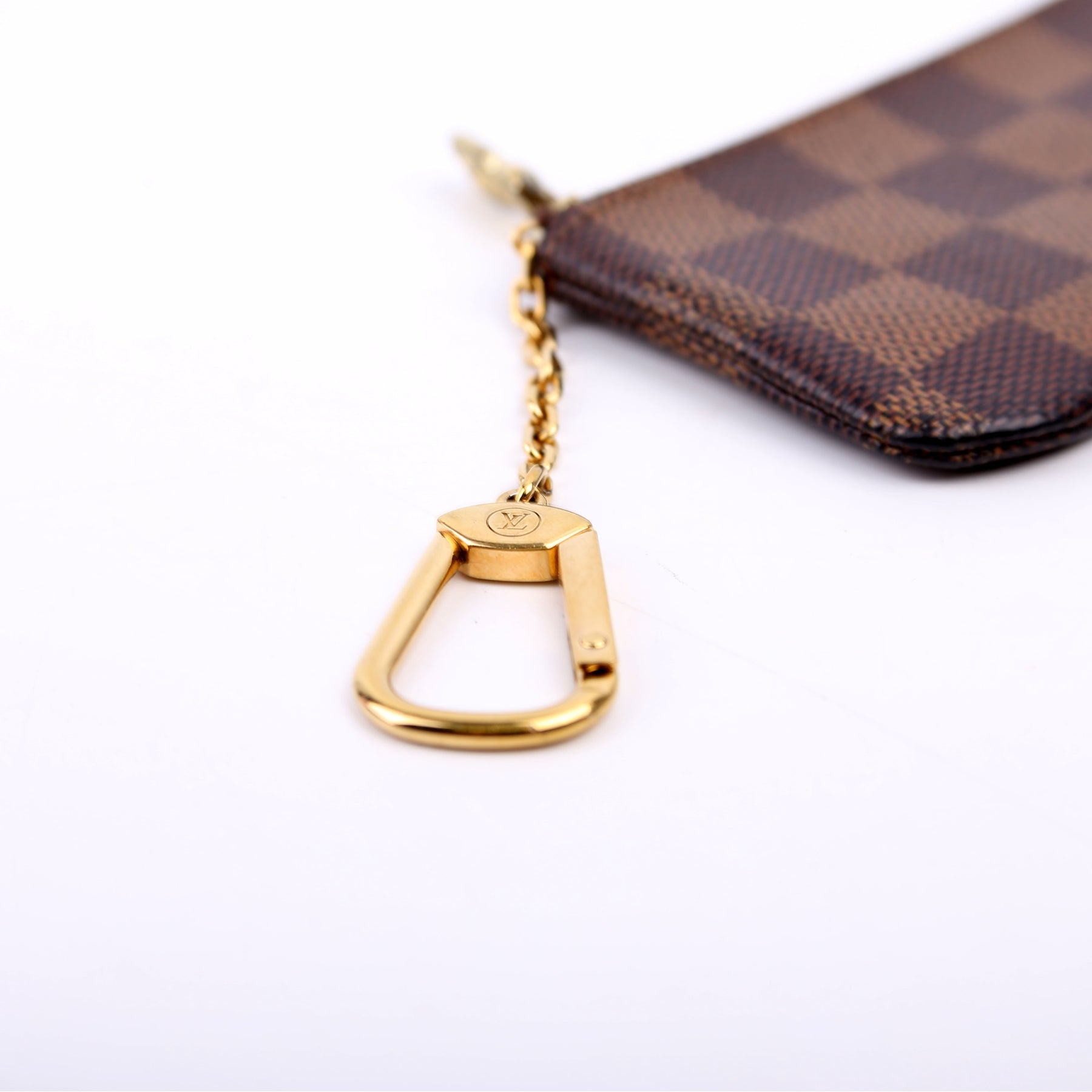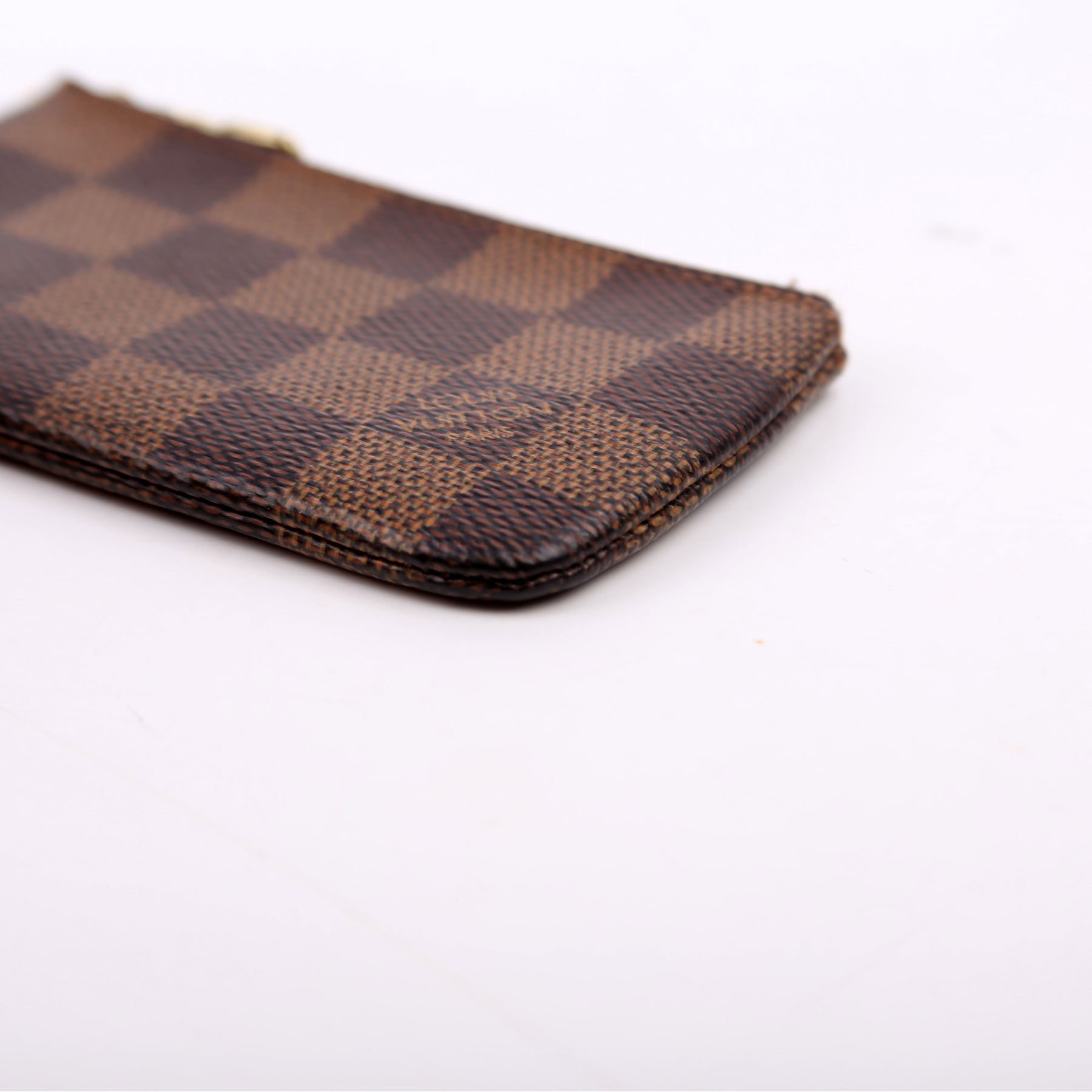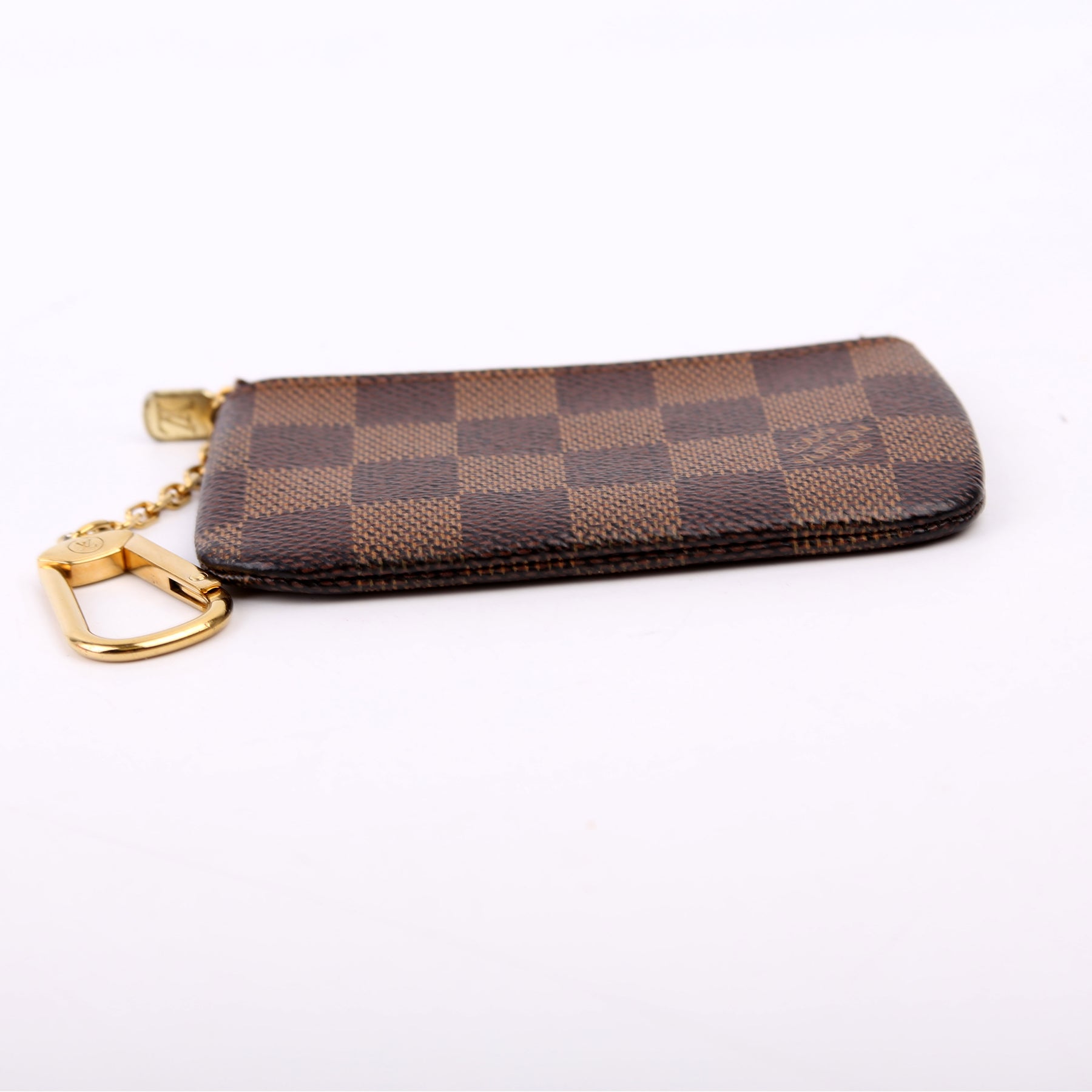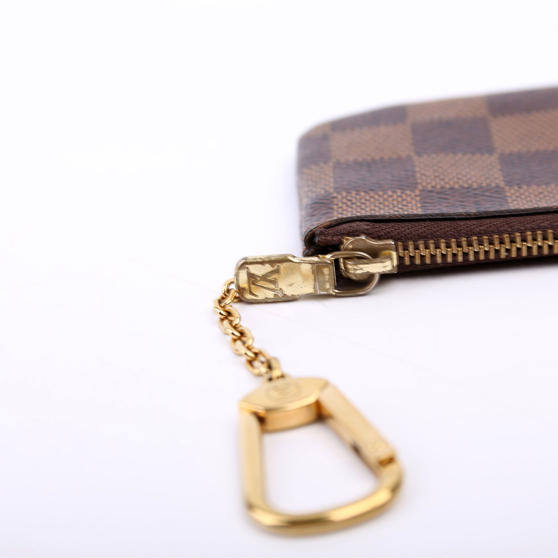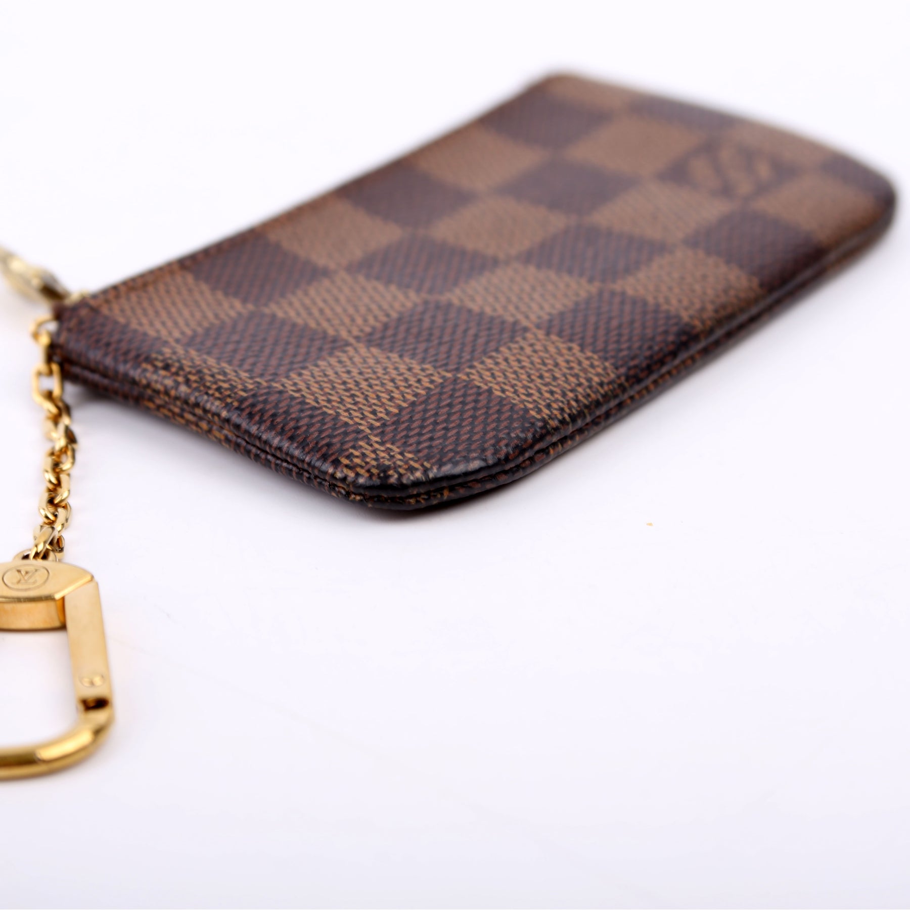 This pre-owned Louis Vuitton Pochette Cles is guaranteed 100% authentic. The exterior is in the classic Louis Vuitton Damier Ebene coated canvas.