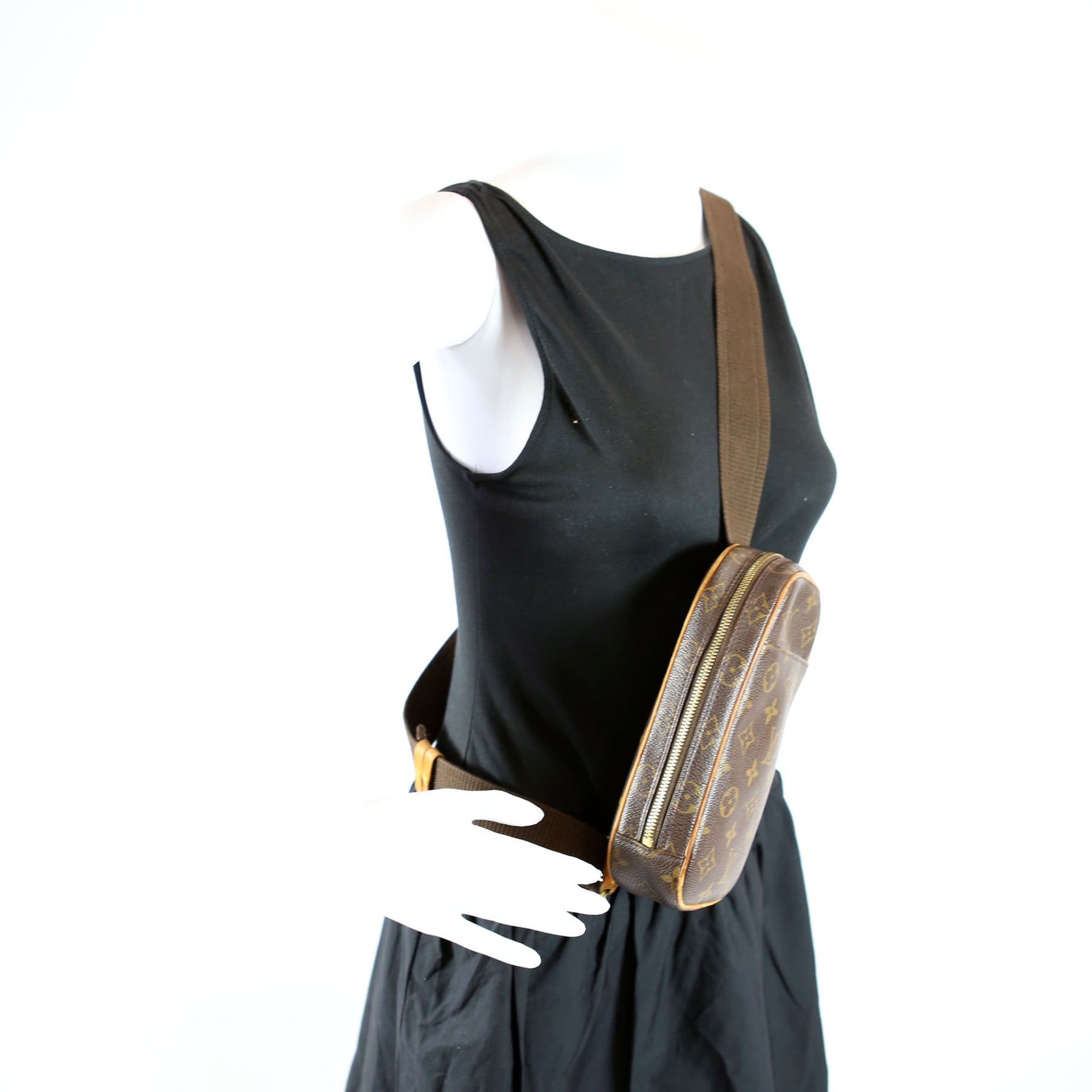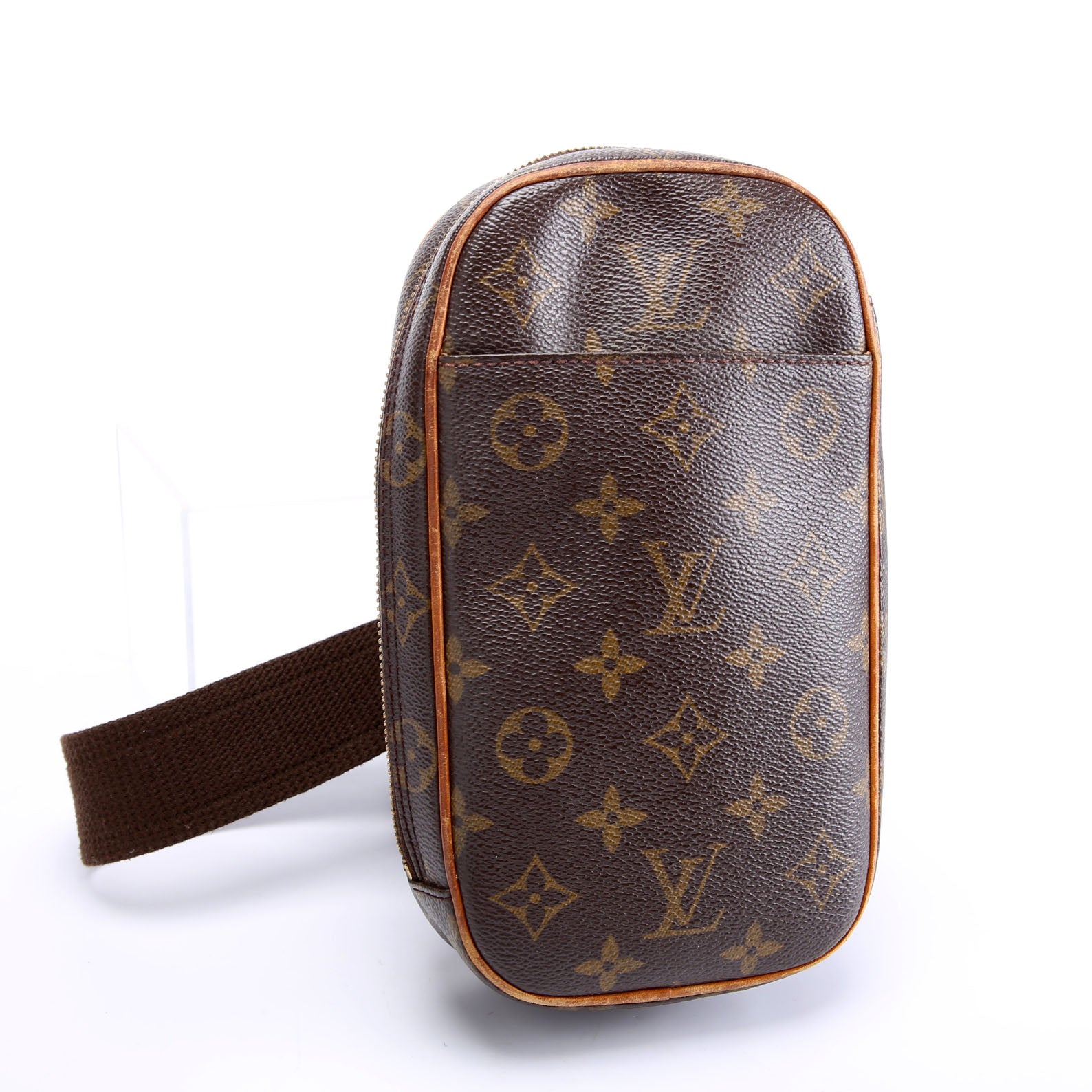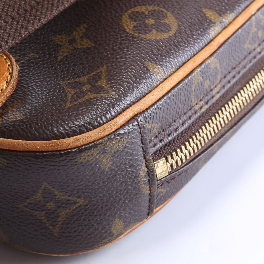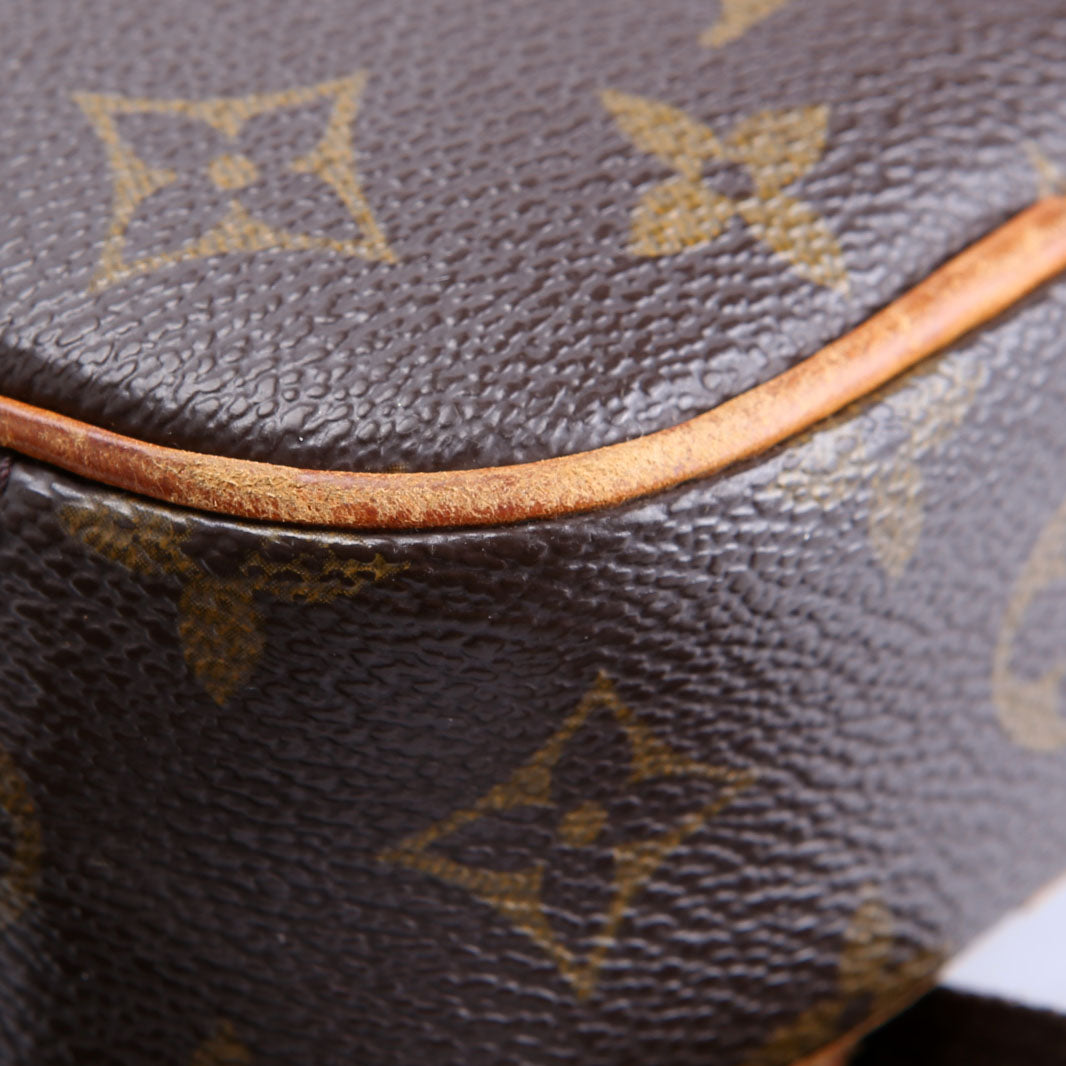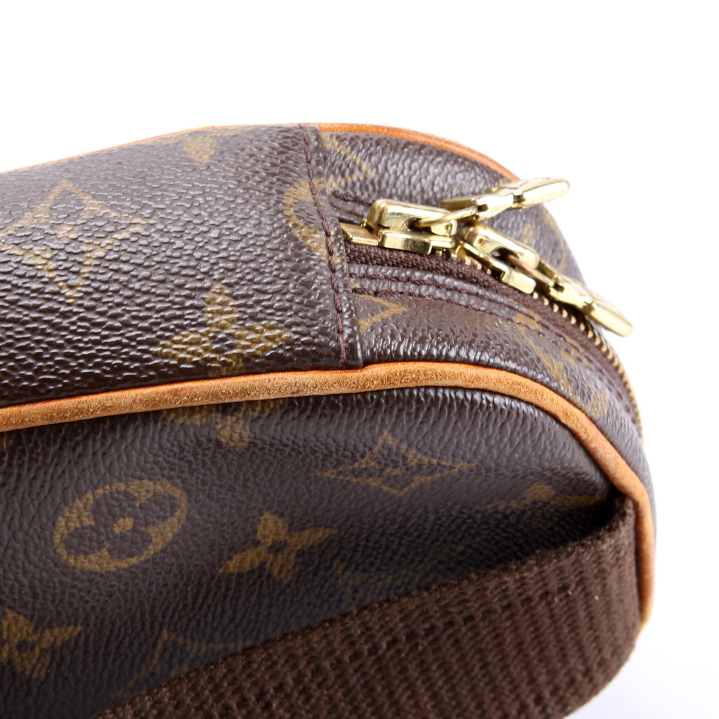 This pre-owned Louis Vuitton Pochette Gange is guaranteed 100% authentic. The exterior is in the classic Louis Vuitton Monogram coated canvas.