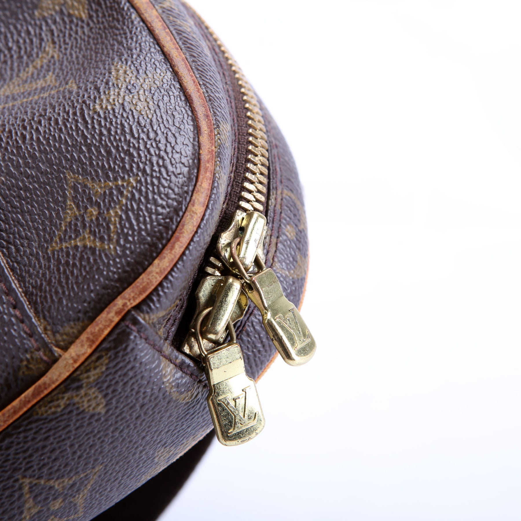 Hardware: The zipper operates properly and shows minor wear and discoloration.