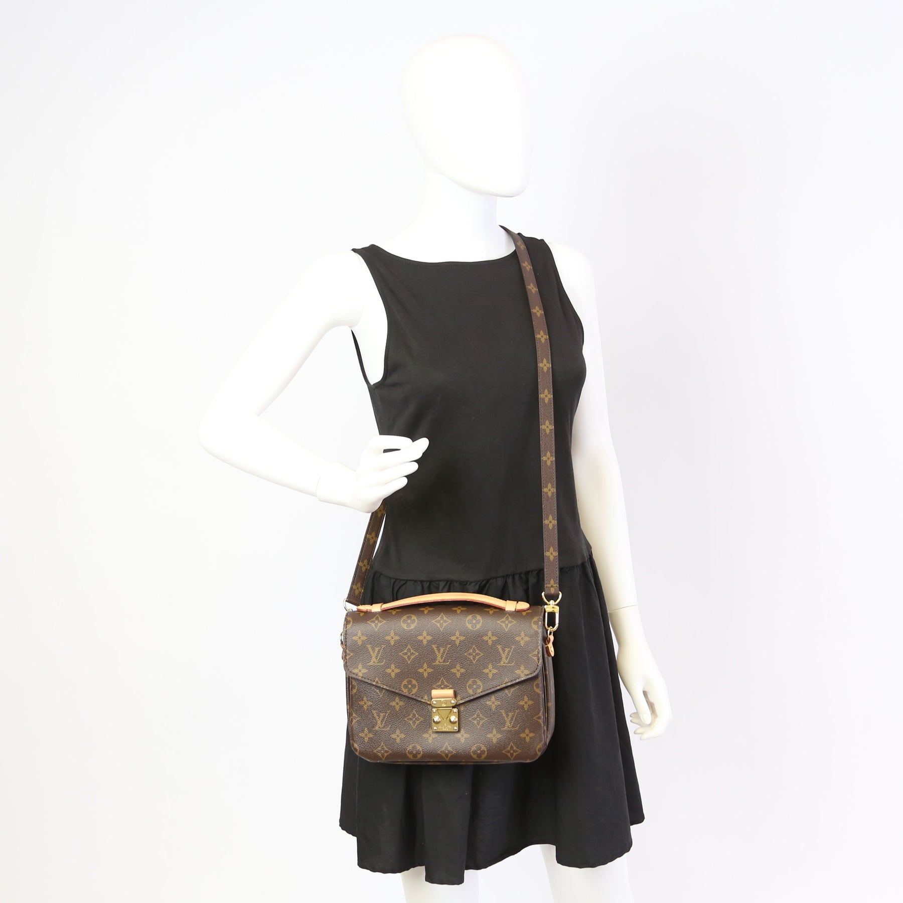 This pre-owned Louis Vuitton Pochette Metis is guaranteed 100% authentic. The exterior is in the classic Louis Vuitton Monogram coated canvas.